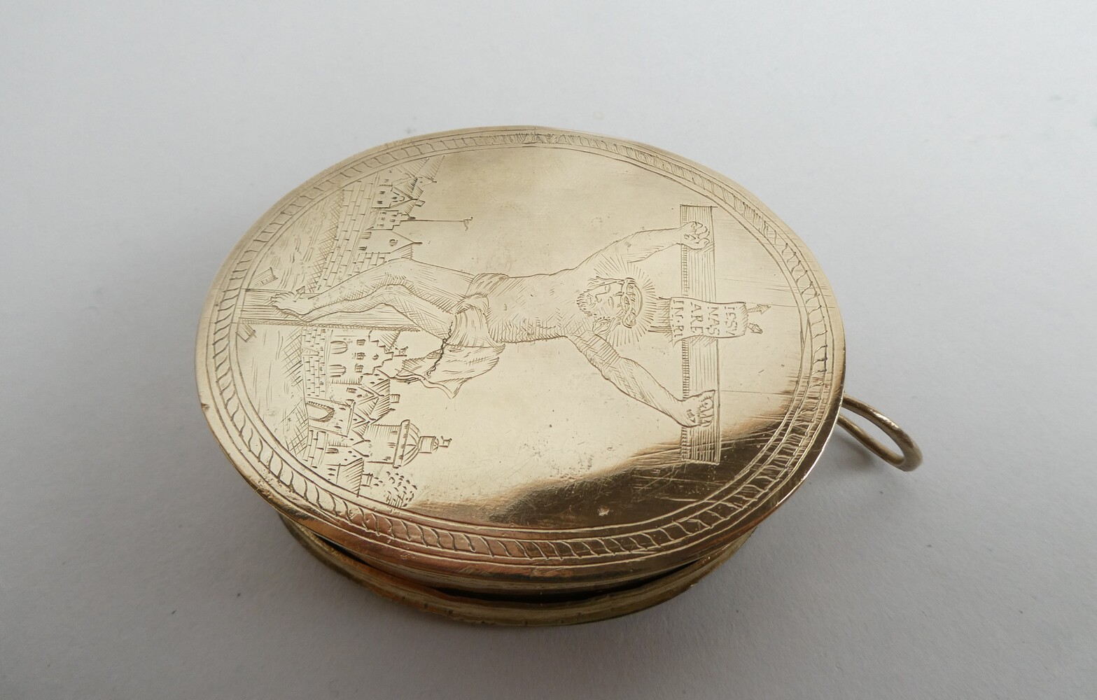 18de eeuws dubbelzijdig koperen reliekdoosje ( leeg ) met mooi graveerwerk.