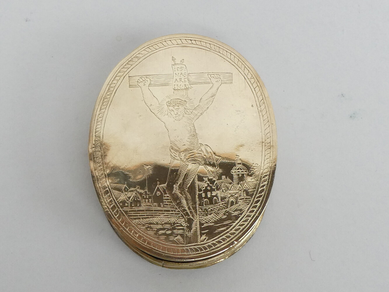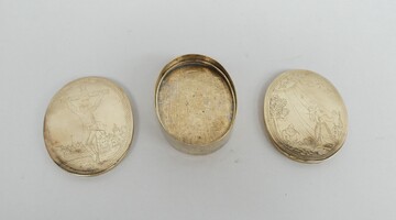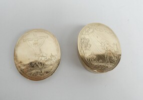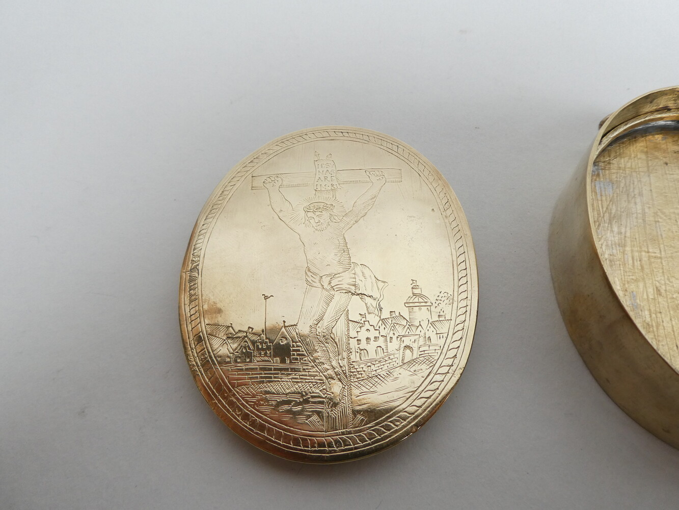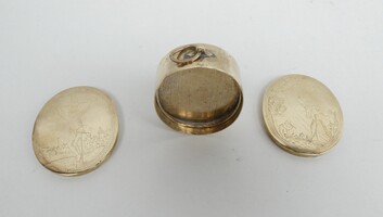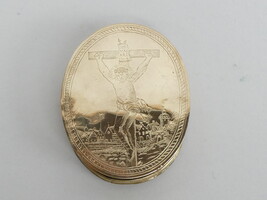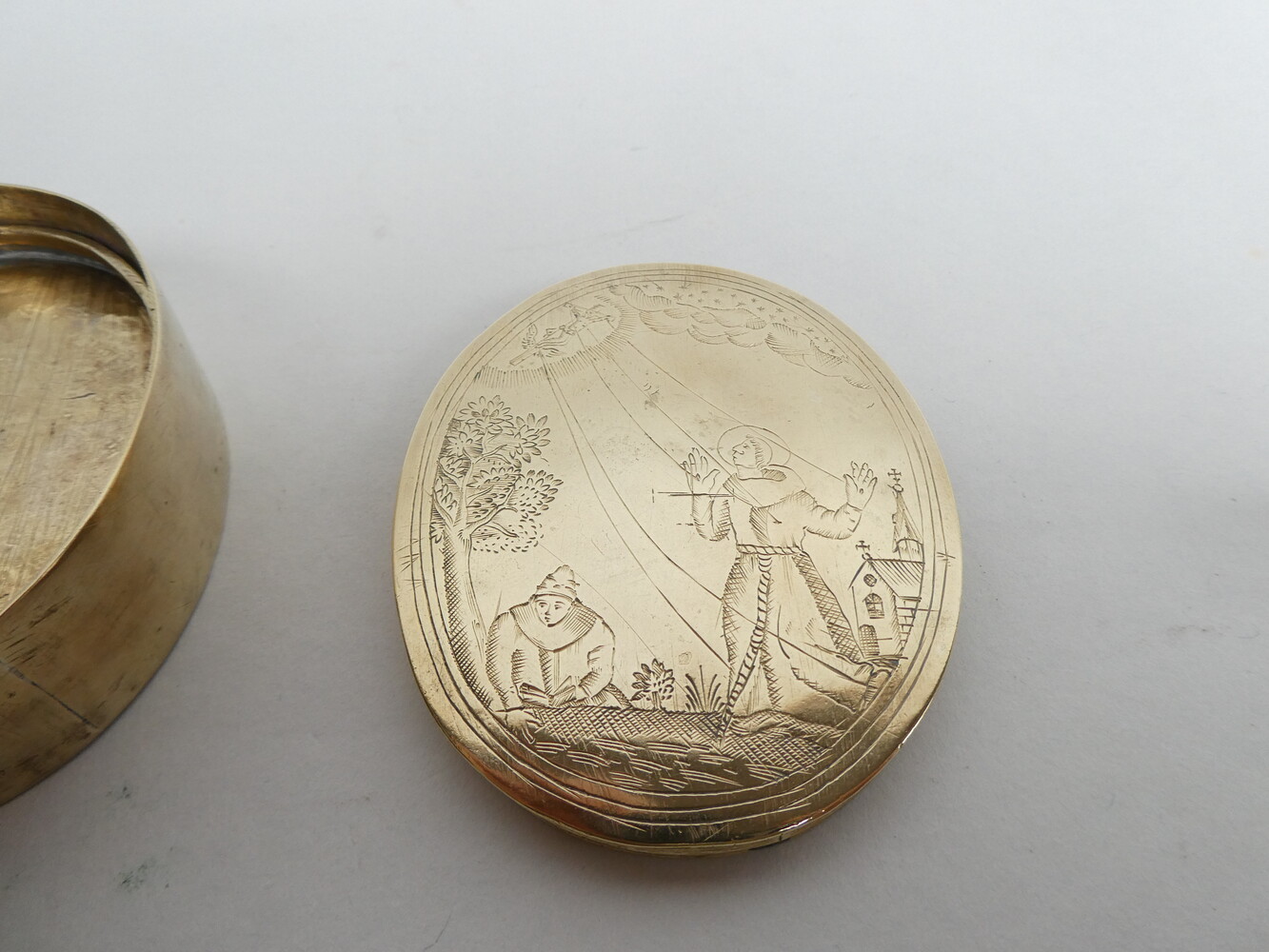 18de eeuws koperen reliekdoosje (leeg) met mooi graveerwerk