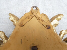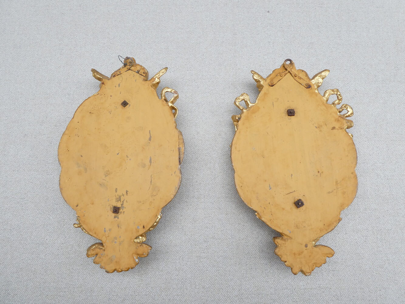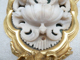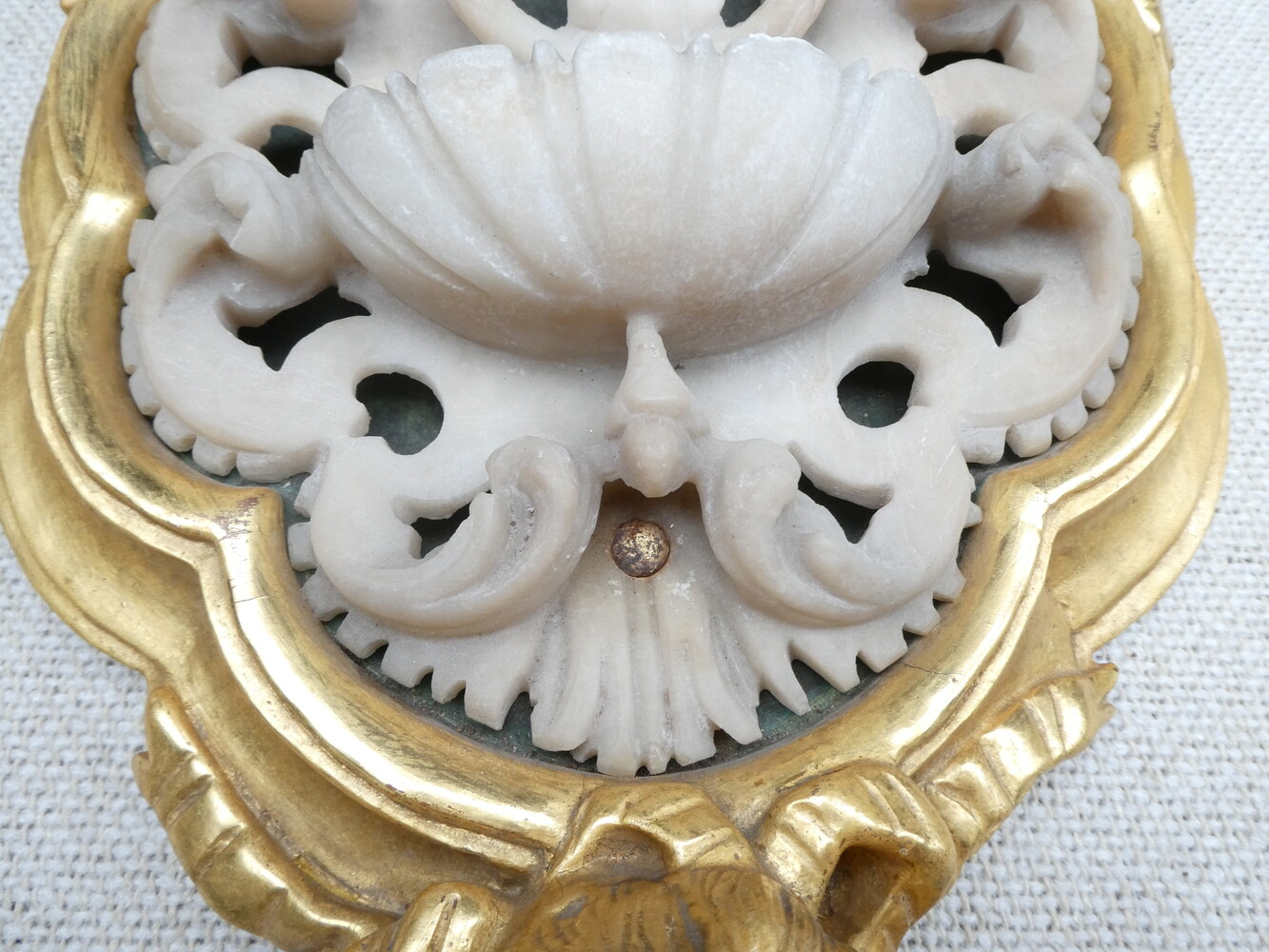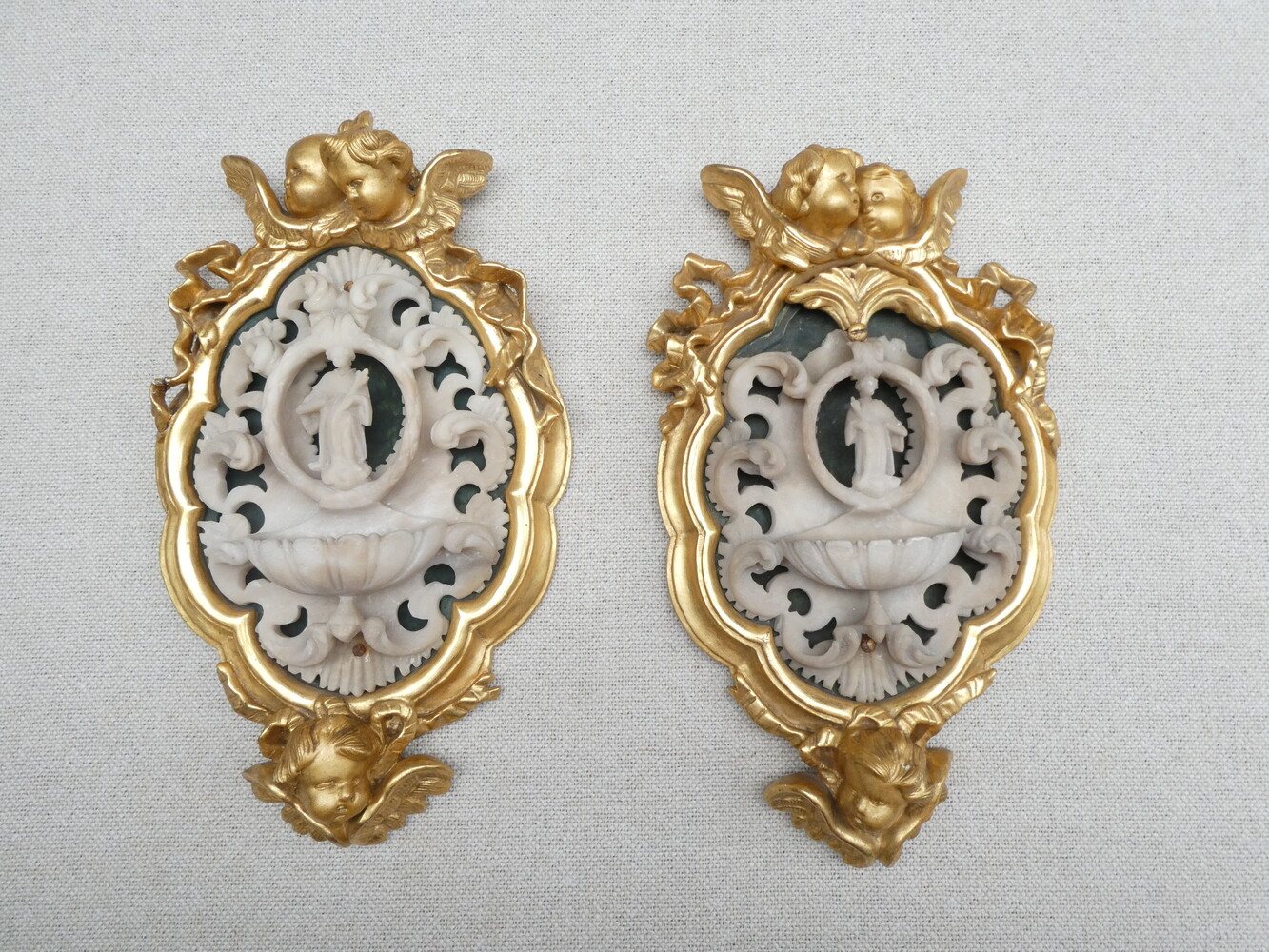 Tweede reeks foto's van de 17de eeuwse albasten wijwatervaten in 18de eeuwse gesculpteerde houten kaders met engelenkopjes.
