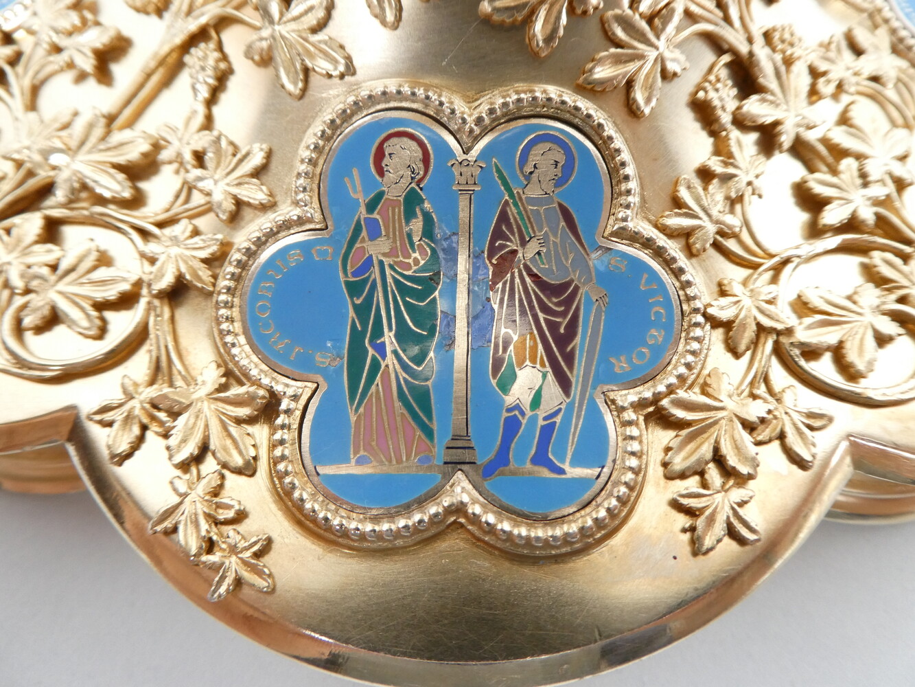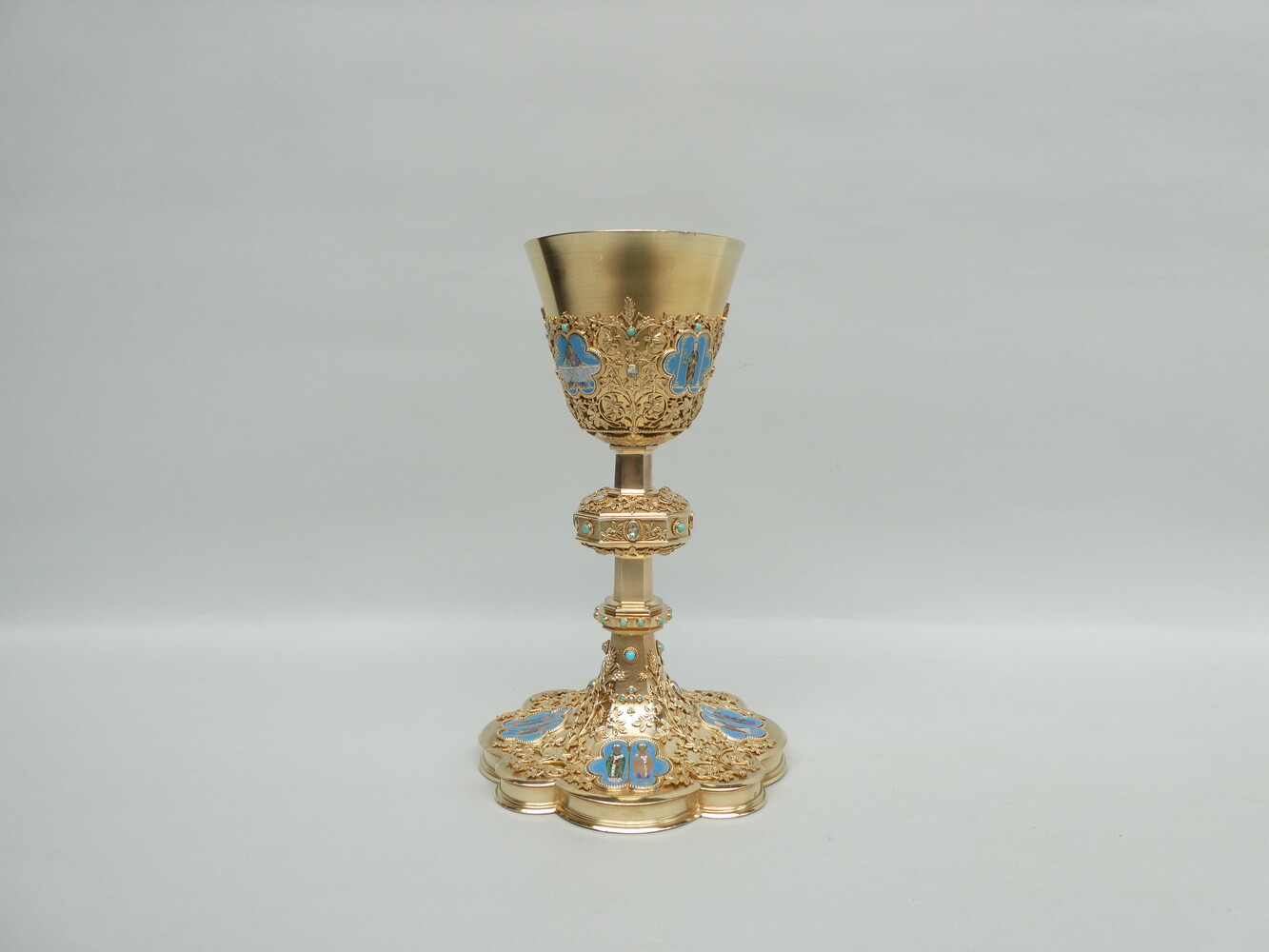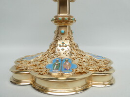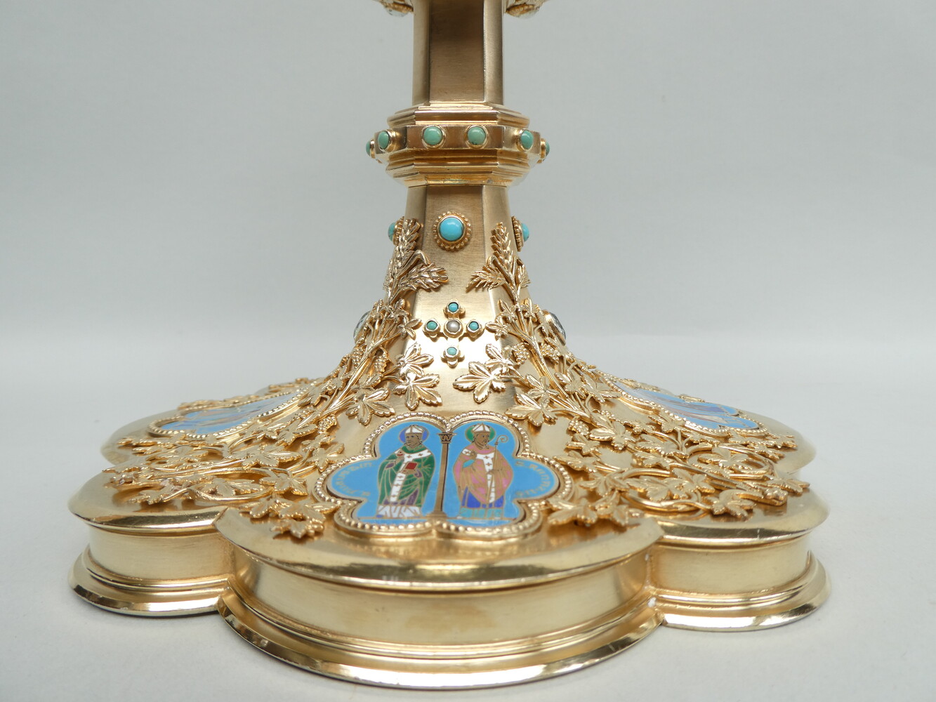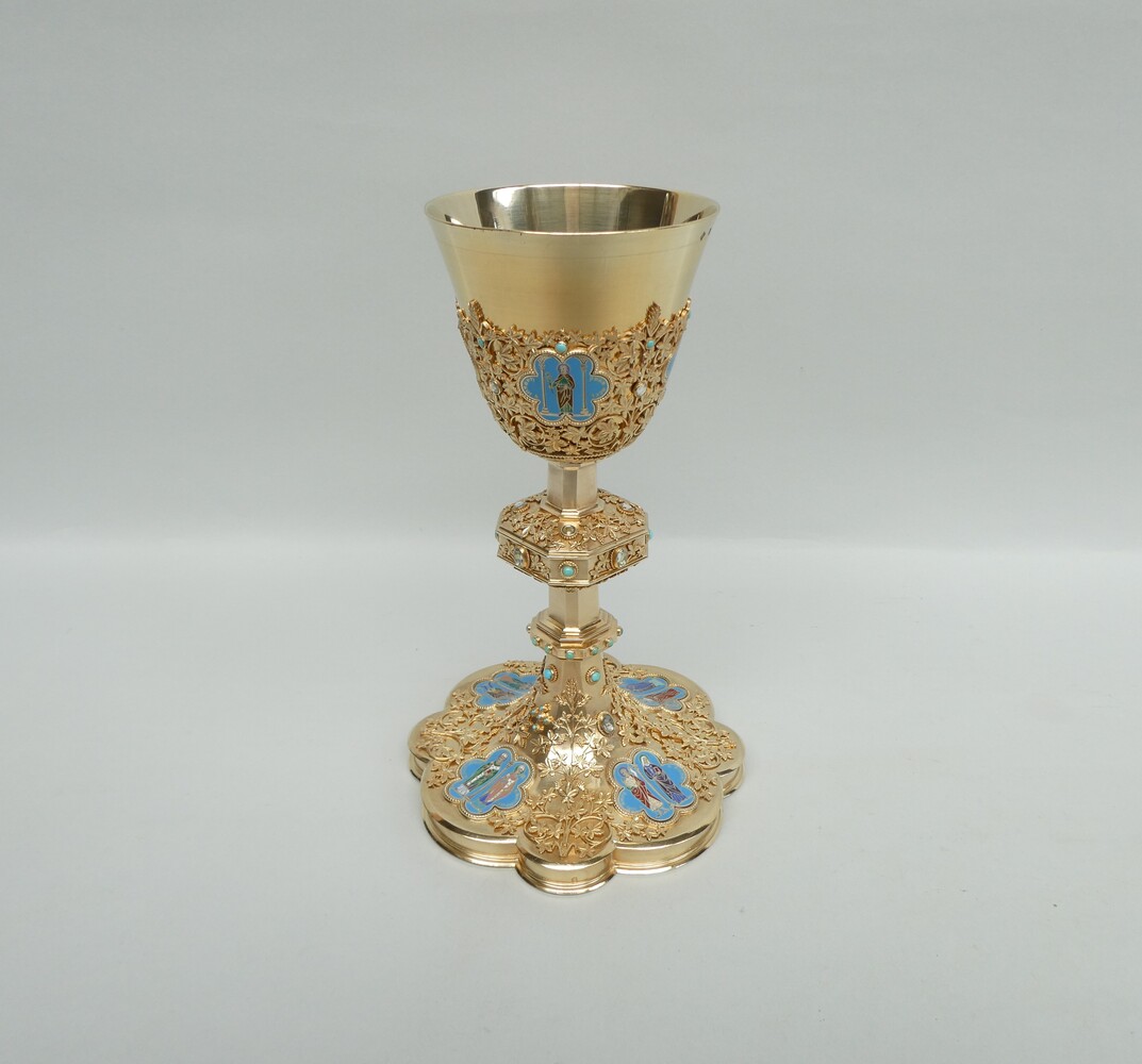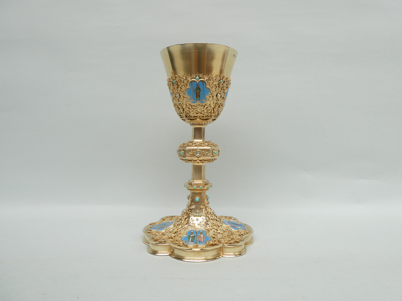 2de reeks foto's van de prachtige neogotieke zilveren kelk met overvloedige émail versiering.