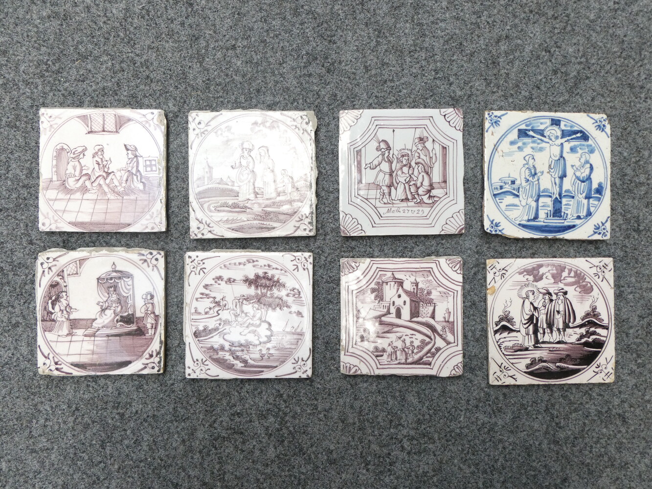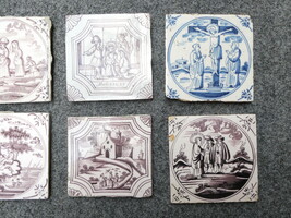 Acht antieke Delftse tegeltjes, religieus en profaan.