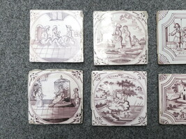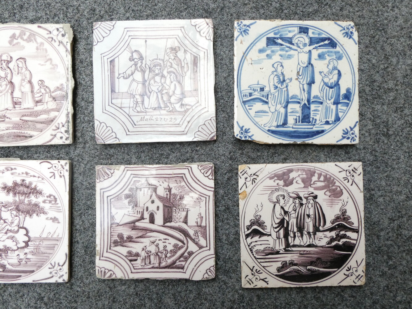Acht antieke Delftse tegeltjes, religieus en profaan