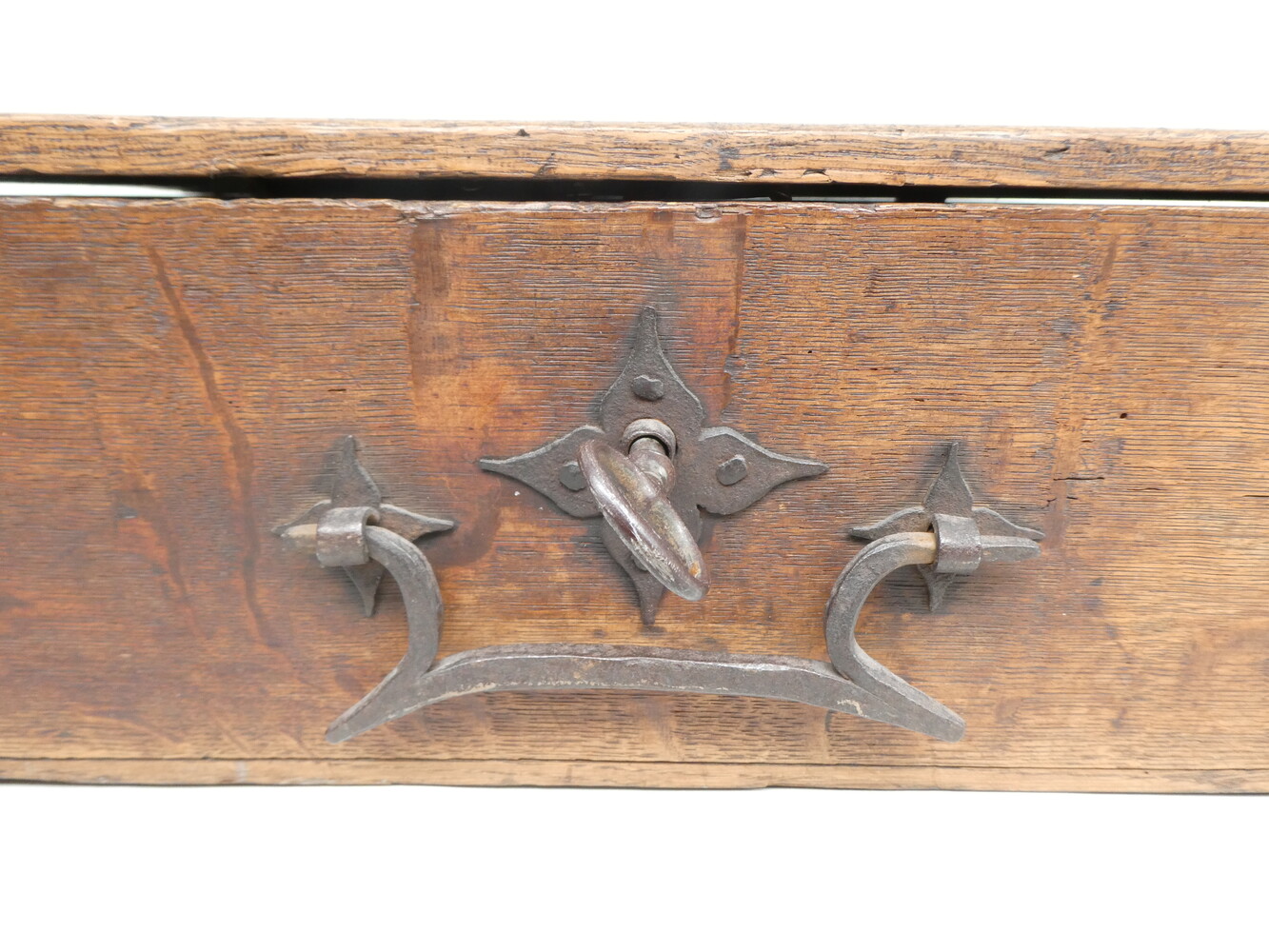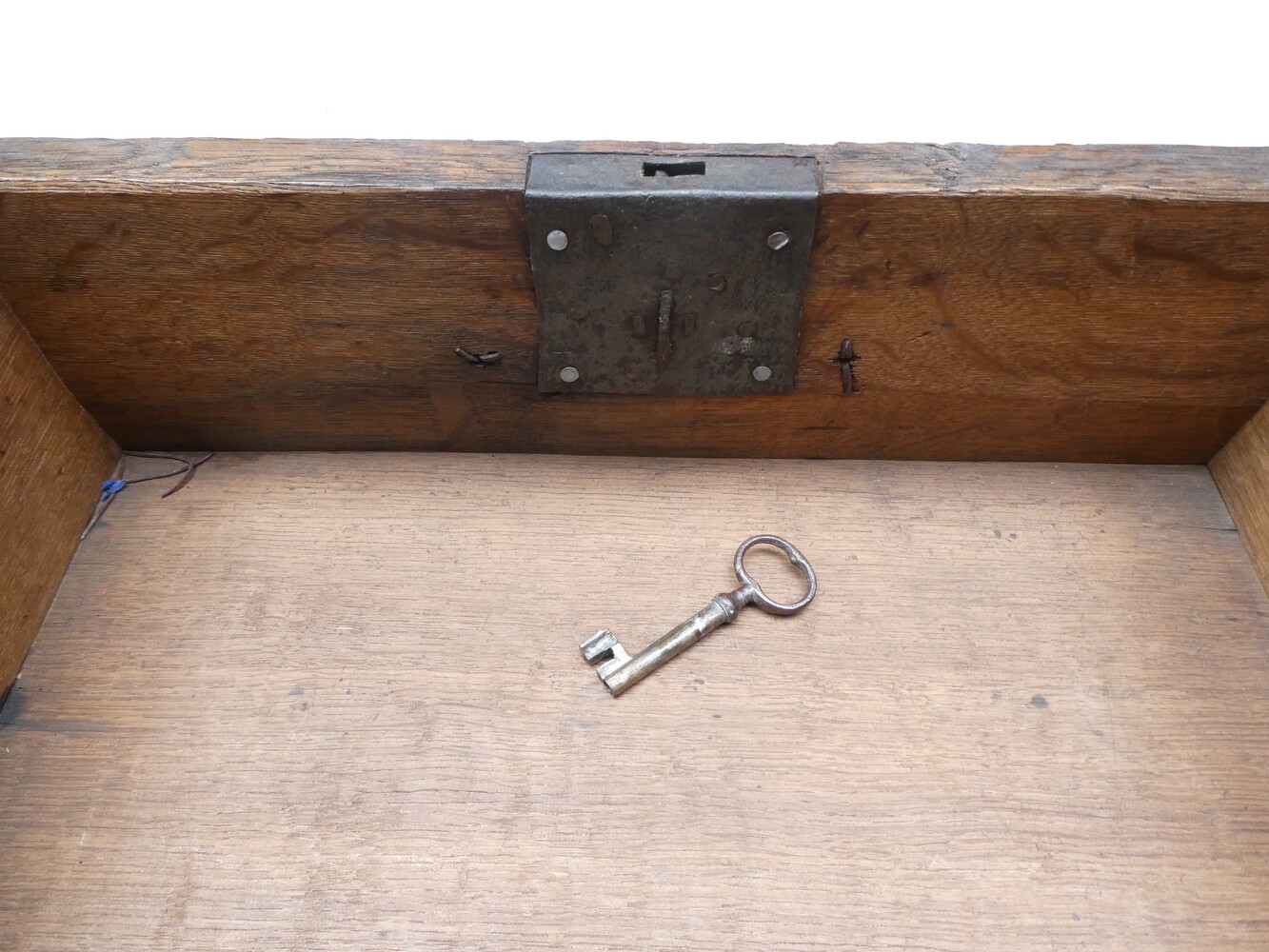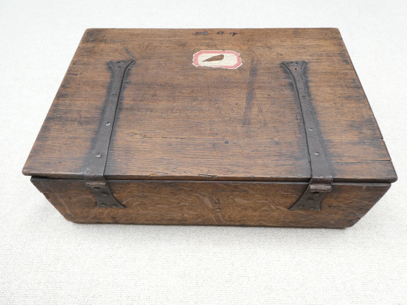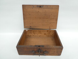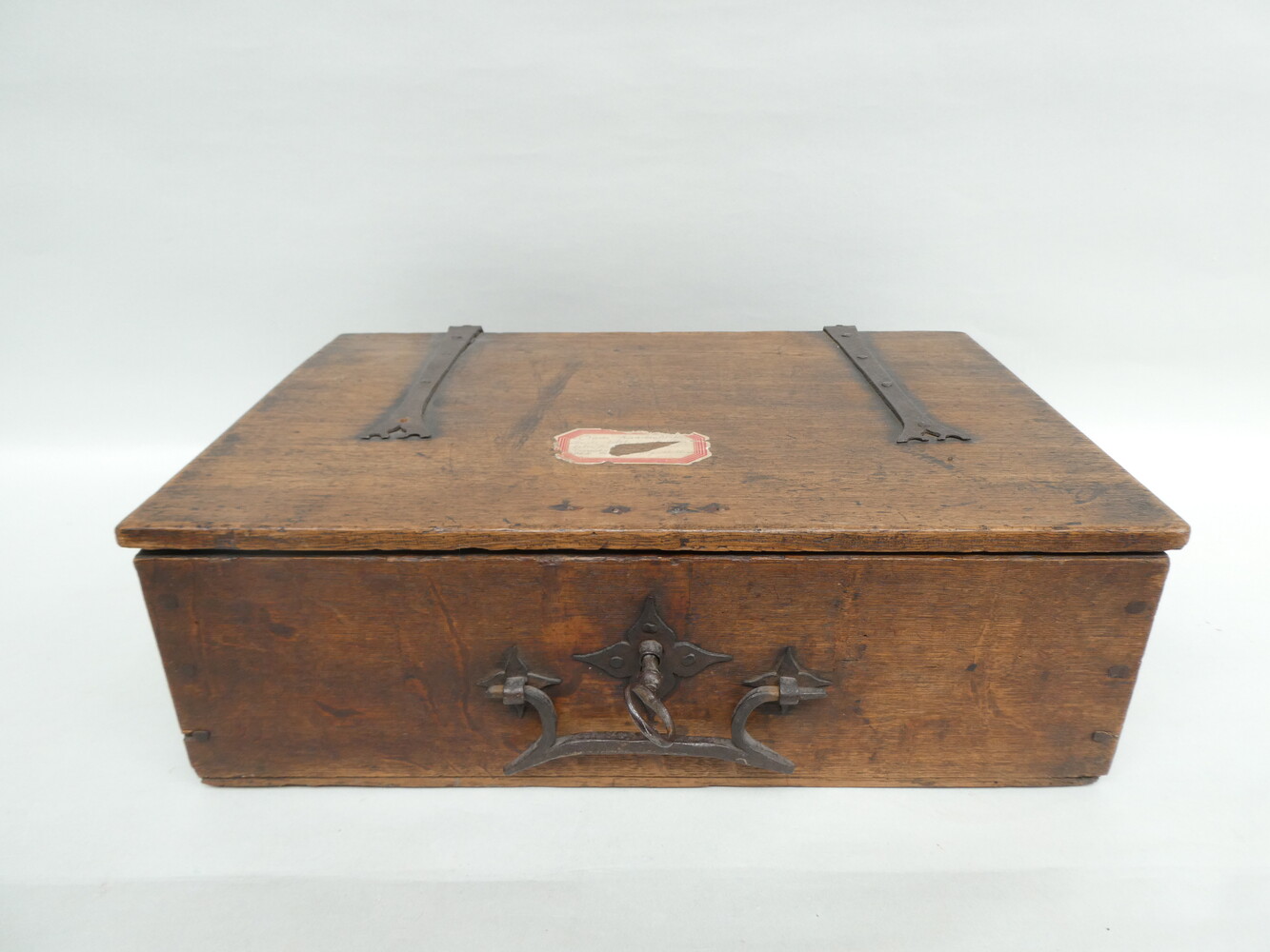 Antiek eiken archiefkistje met smeedijzeren slot, sleutel, scharnieren en handvat. 47cm x 32cm - hoogte 15cm.