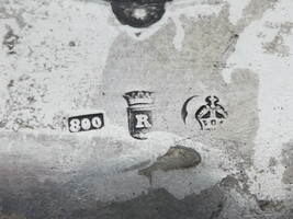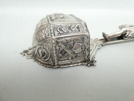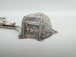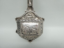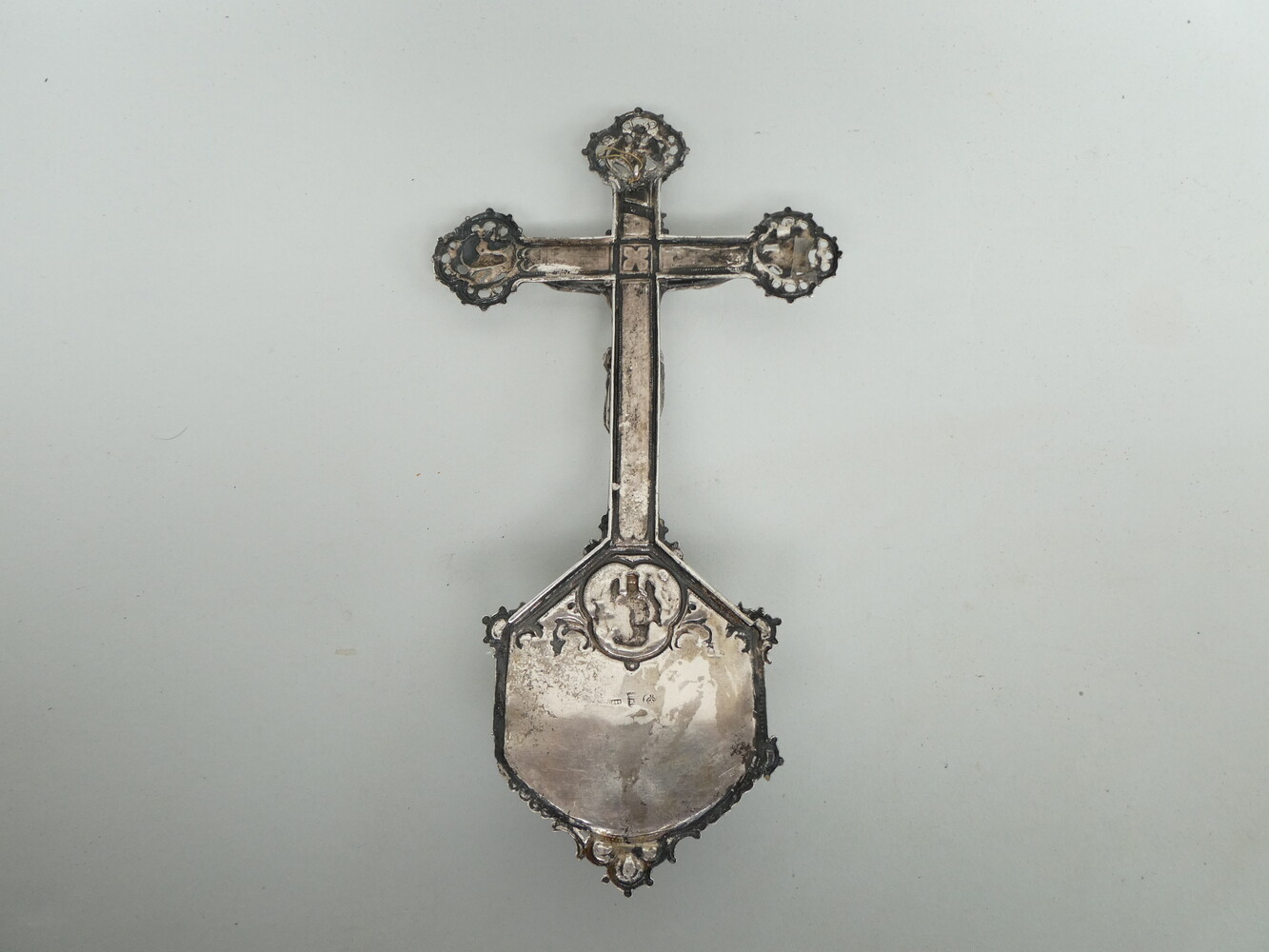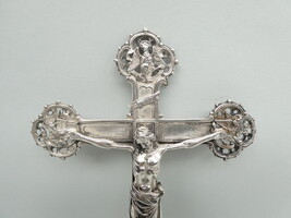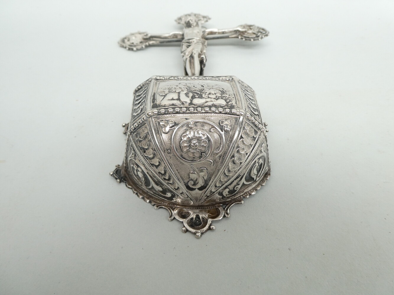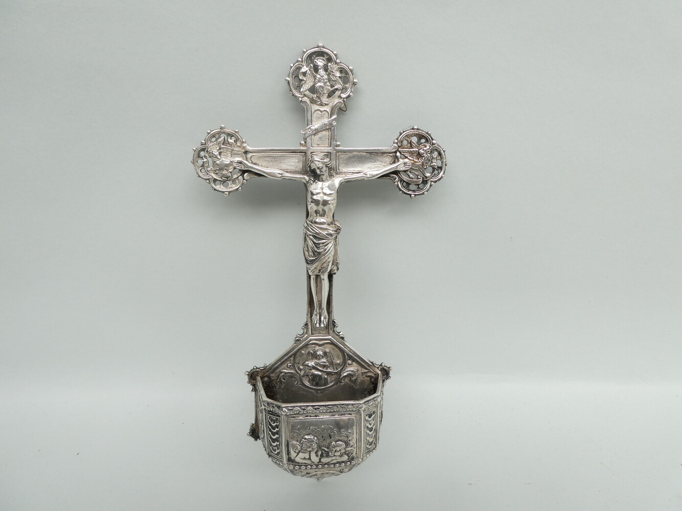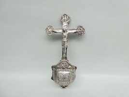 Antiek zilveren kruiswijwatervat met op de kruisarmen de symbolen van de vier evangelisten. 14cm x 26cm - gewicht 190gram.