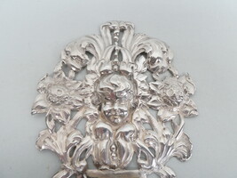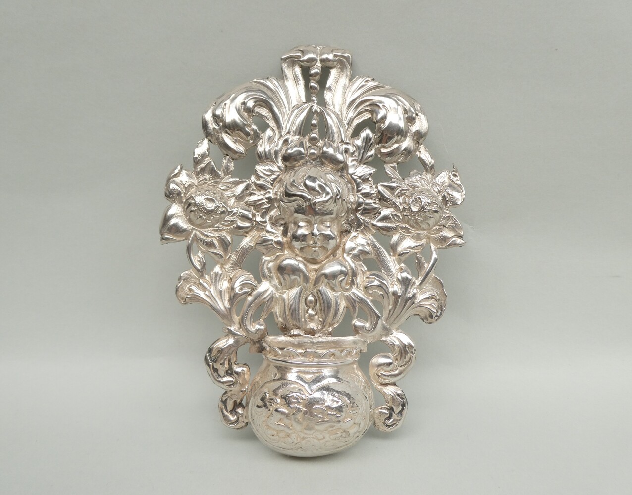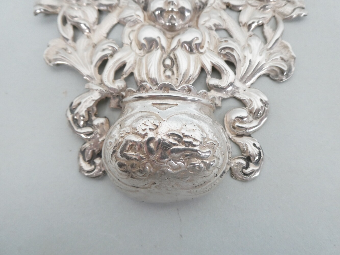 Antiek zilveren wijwatervat met engelenkopje.