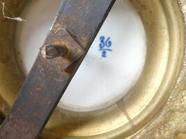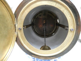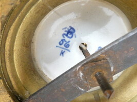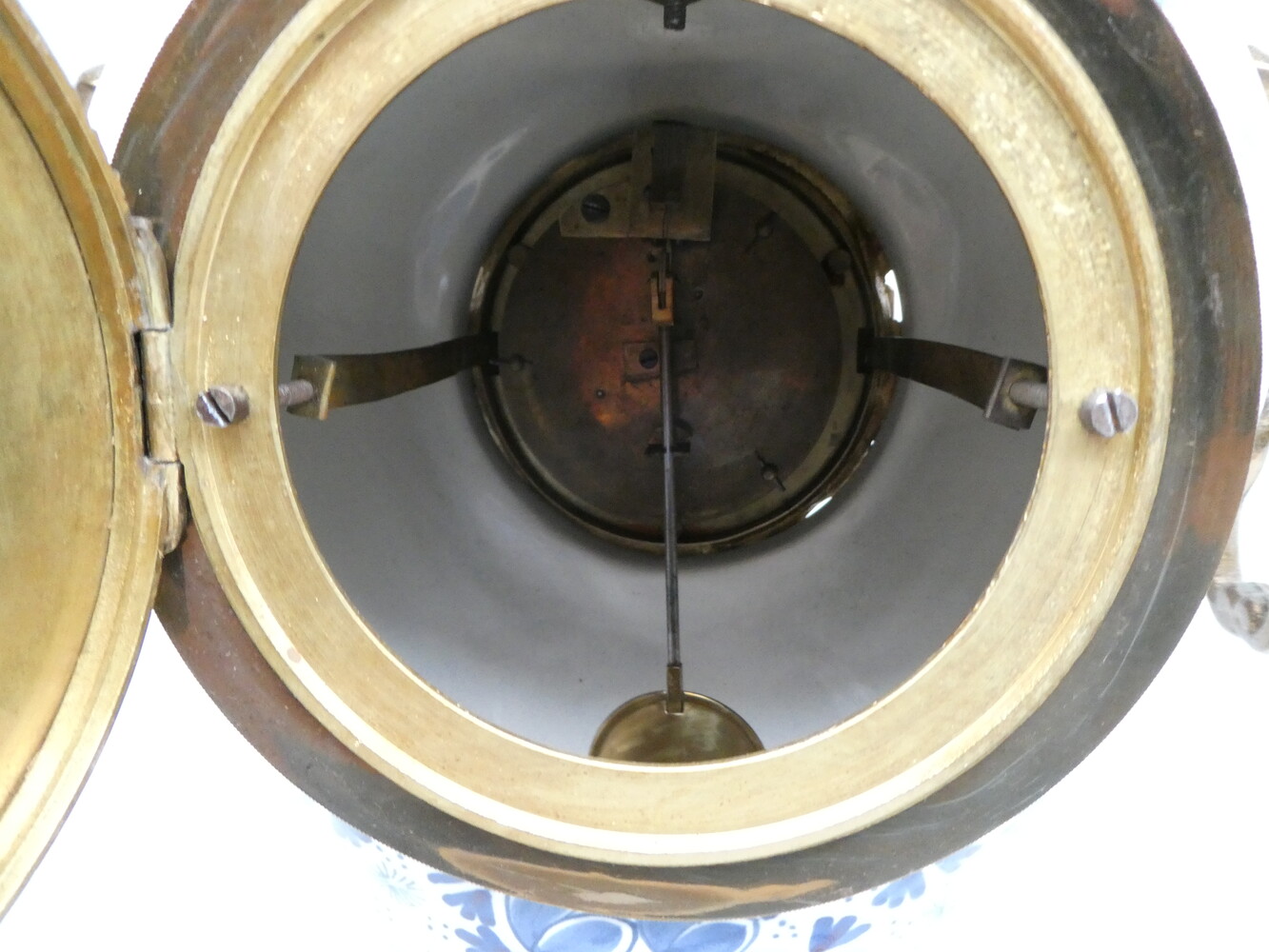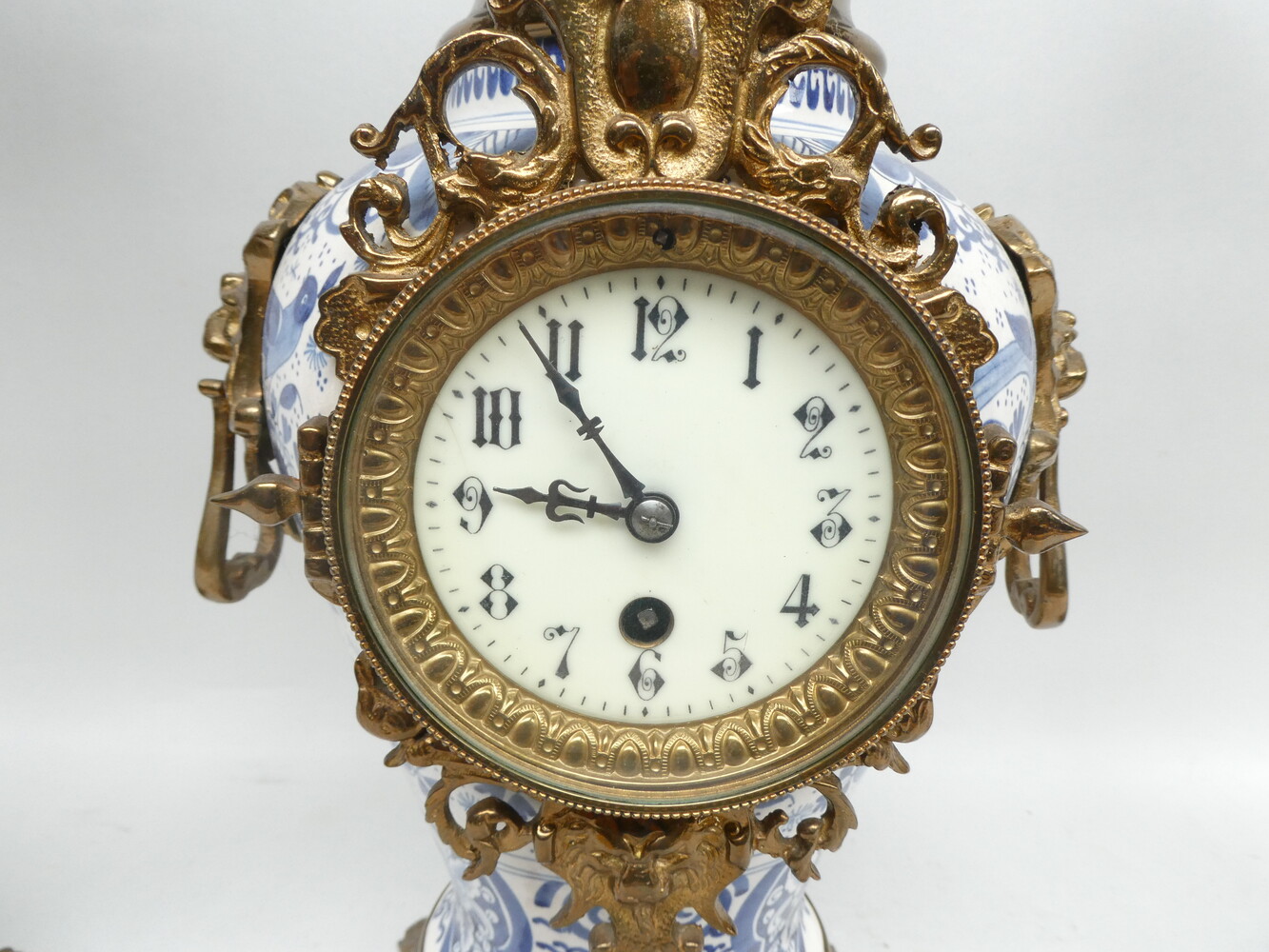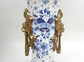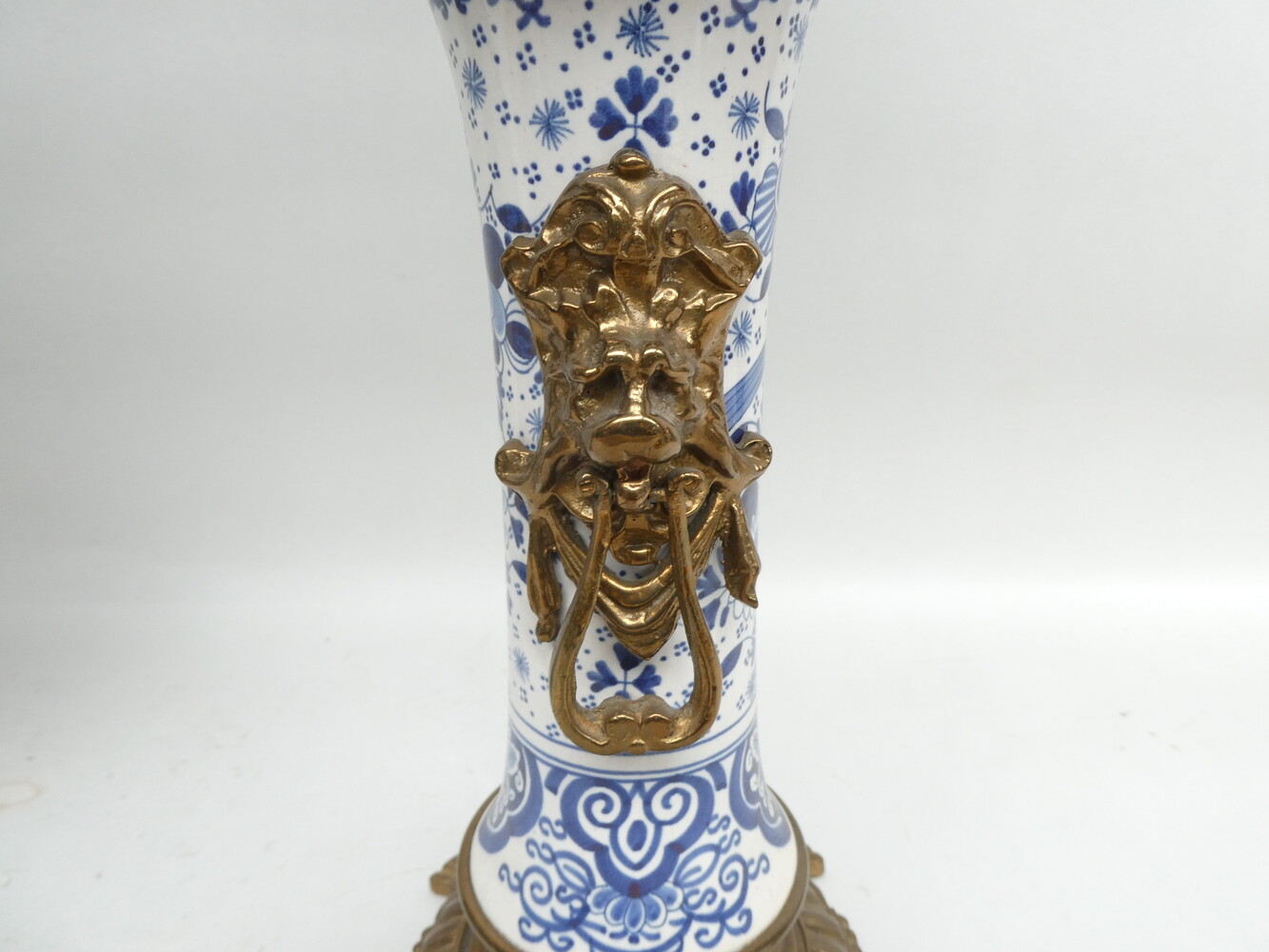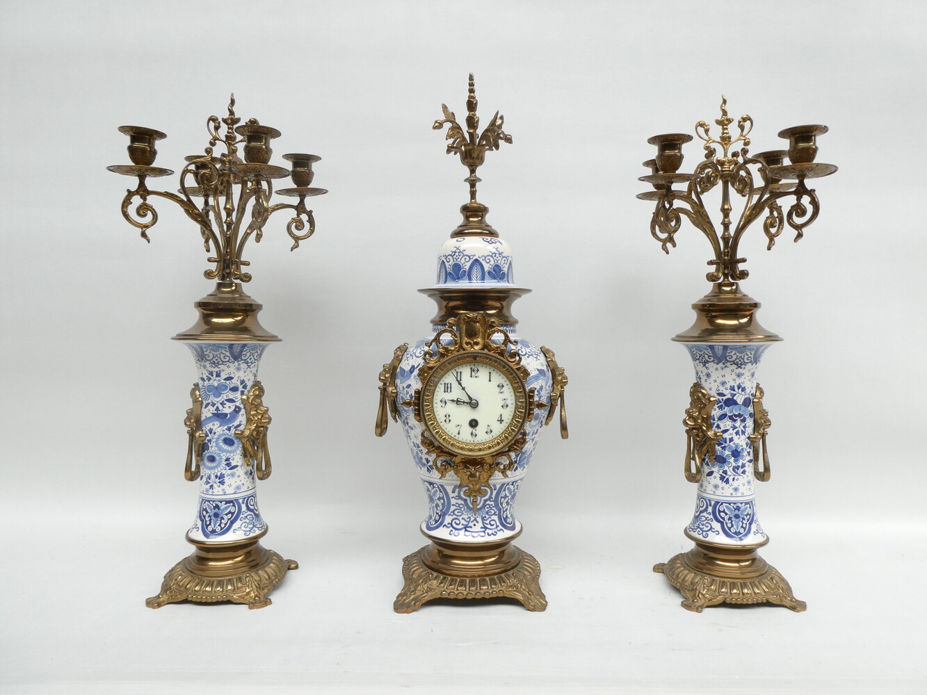 Grote antieke driedelige schouwgarnituur in blauw/witte faiënce met bronzen kandelaars en bronzen monturen. Hoogte 58 - 60 en 58cm.
