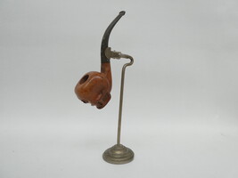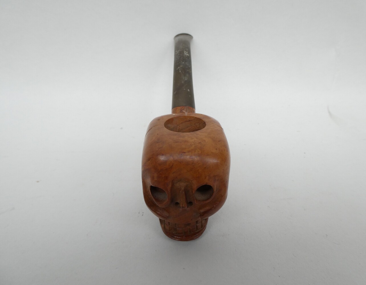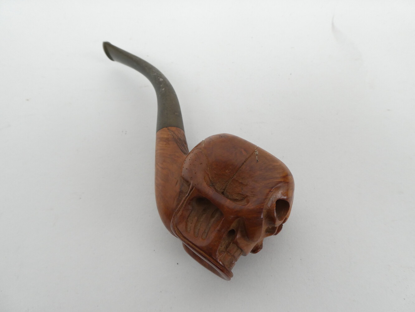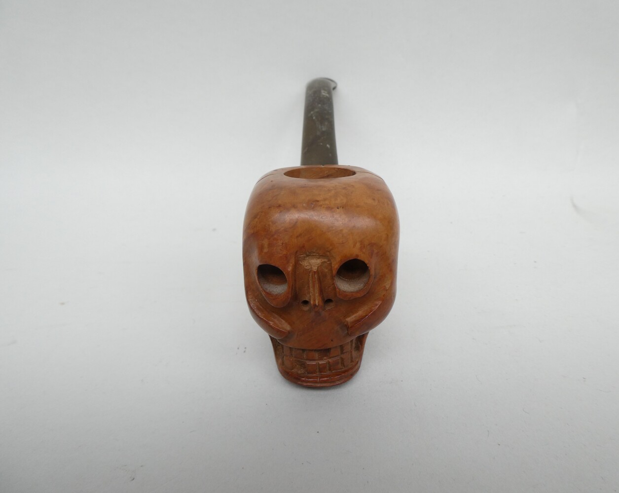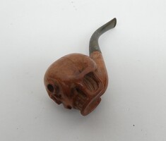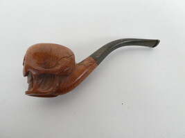 Antieke houtgesculpteerde pijp, de kop is een doodshoofd. Totale lengte 16cm - hoogte 5cm.
