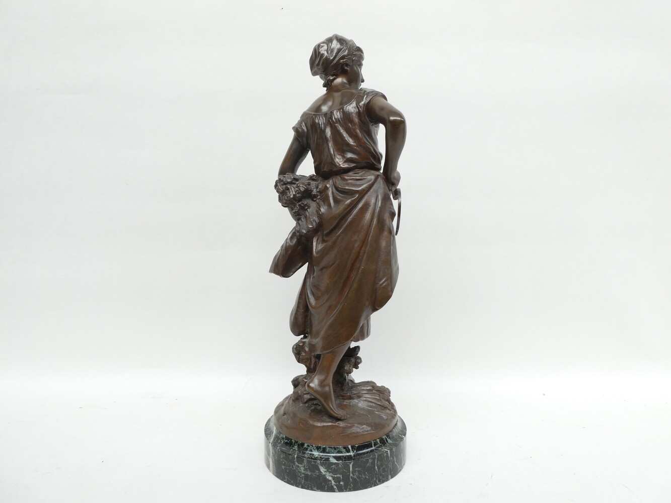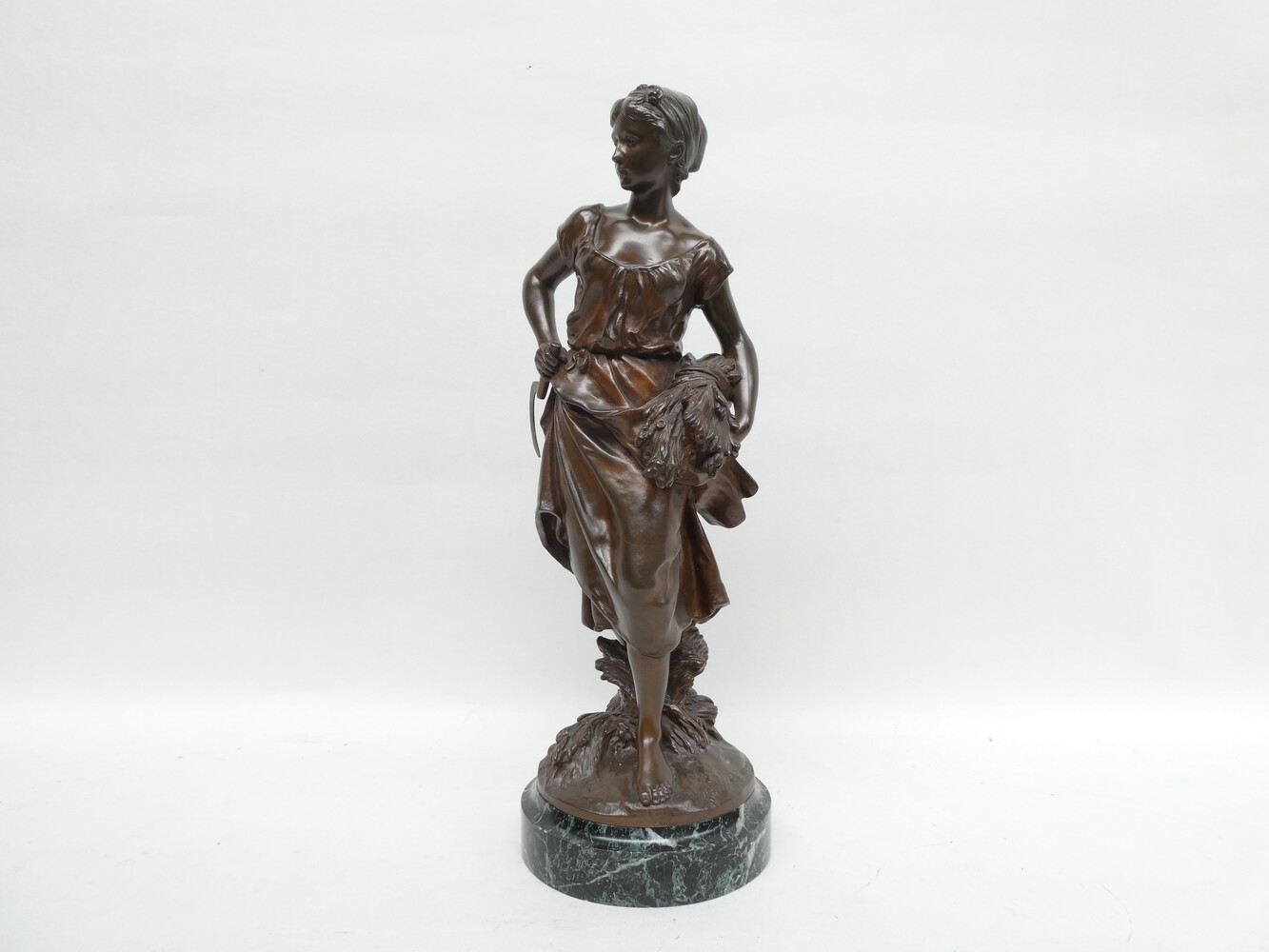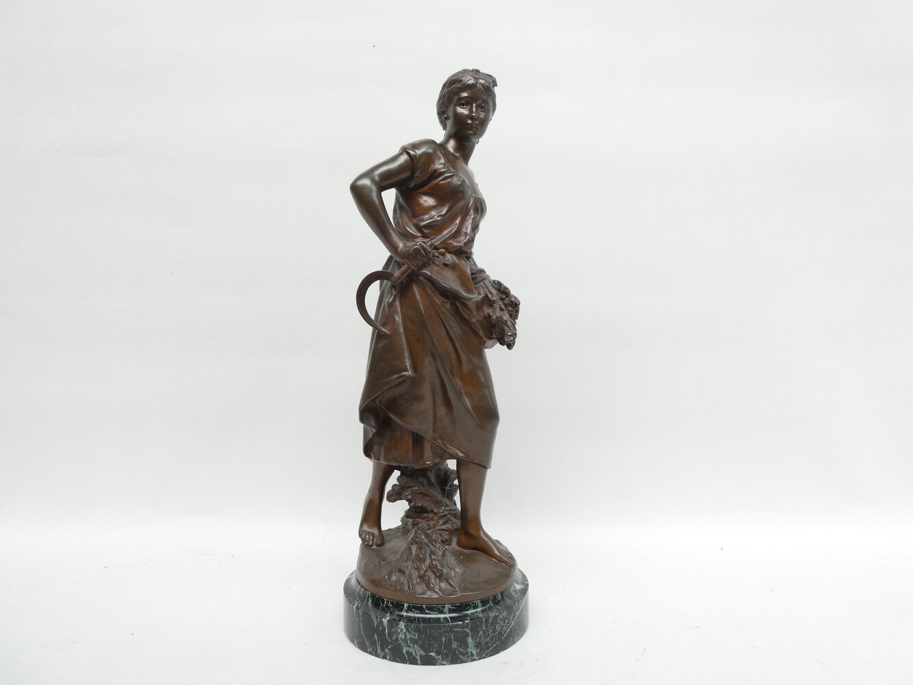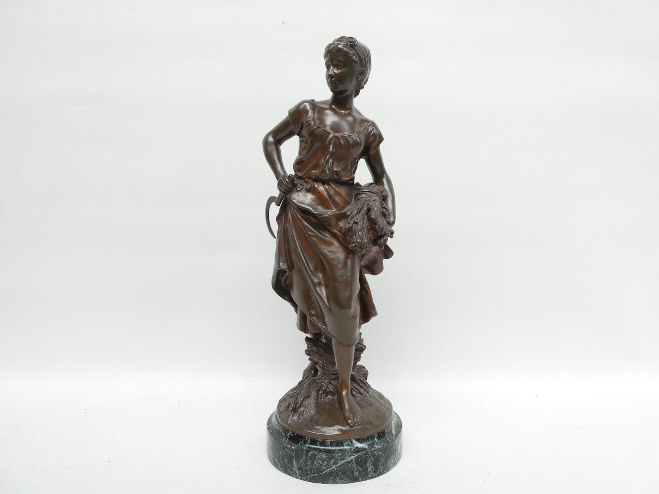 "Boerenmeisje met sikkel" fijn bronzen beeld van Mathurin Moreau met mooie patine. Totale hoogte 45cm.