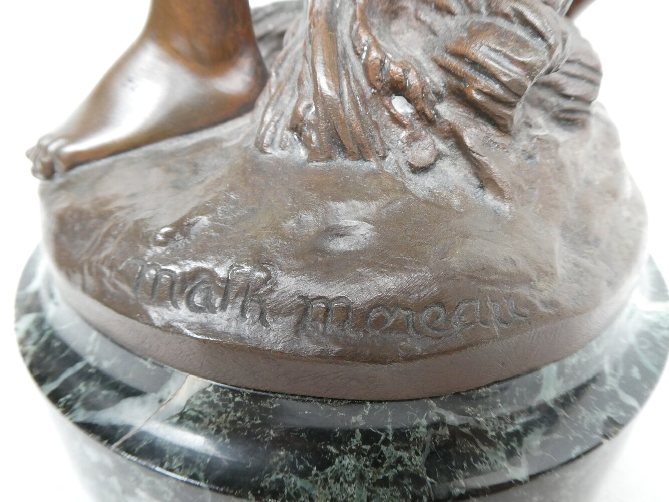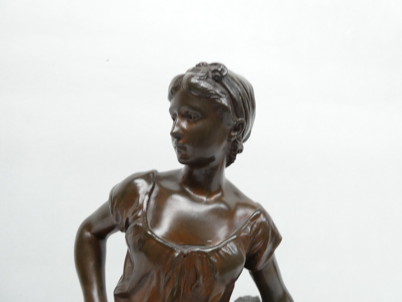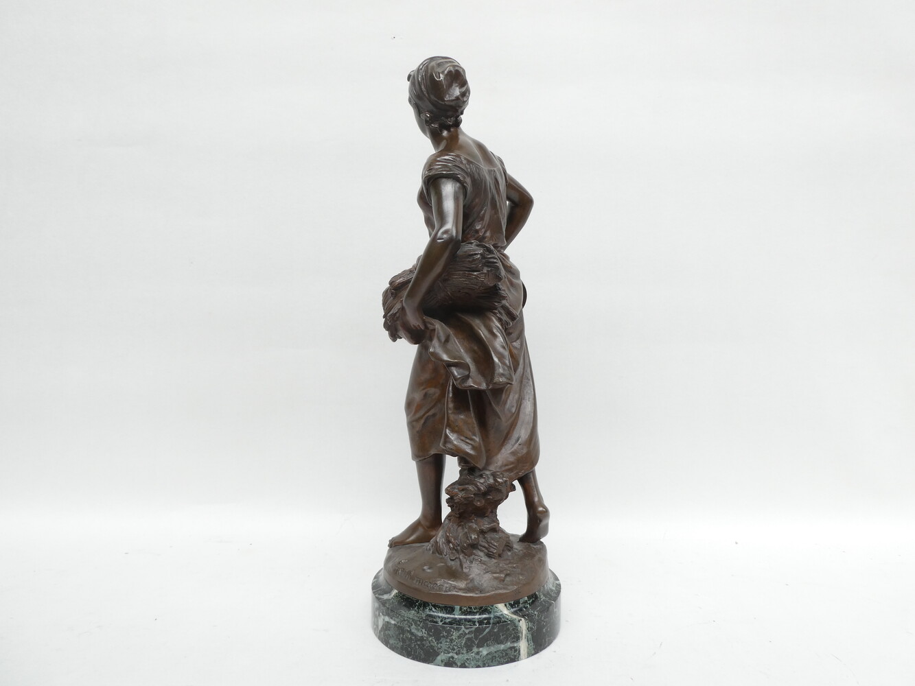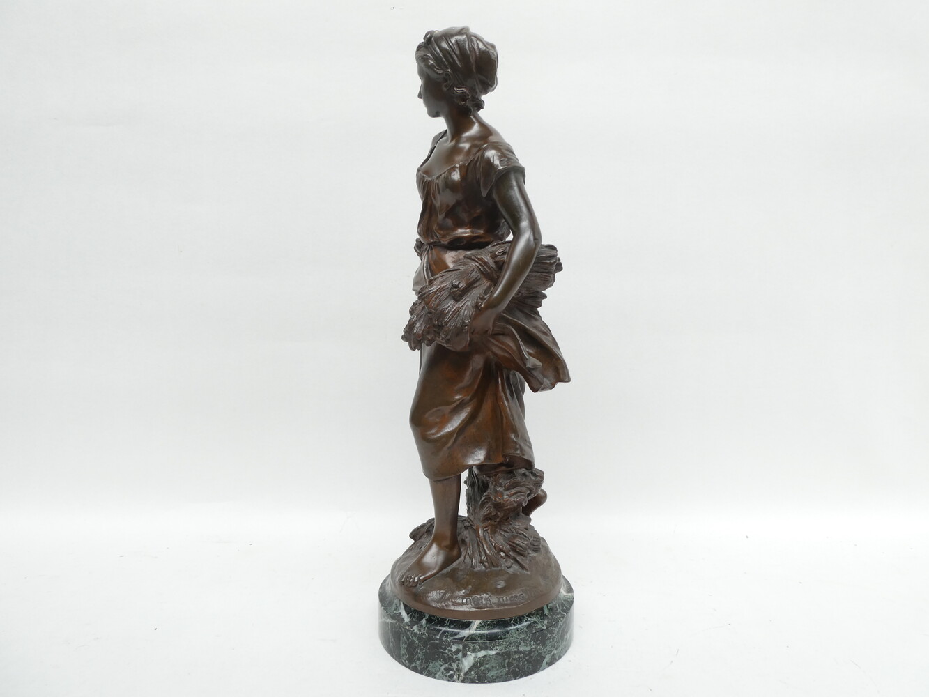 "Boerenmeisje met sikkel" fijn bronzen beeld van Mathurin Moreau met mooie patine. Totale hoogte 45cm.