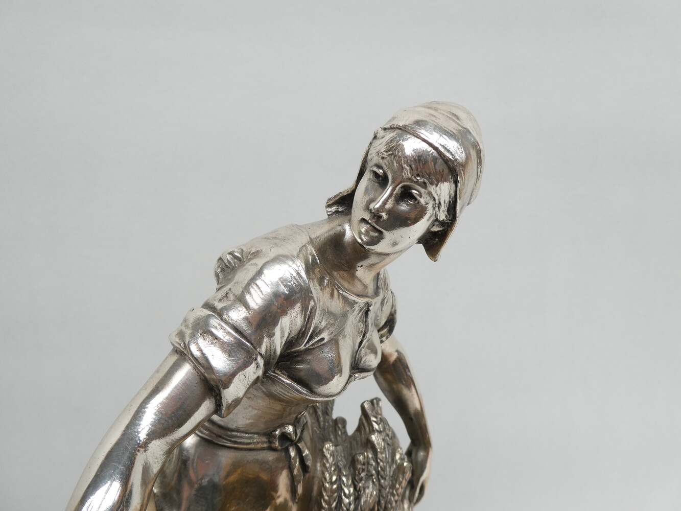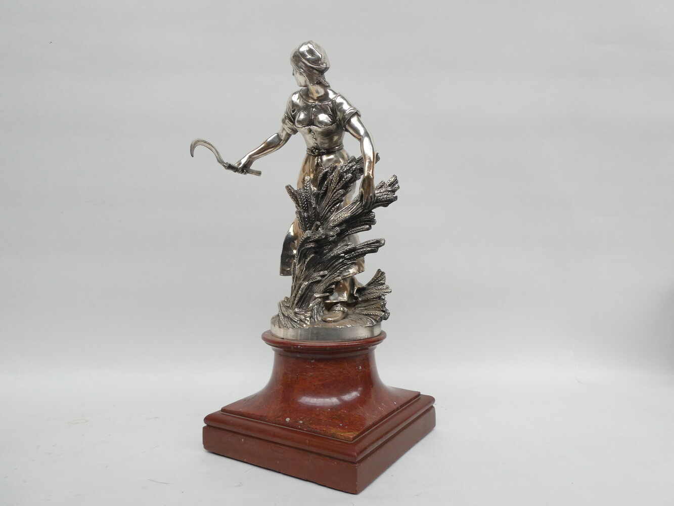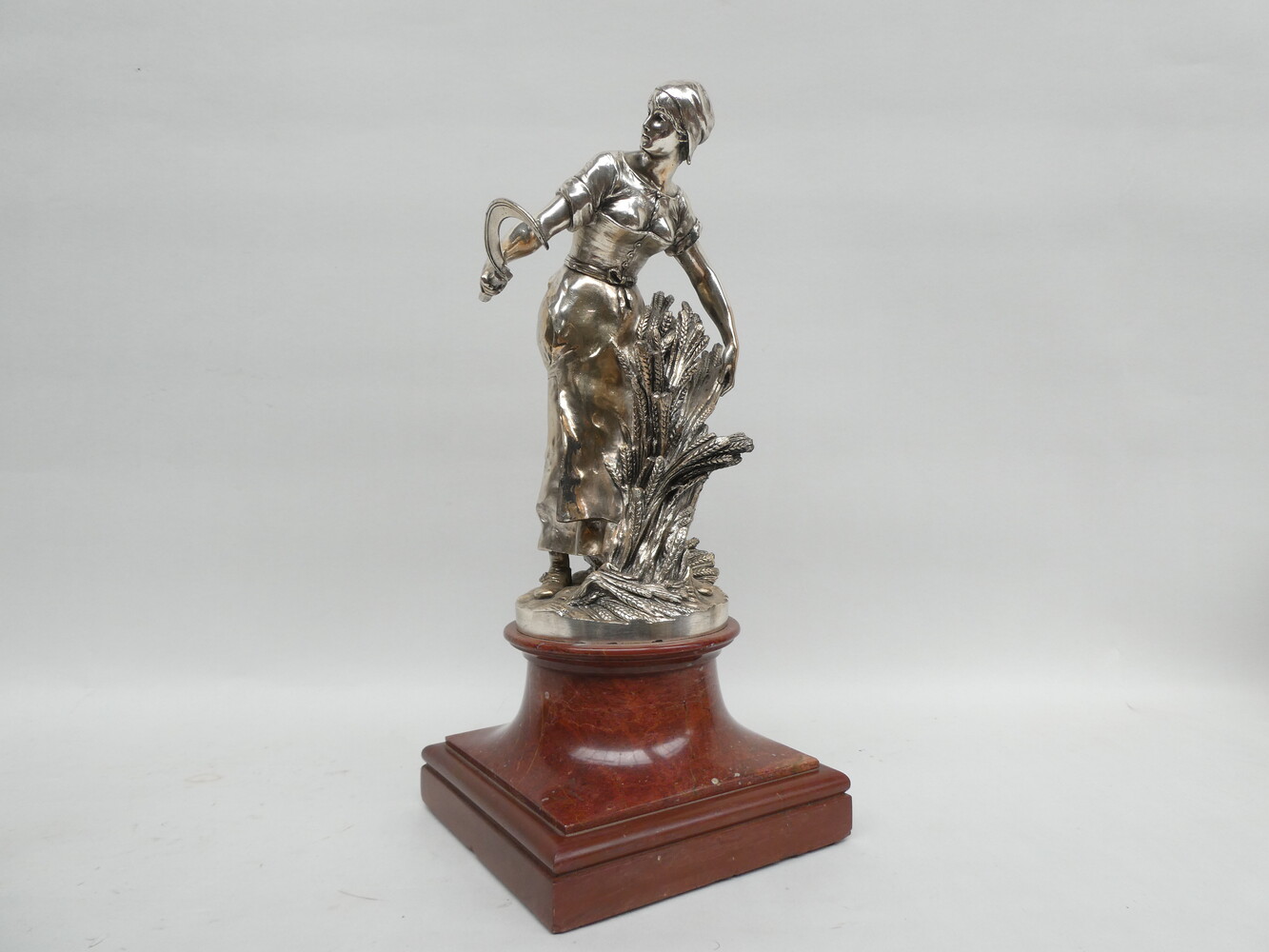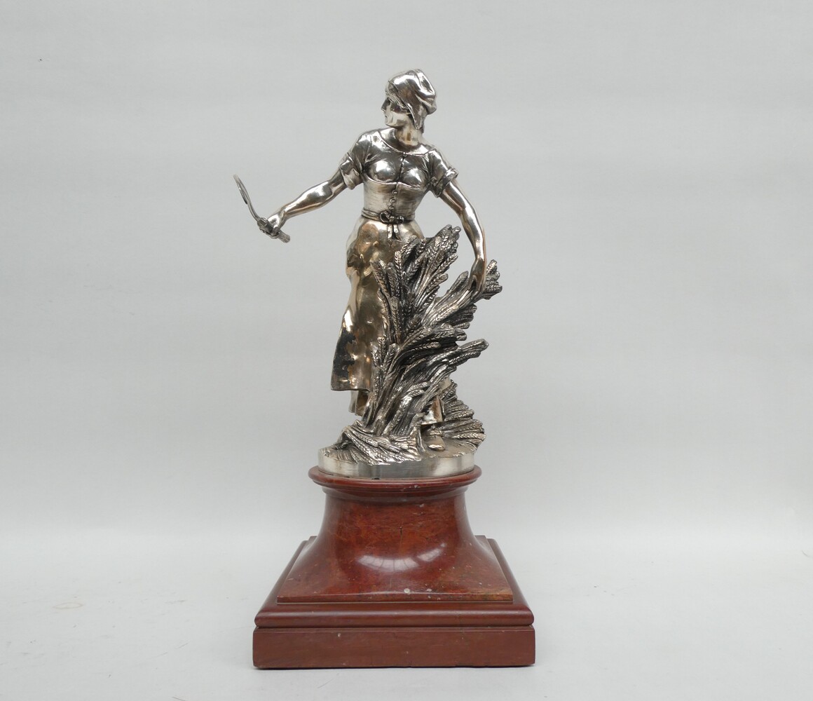 "Boerenmeisje met sikkel" ( Trophée Agricole ) beeld in verzilverd brons, gesigneerd Christoffle & Cie, op marmeren voetstuk. Totale hoogte 43cm.