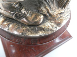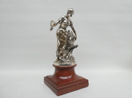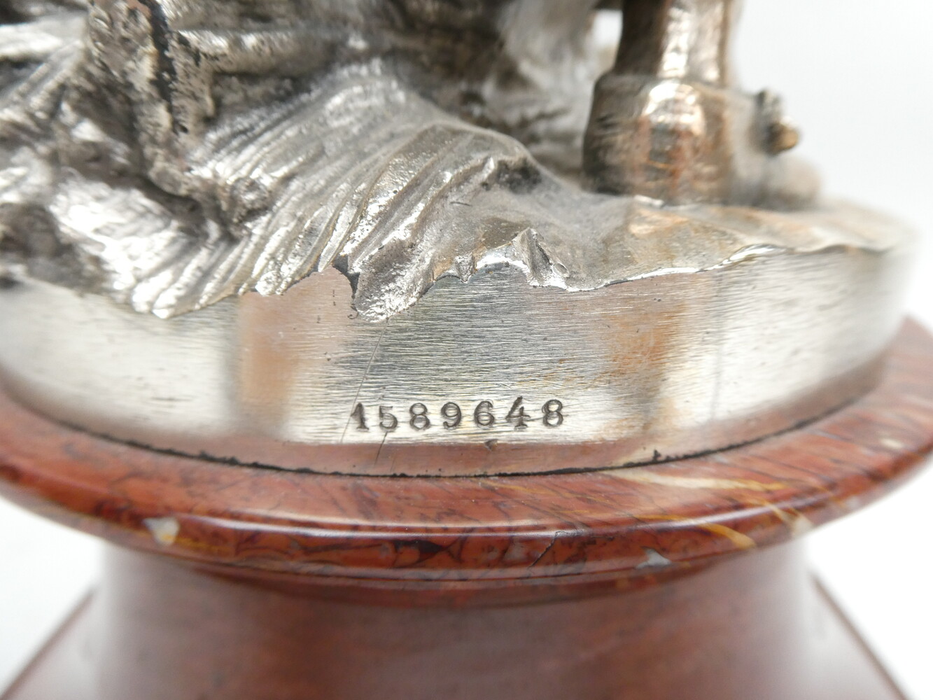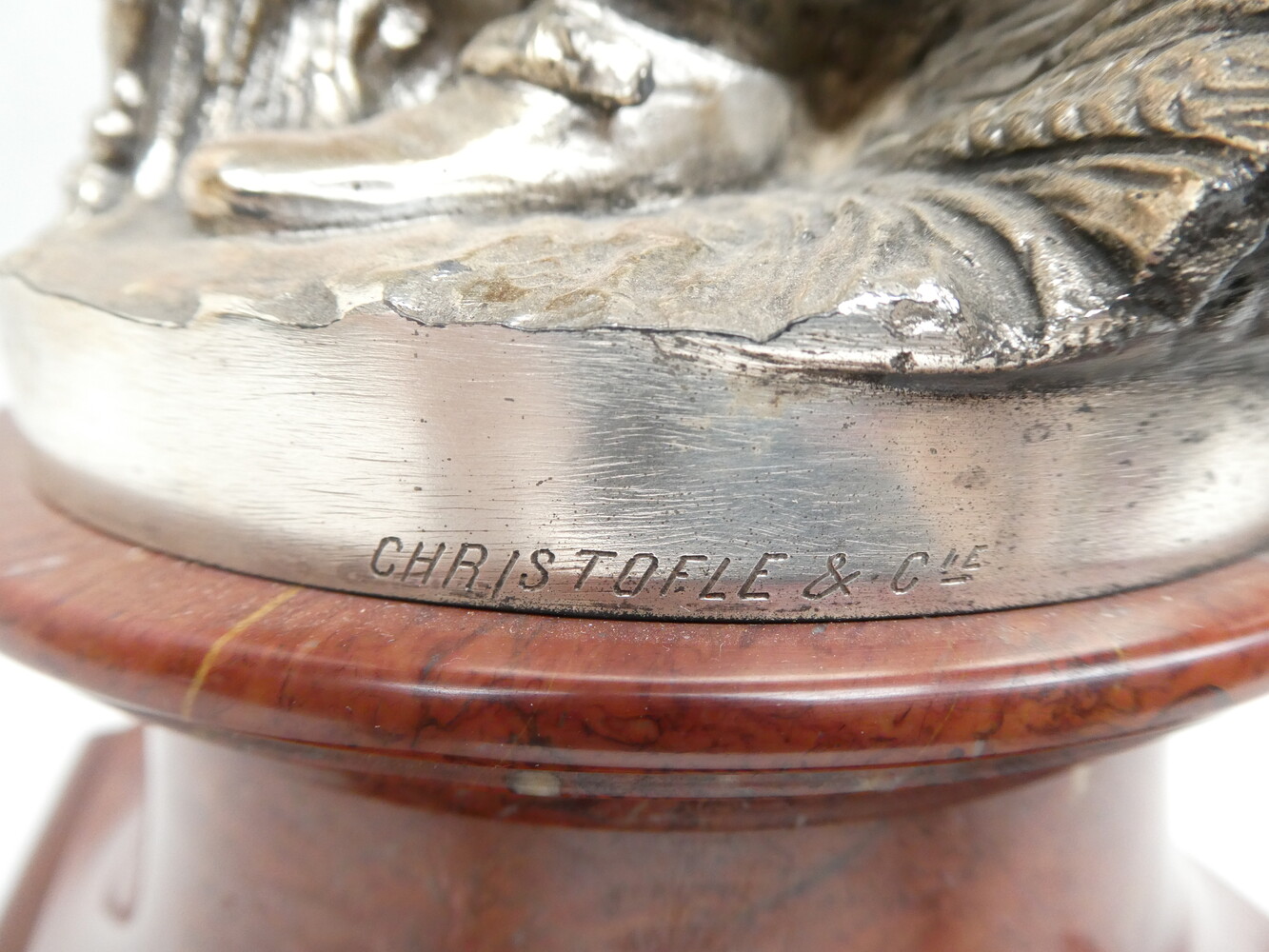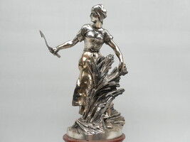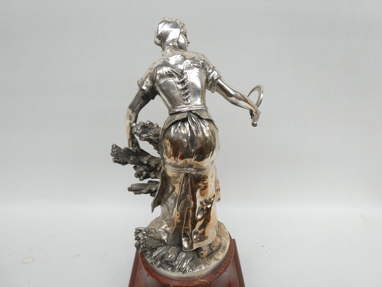 "Boerenmeisje met sikkel" ( Trophée Agricole ) beeld in verzilverd brons, gesigneerd Christoffle & Cie, op marmeren voetstuk. Totale hoogte 43cm.