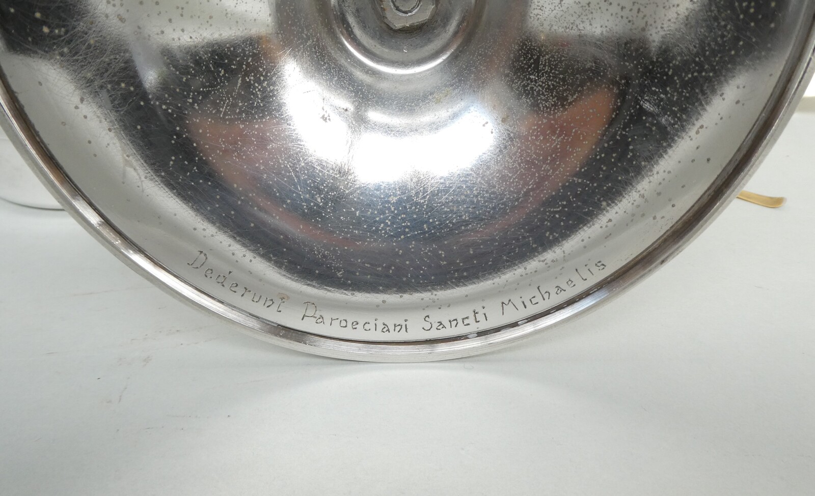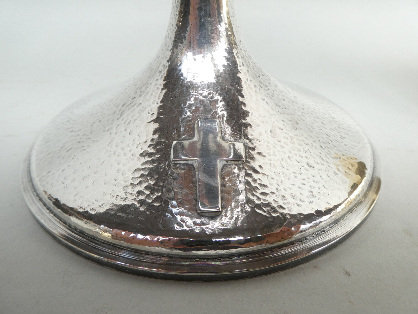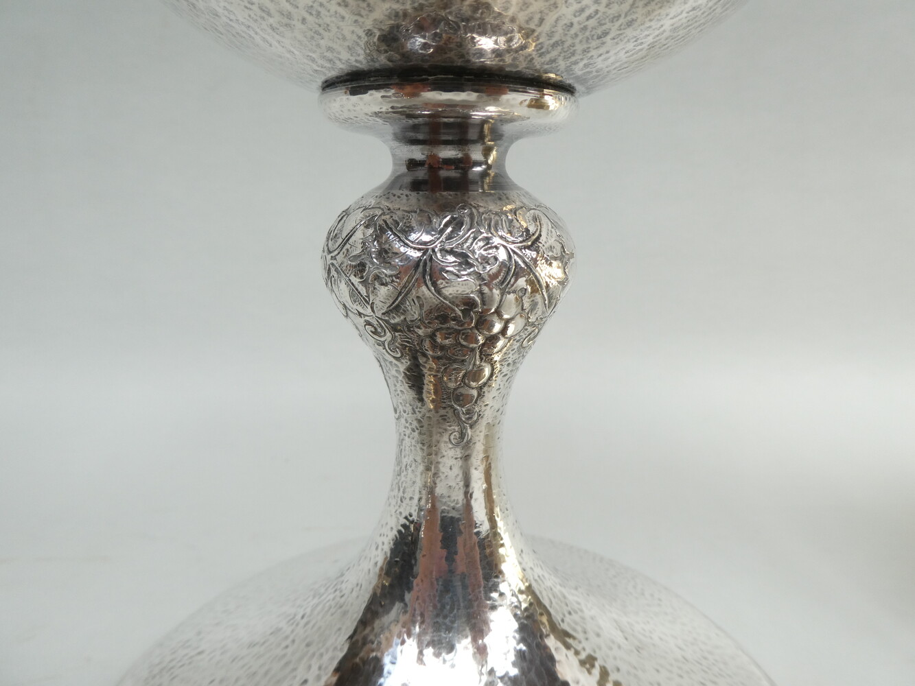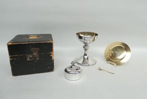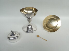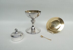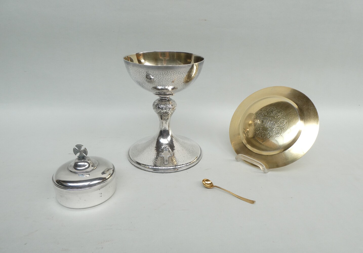 Brugse zilveren kelk ( zilversmid Mouraux ) met zilveren pateen en lepeltje, en met bijhorend opbergkistje.