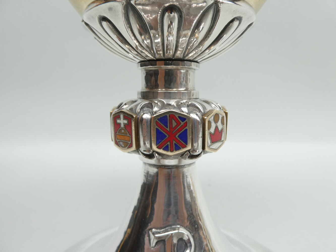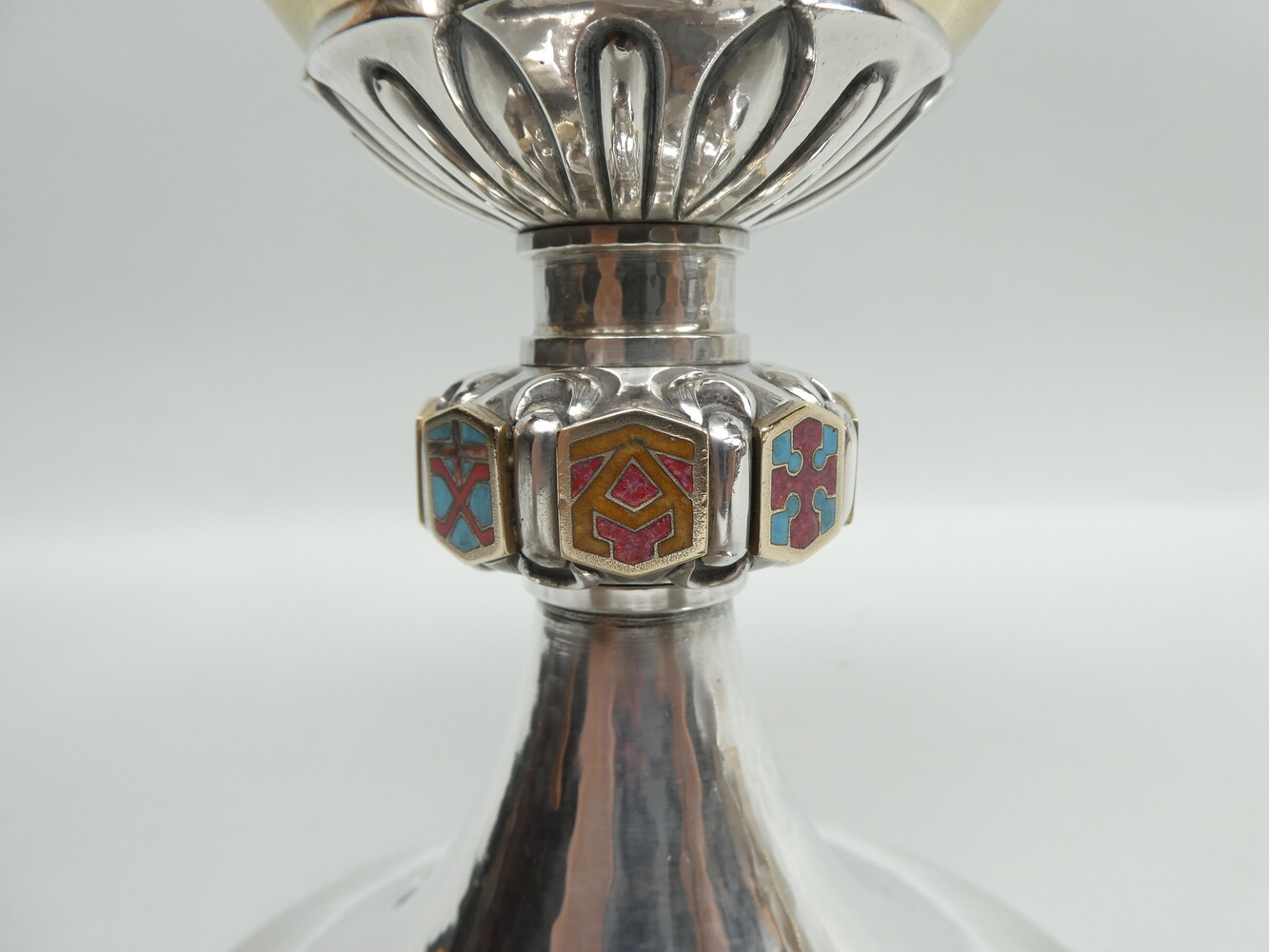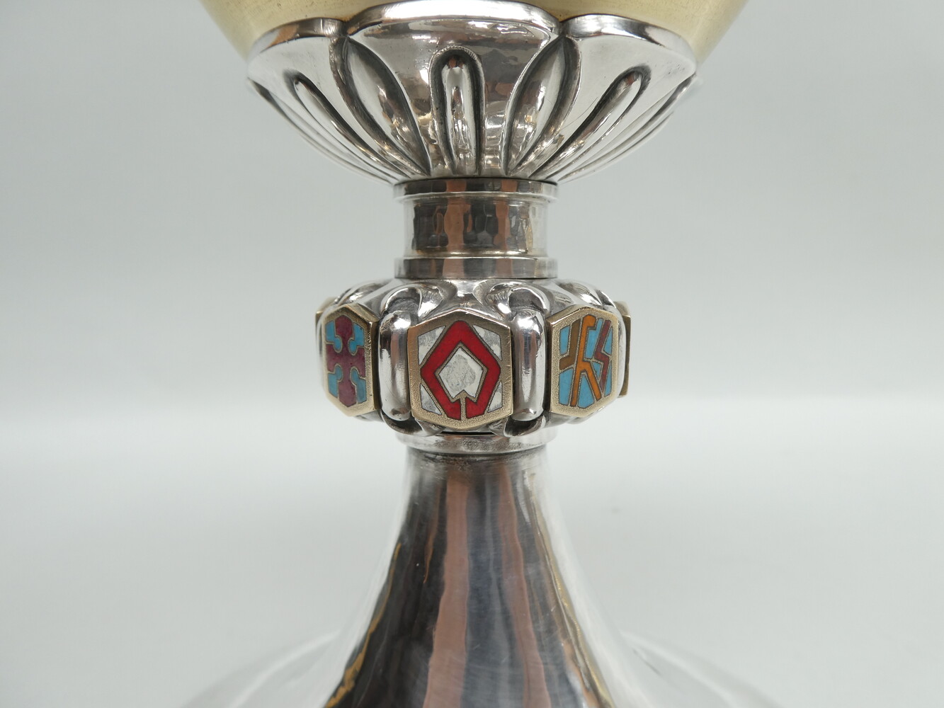 Brusselse zilveren kelk (gehalte 900, sterling), schildjes met religieuze symbolen in émail op de nodus. Hoogte 16cm - totaal gewicht 625gram Zilversmid E.Vandenhoute Anderlecht.
