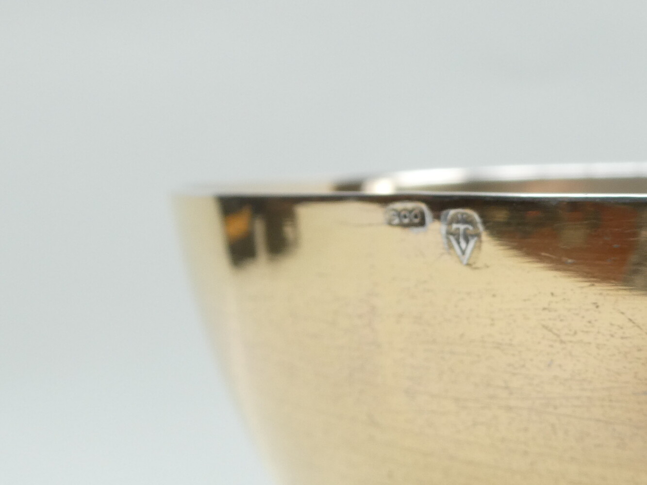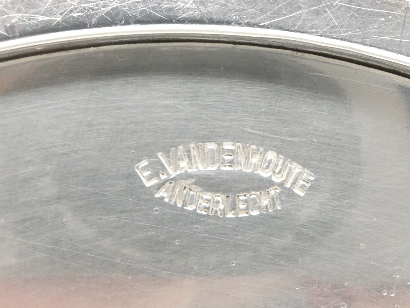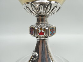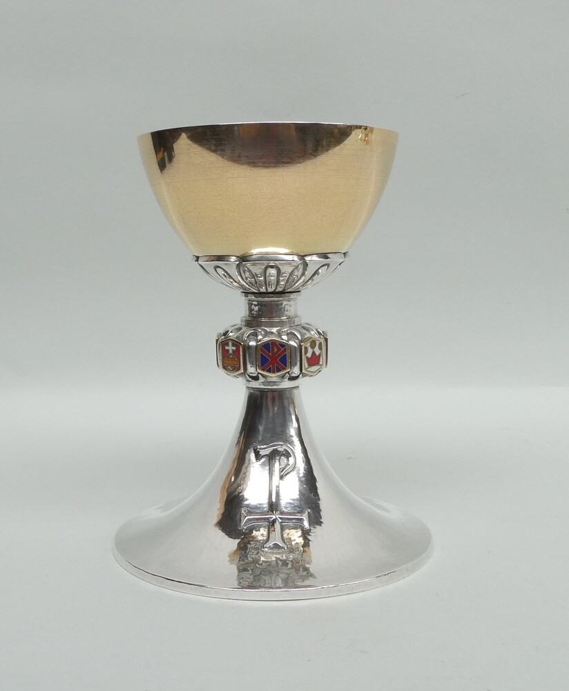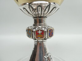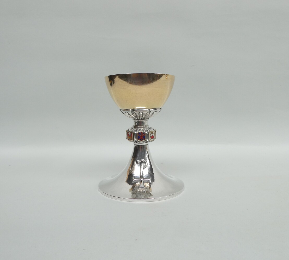Brusselse zilveren kelk (gehalte 900, sterling), schildjes met religieuze symbolen in émail op de nodus. Hoogte 16cm - totaal gewicht 625gram Zilversmid E.Vandenhoute Anderlecht.