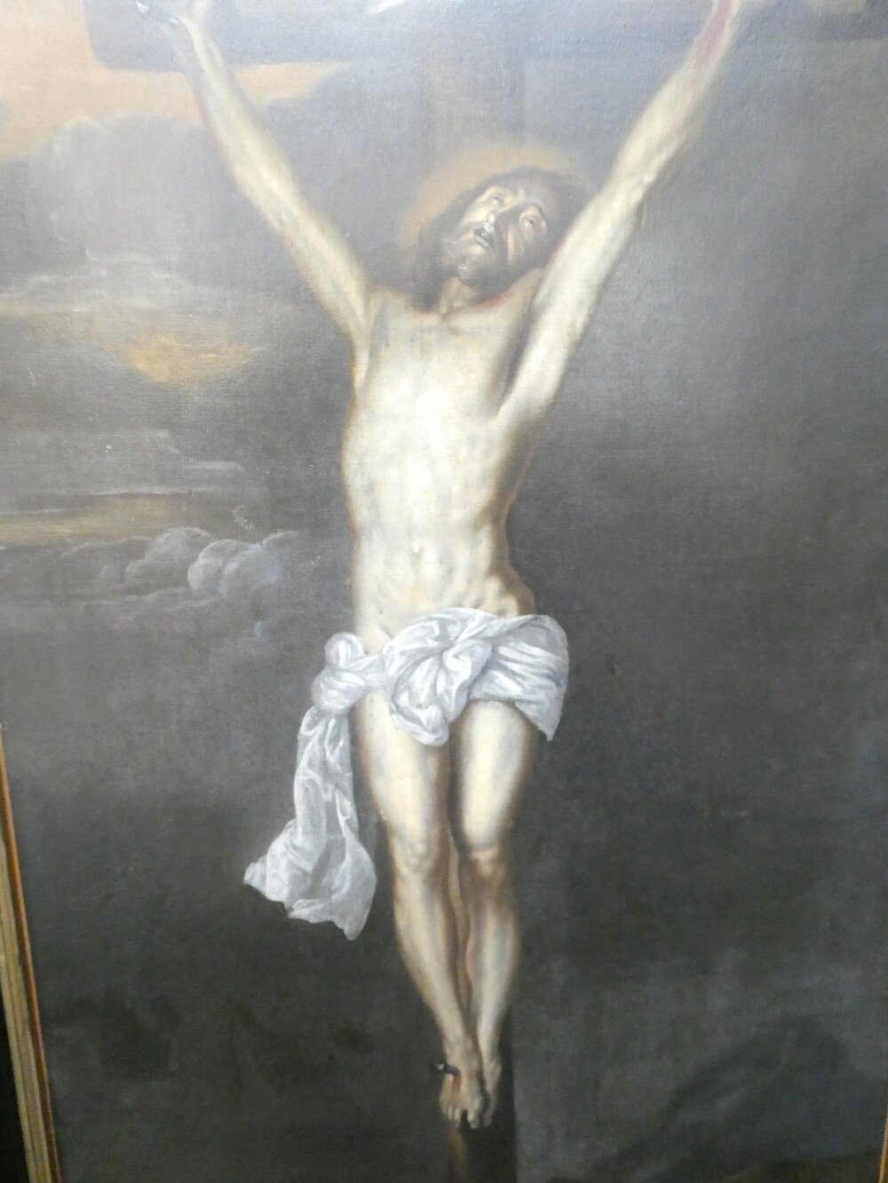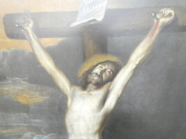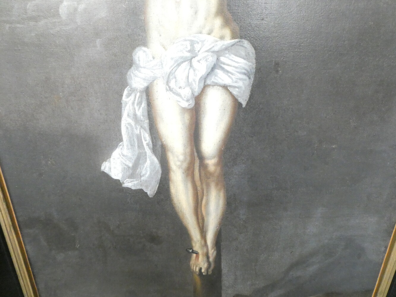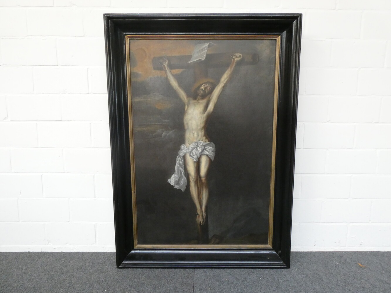 "Christus aan het kruis" naar Antoon Van Dyck, antiek oliewerk op doek ( herdoekt ). 74cmx110cm - met kader 94cmx130cm.