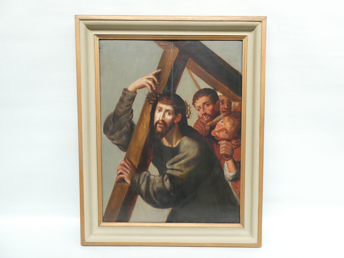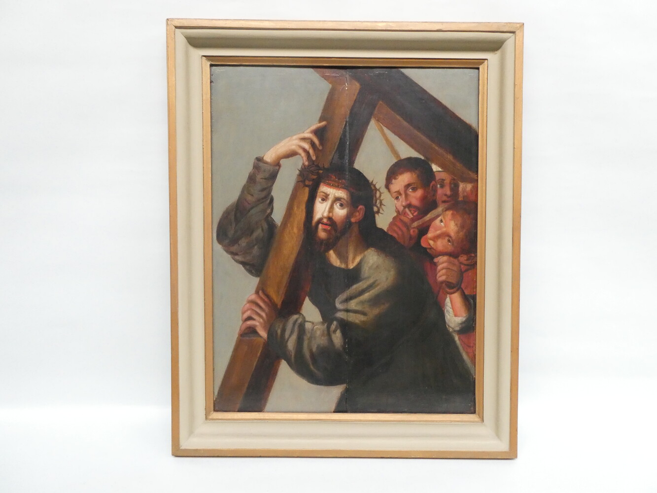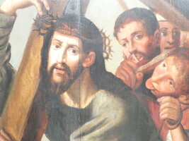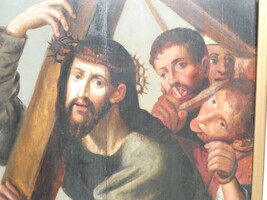 "Christus draagt zijn kruis" antiek oliewerk op paneel.
