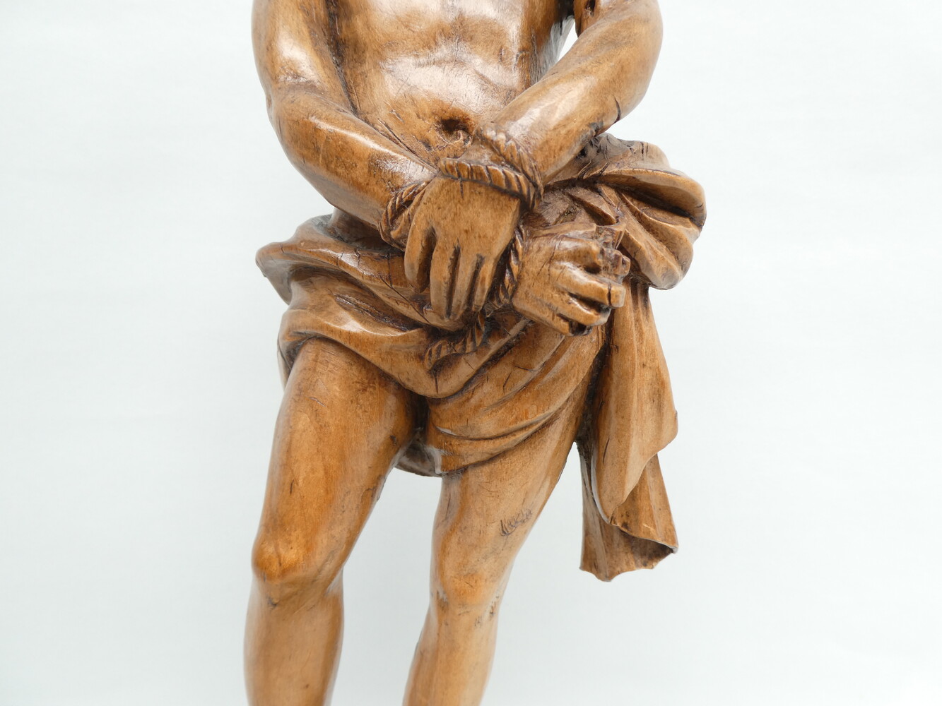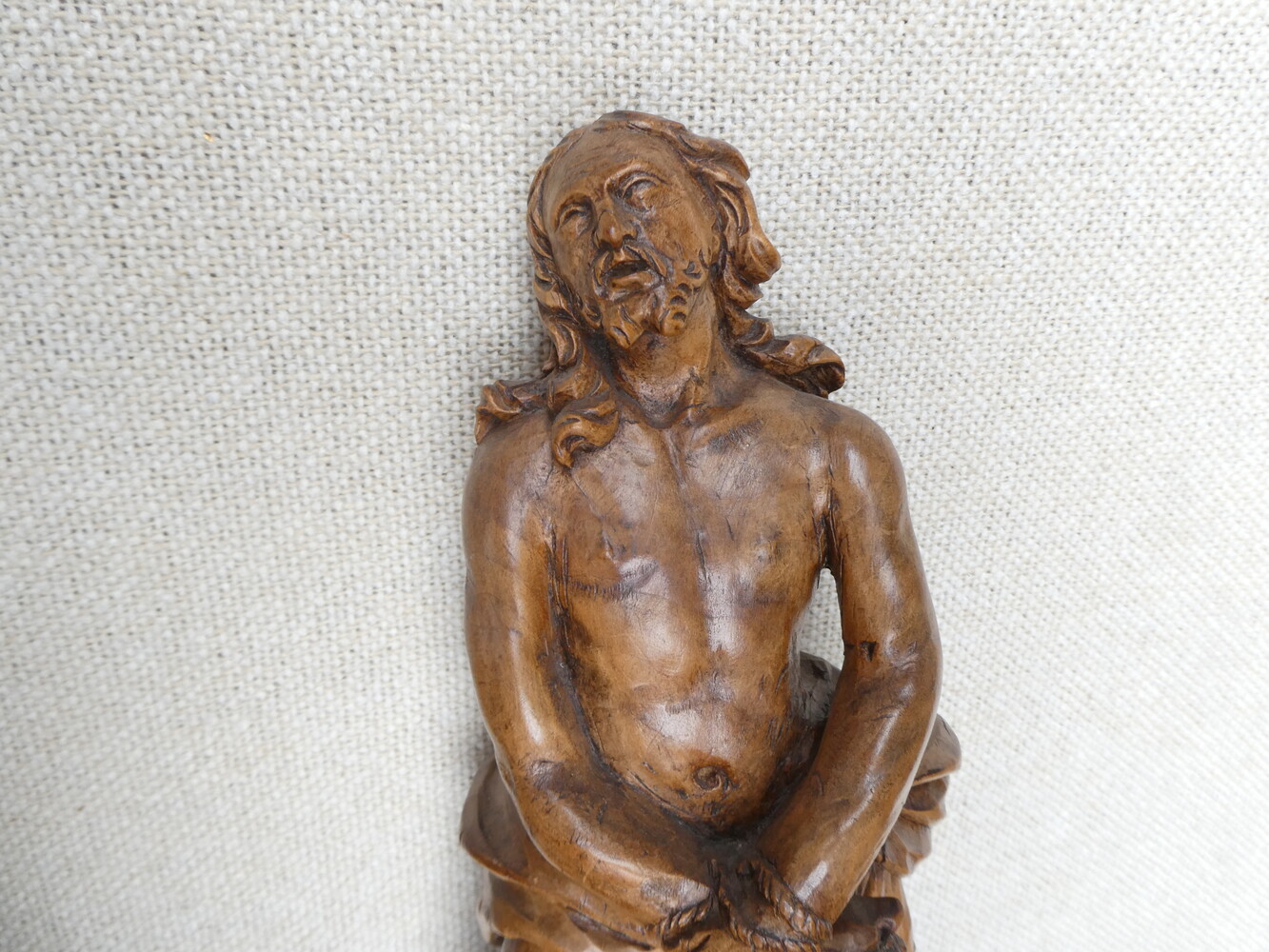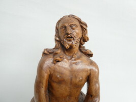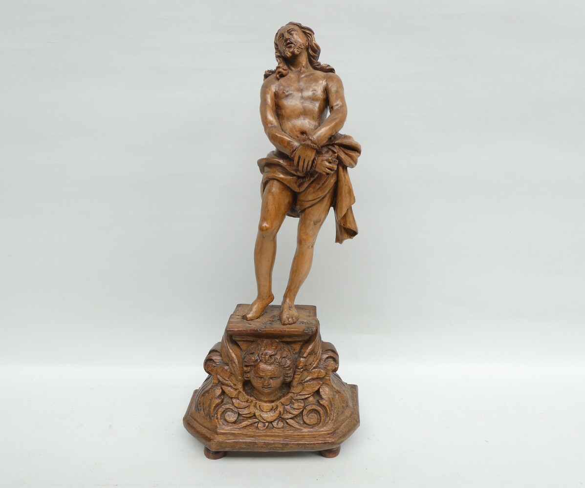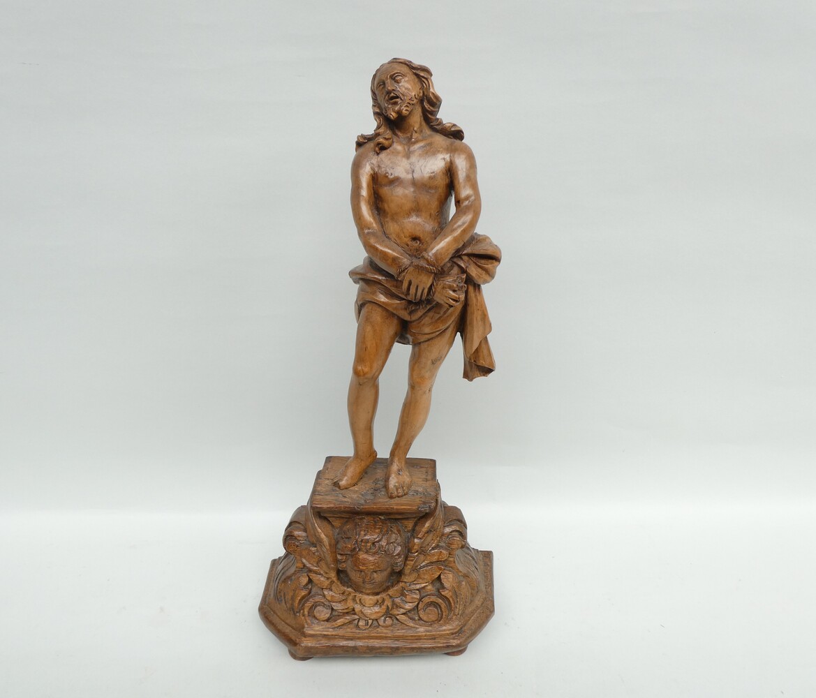 "De gebonden Christus" antiek eiken beeld op sokkel met engelenkopje.