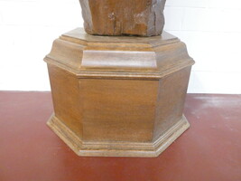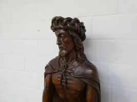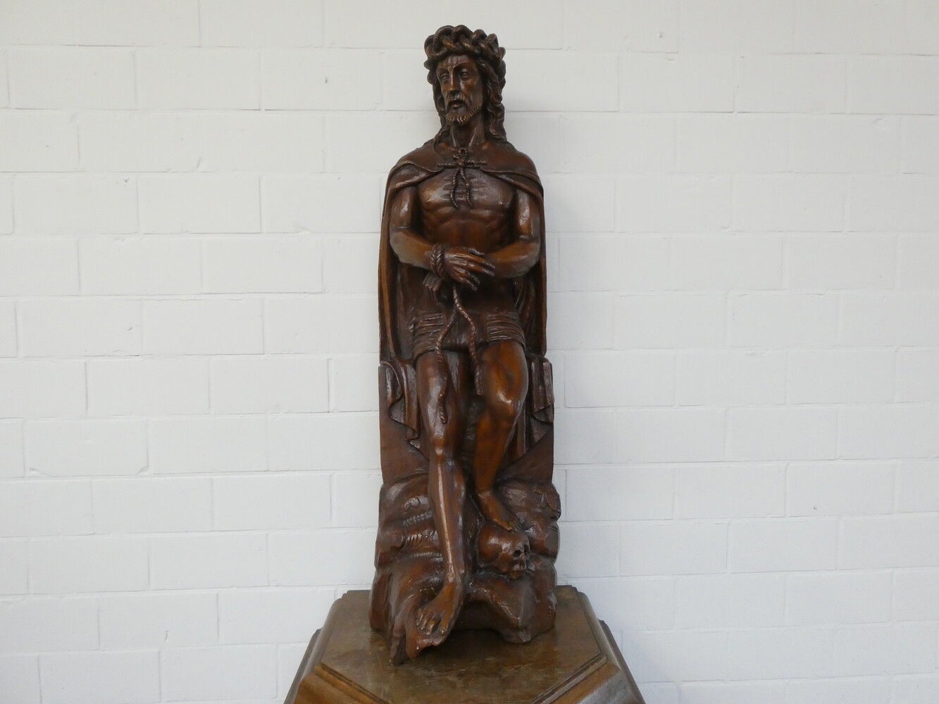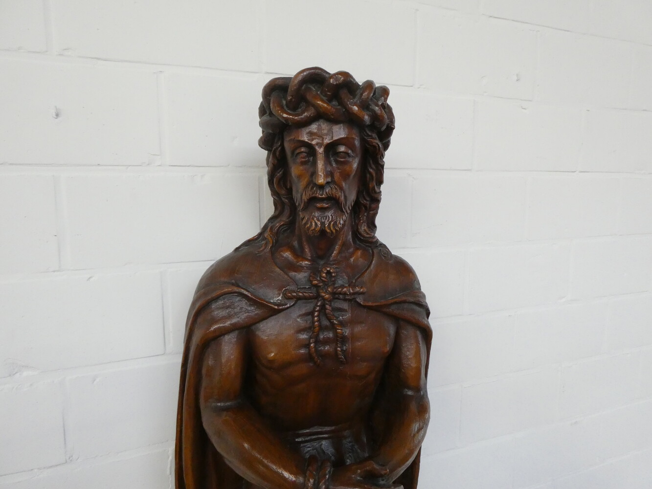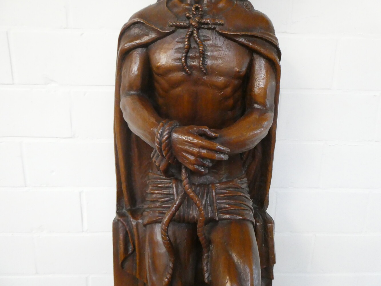 "De gebonden Christus" GROOT antiek houten beeld, hoogte 132cm en bijgevoegd een zeskantige houten sokkel 83cmx65cm, hoogte 50cm.