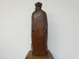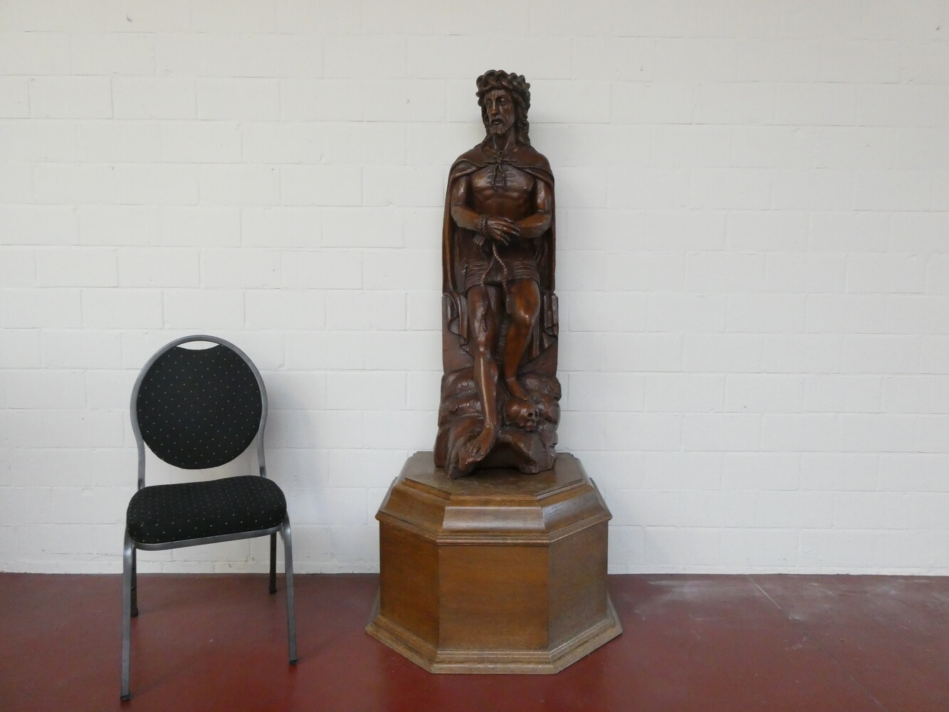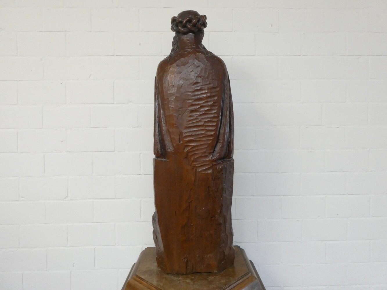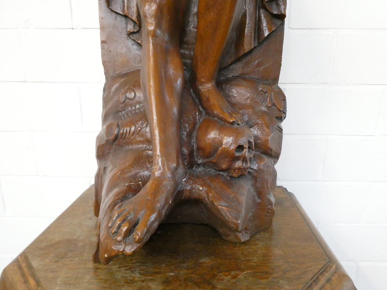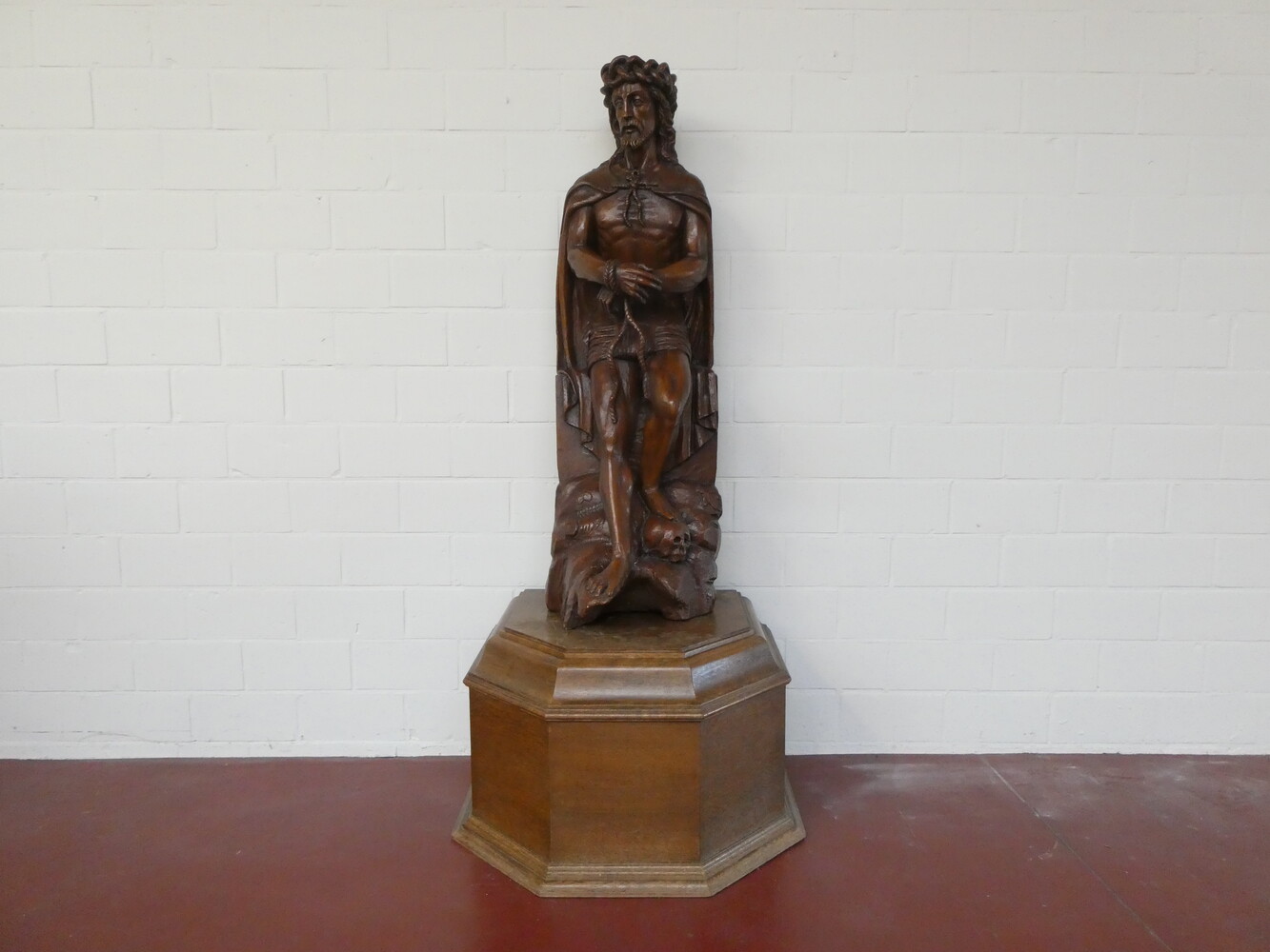 "De gebonden Christus" GROOT antiek houten beeld, hoogte 132cm en bijgevoegd een zeskantige houten sokkel 83cmx65cm, hoogte 50cm.