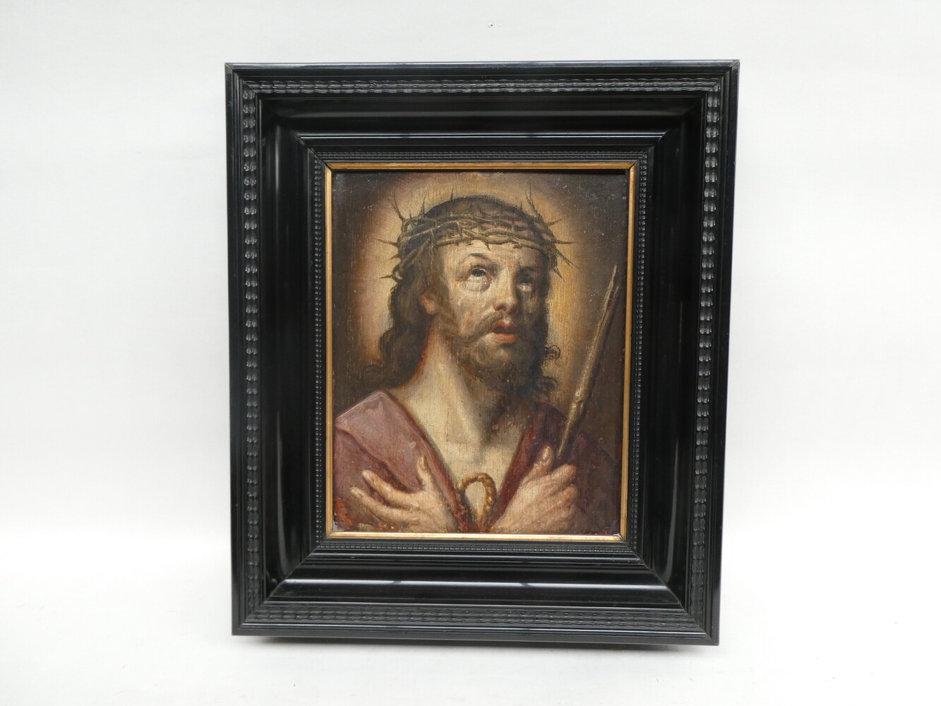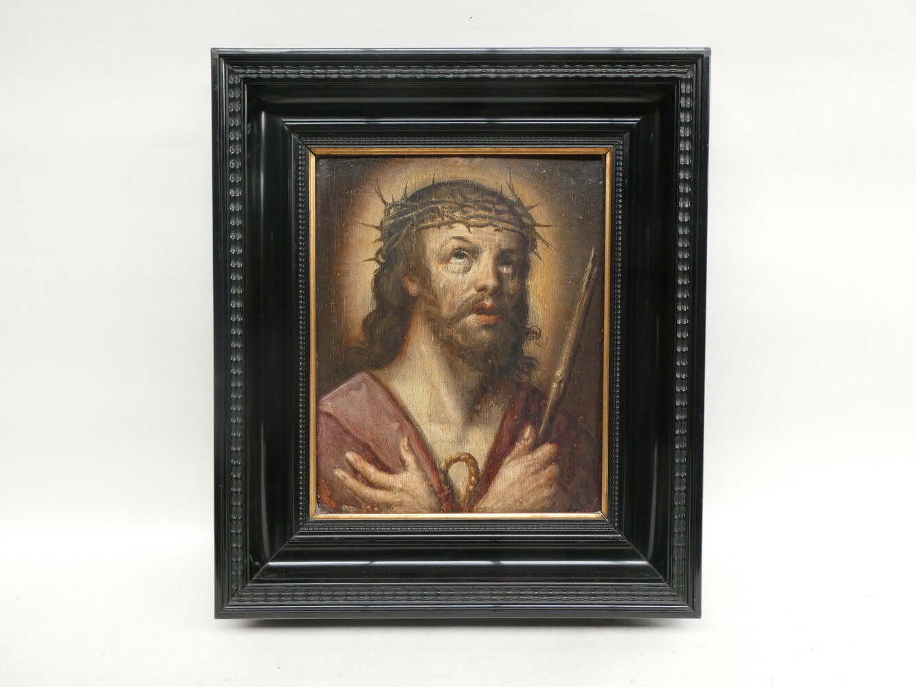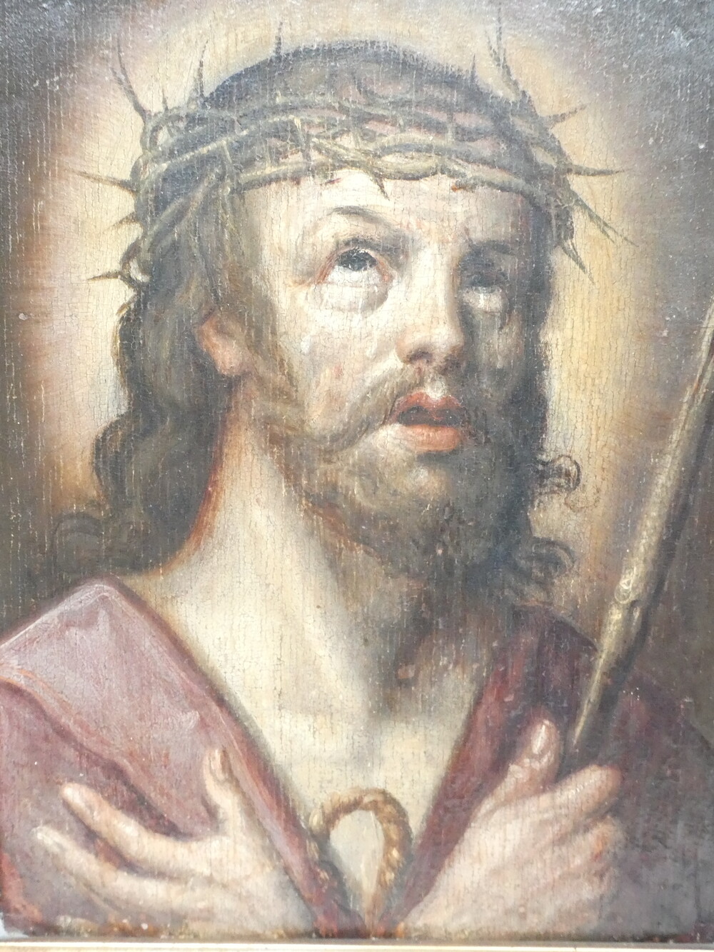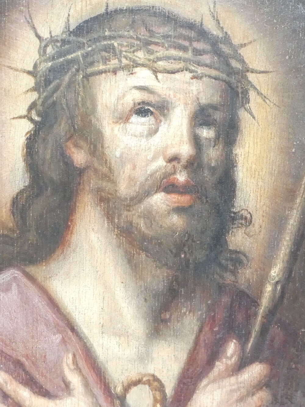 "De gegeselde Christus" oliewerk op houten paneel, Vlaamse School ca 1700. Zeer mooie kwaliteit.