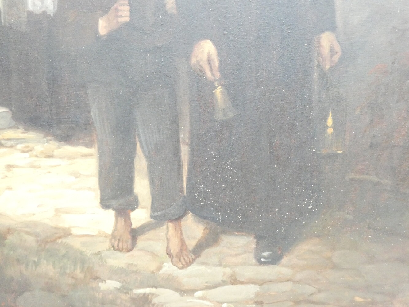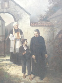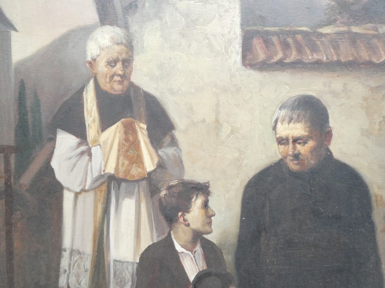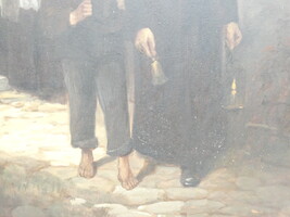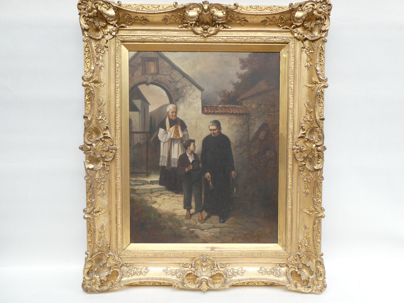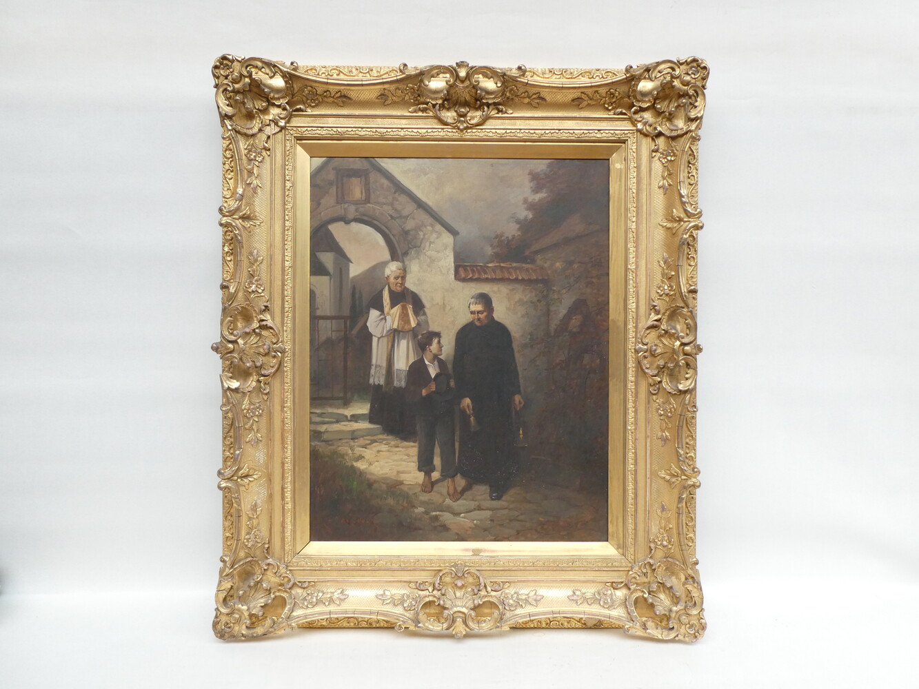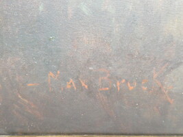 "De priester brengt de communie" antiek werk olie op paneel. Gesigneerd Max Bruck. 57cmx73cm - met kader 90cmx105cm.