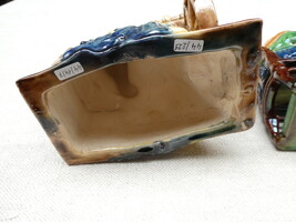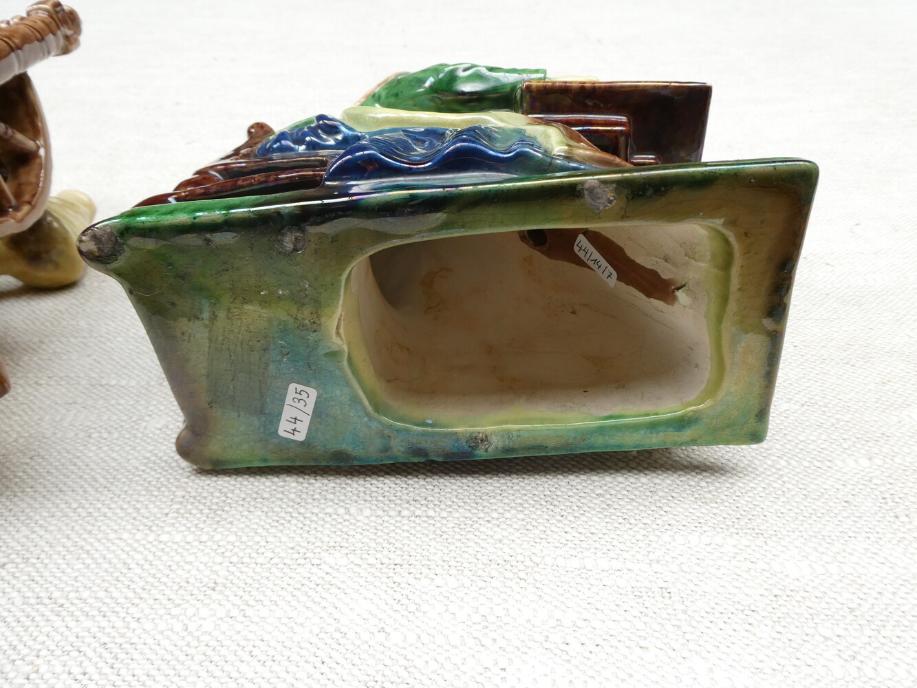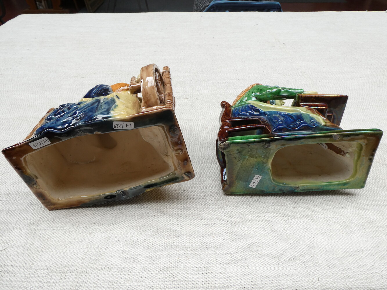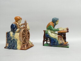 "De spinster en de kantkloster" twee beeldjes in Vlaams aardewerk, polychroom. Hoogte 22cm en 20,5cm.