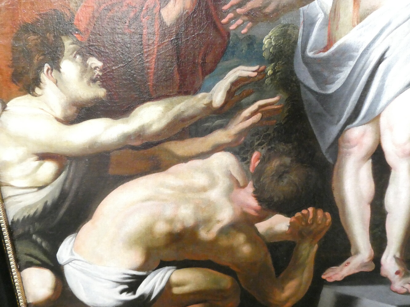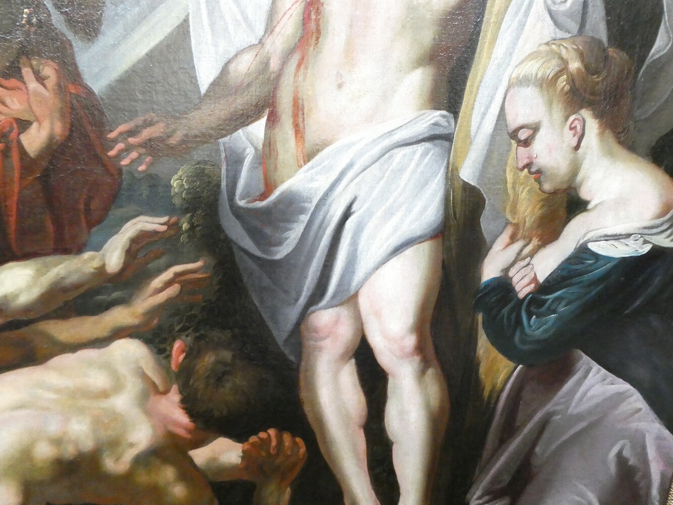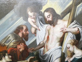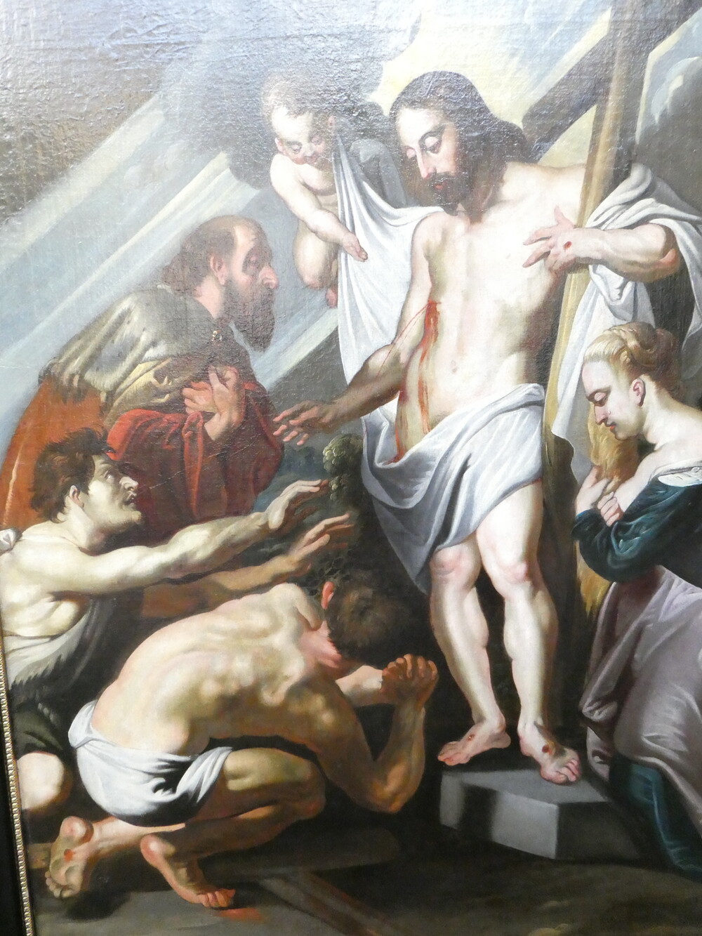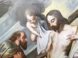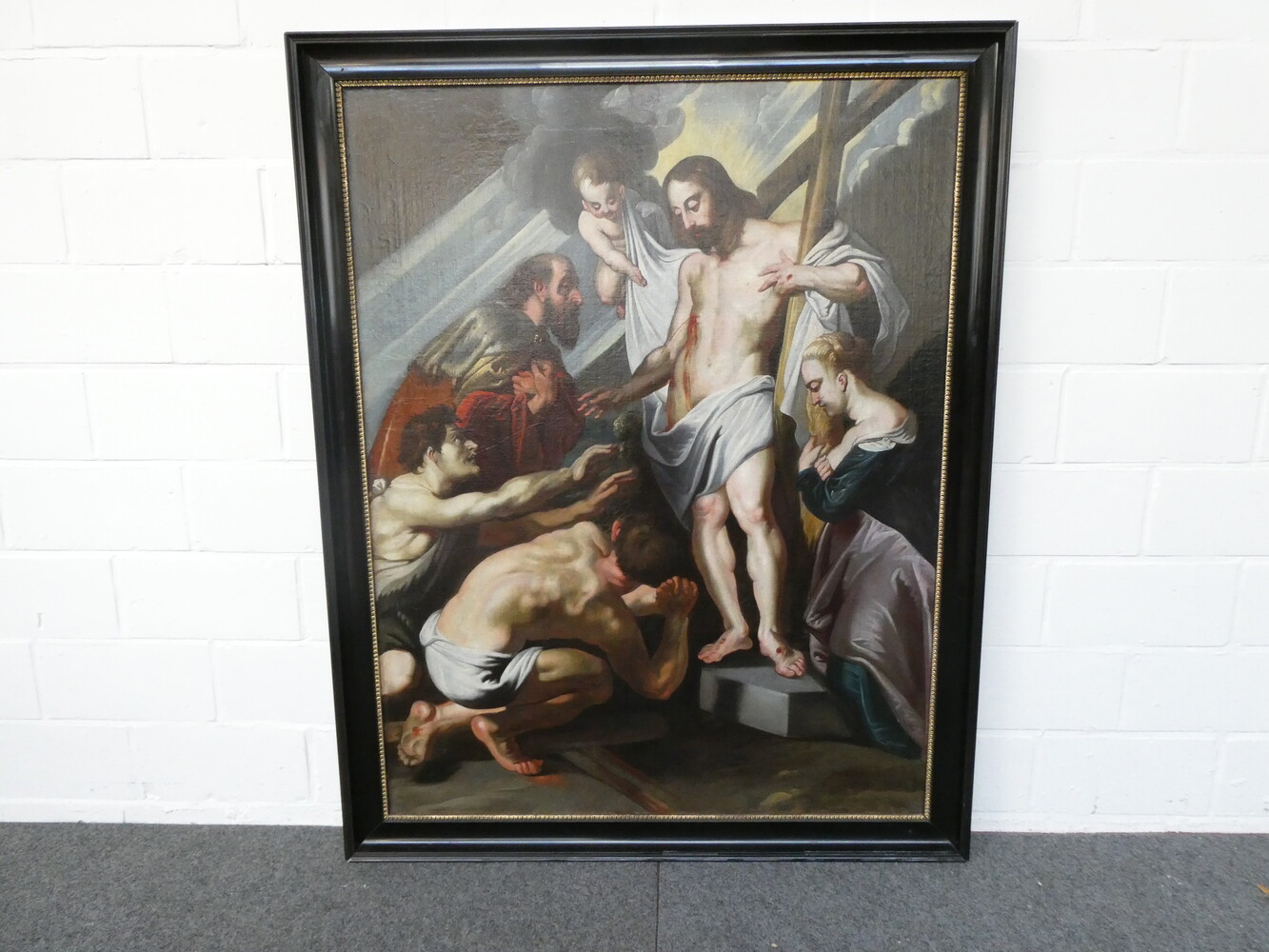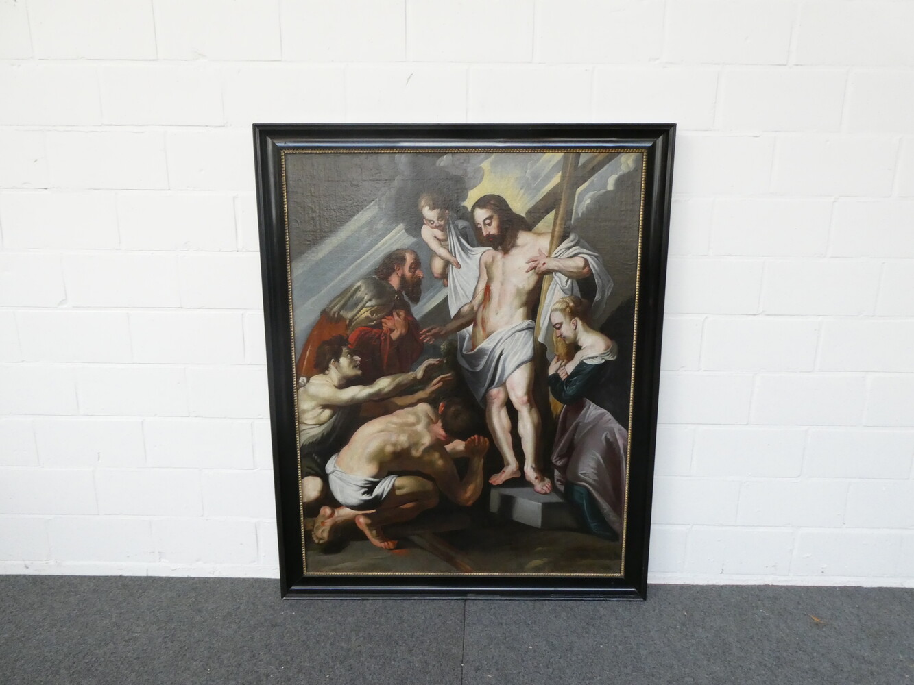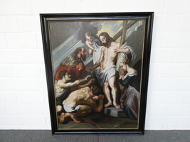 "De verrezen Christus" groot antiek oliewerk op doek. ( Verdoekt ). 87cm x 112cm - met kader 99cm x 125cm.
