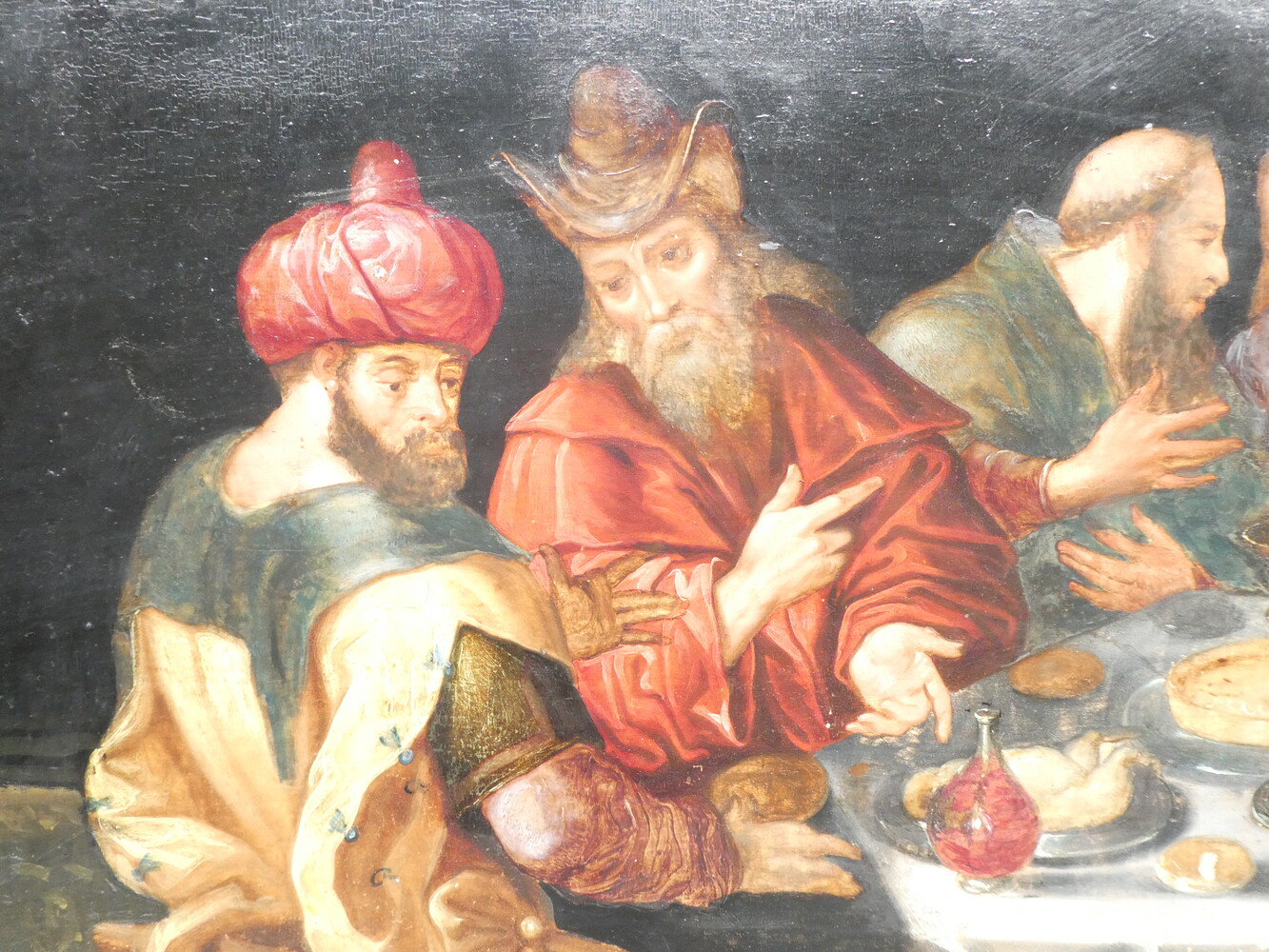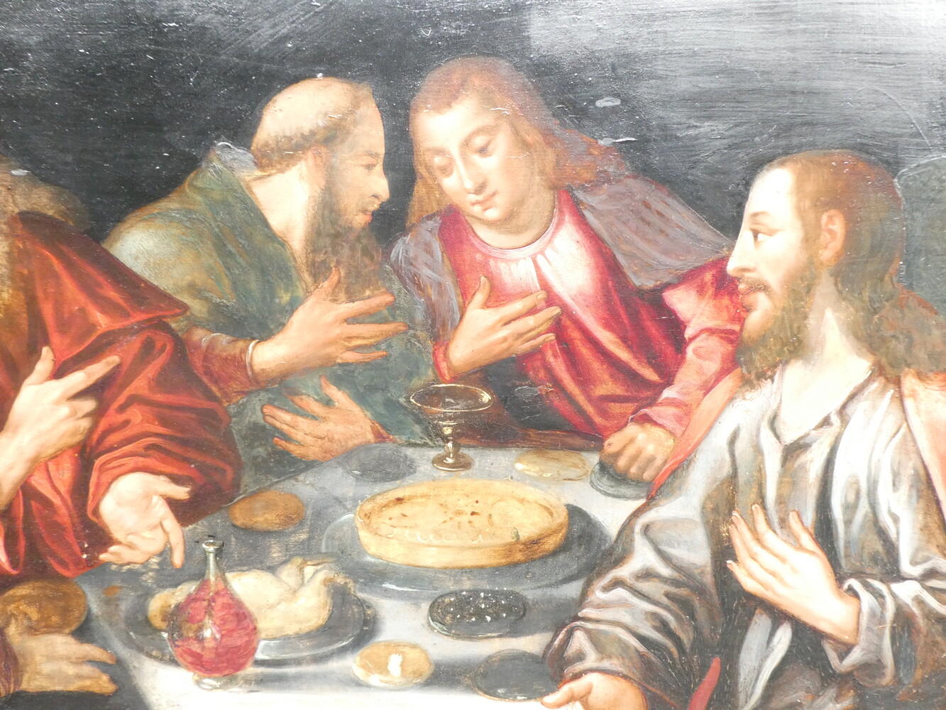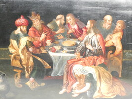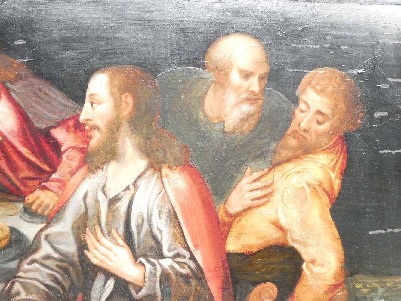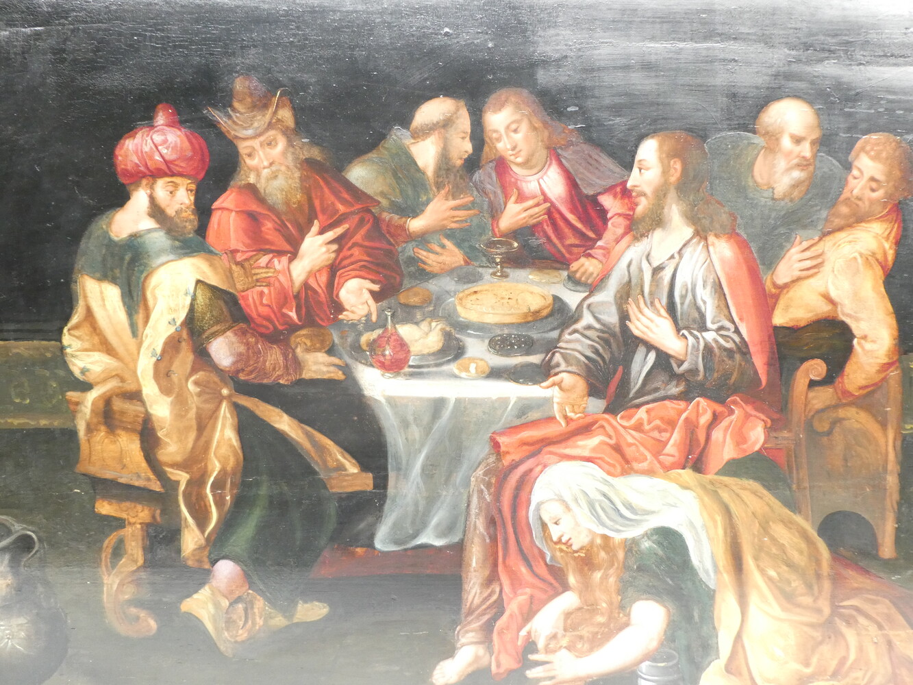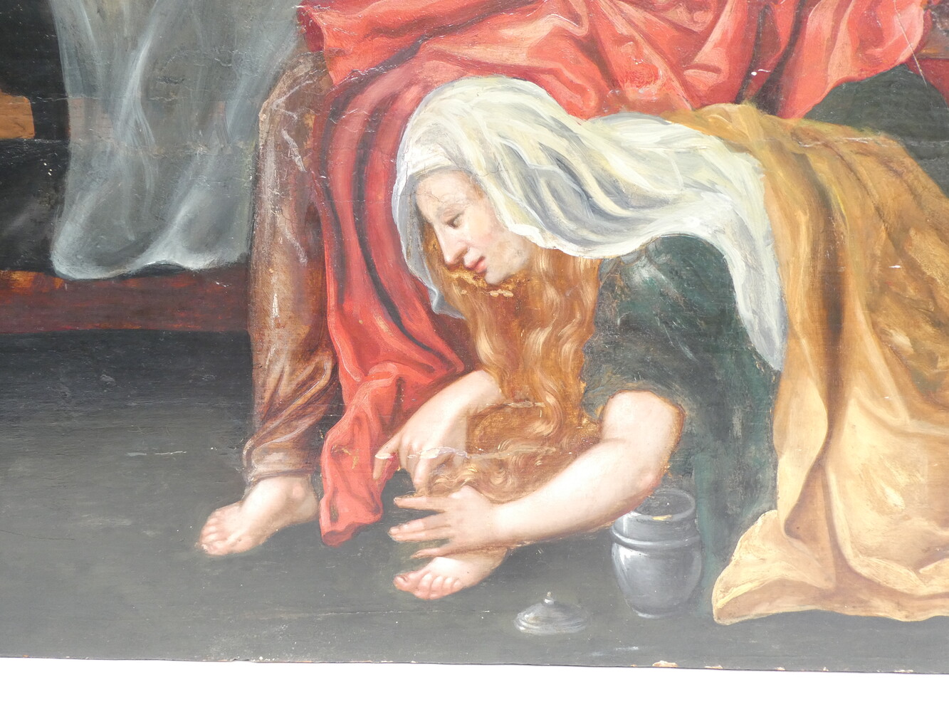"De voetwassing" groot antiek oliewerk op paneel, Vlaamse School ca 1700 . Zeer fijne gedetailleerde schildering. 106cm x 76cm, niet ingelijst.