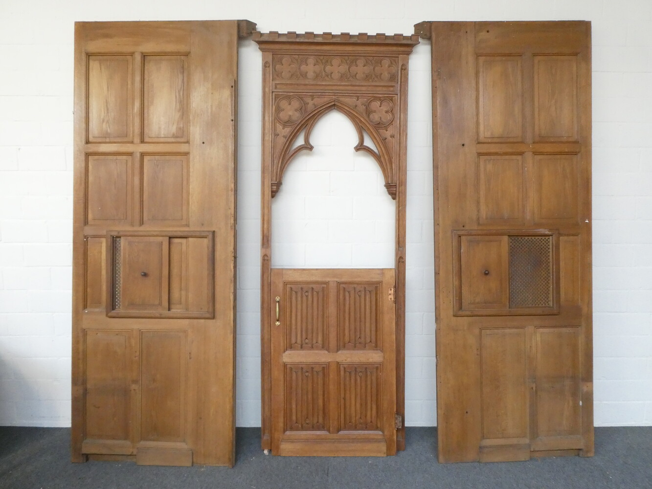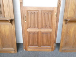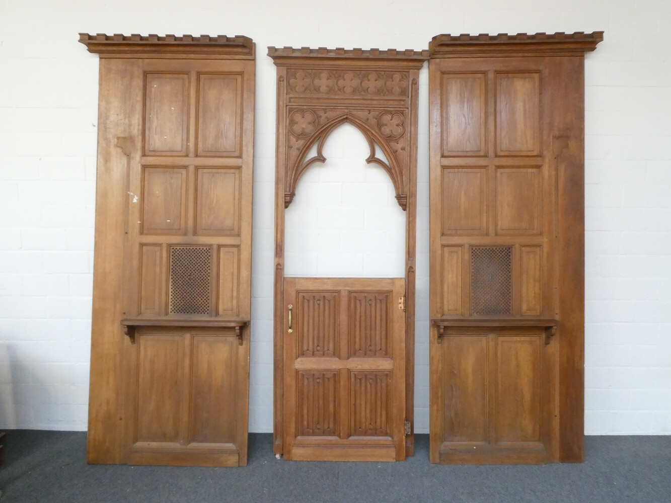 Deel van een neogotische eiken biechstoel : - twee zijpanelen van 96cm x 260cm, - een middenstuk 87cm x 249cm, - een deur 75cm x 112cm.