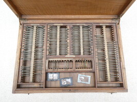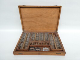 Doos met antiek optisch werkmateriaal