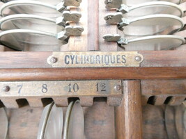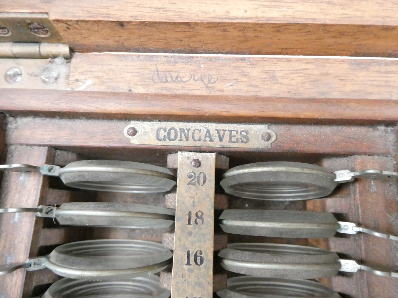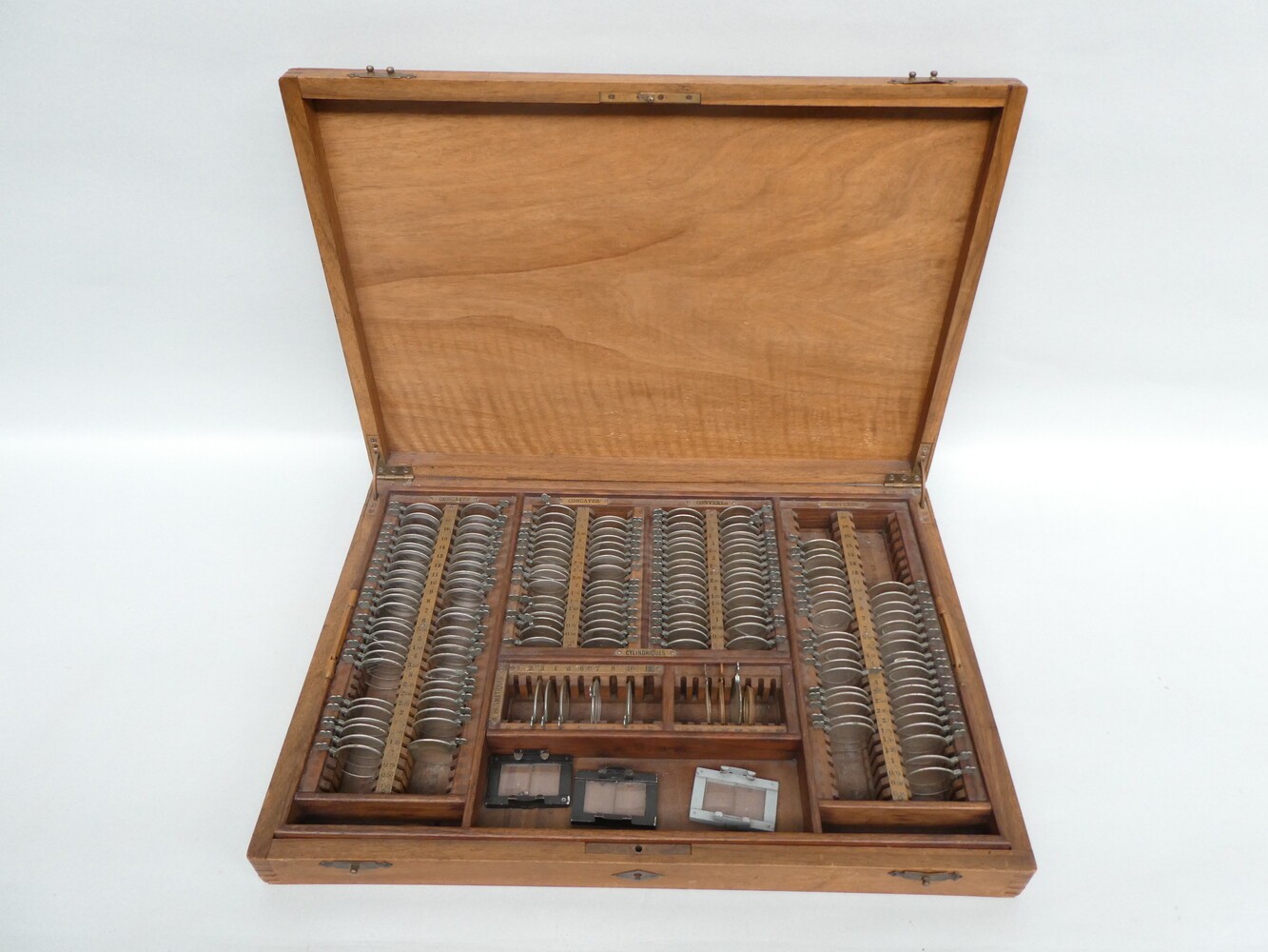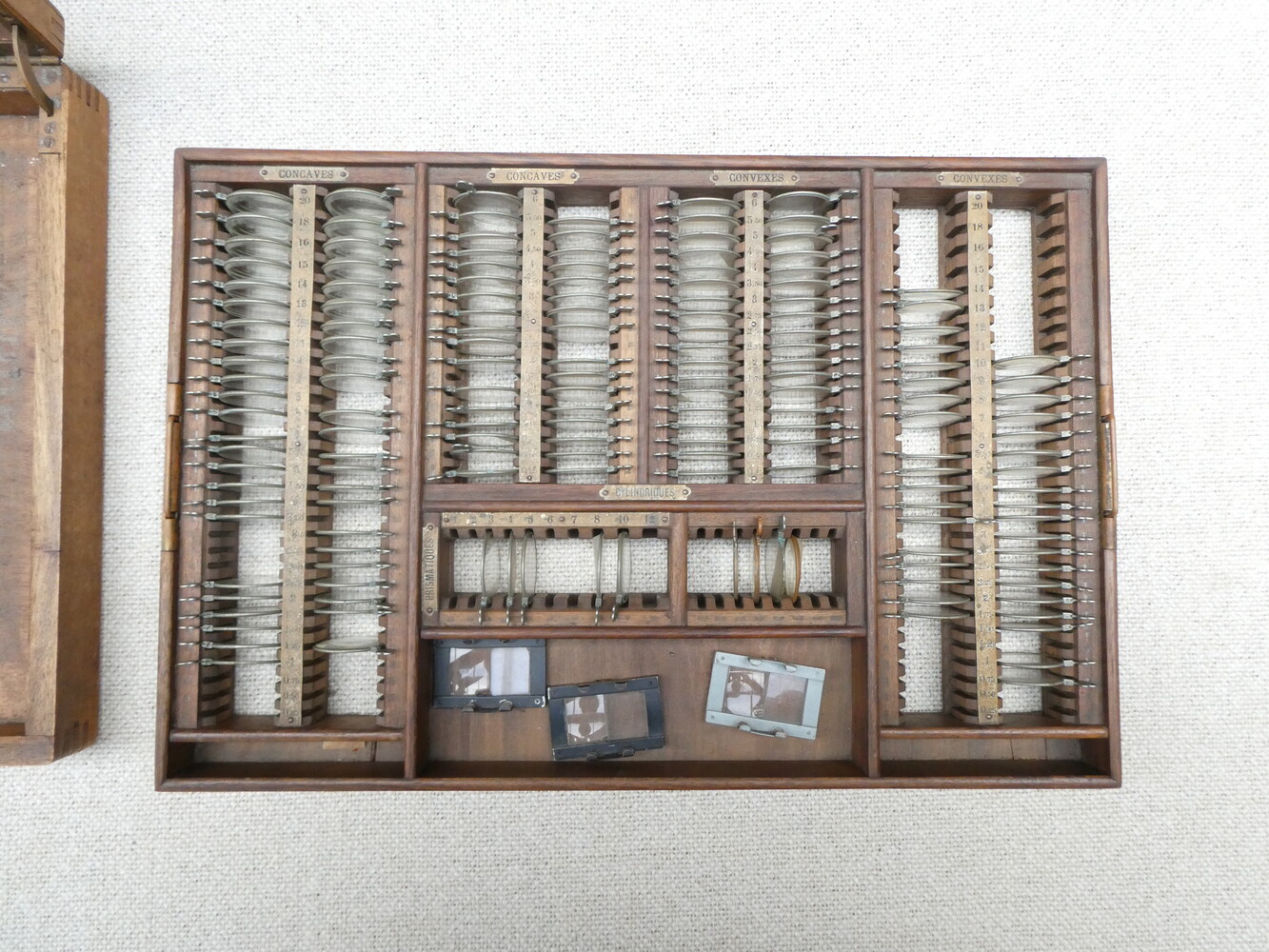 Doos met antiek optisch werkmateriaal (test brilglazen)