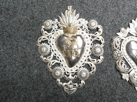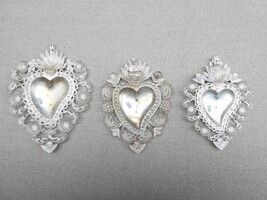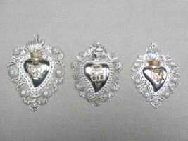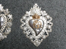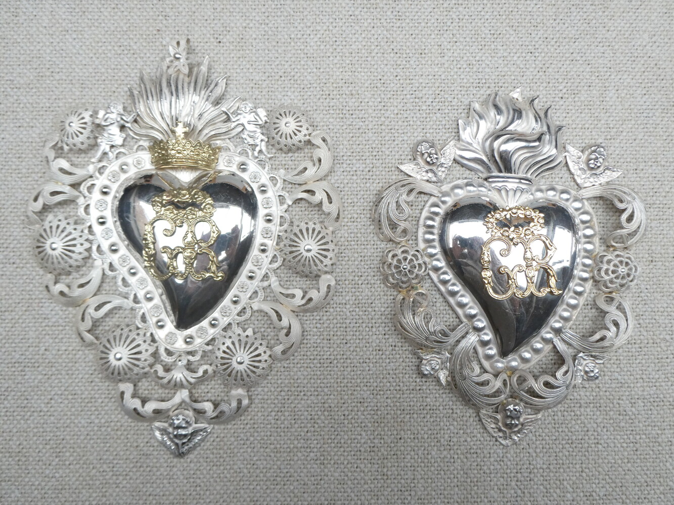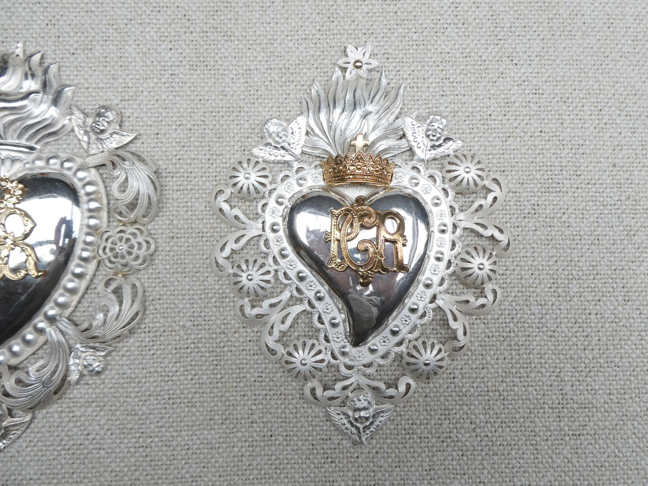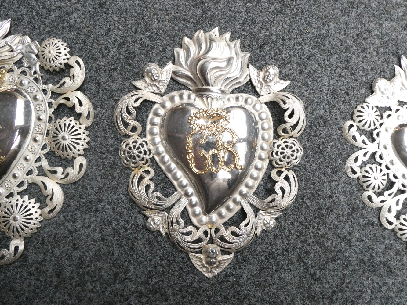 Drie grote verzilverde ex-voto harten met vergulde initialen en omrand met rozetten, bladmotieven, engelenkopjes. 20cmx25cm - 17cmx22cm en 17cmx23cm.