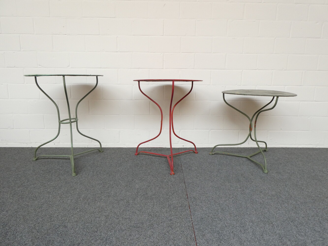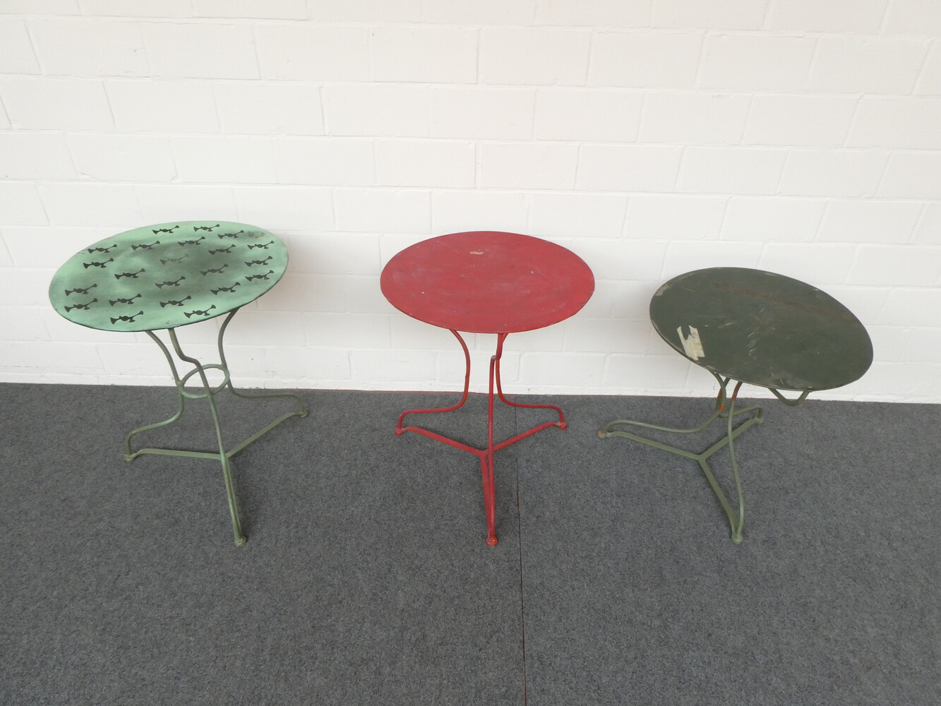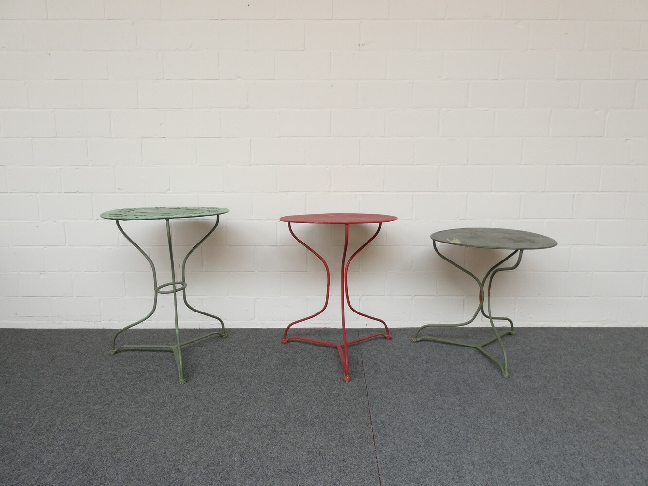 Drie ronde ijzeren tuintafeltjes.