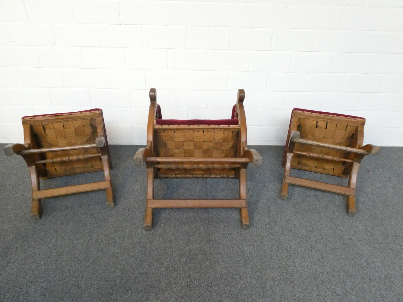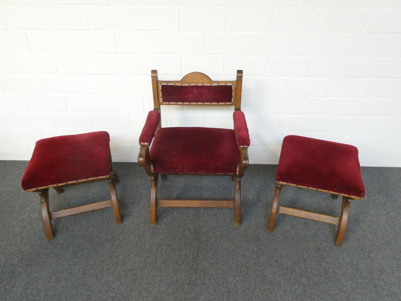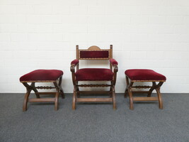 Driestel eiken stoelen met rode velours voor priester en diakens. - armstoel : 60cm x 63cm, hoogte 90cm - twee stuks : 46cmx46cm - hoogte 48cm.