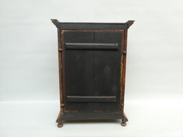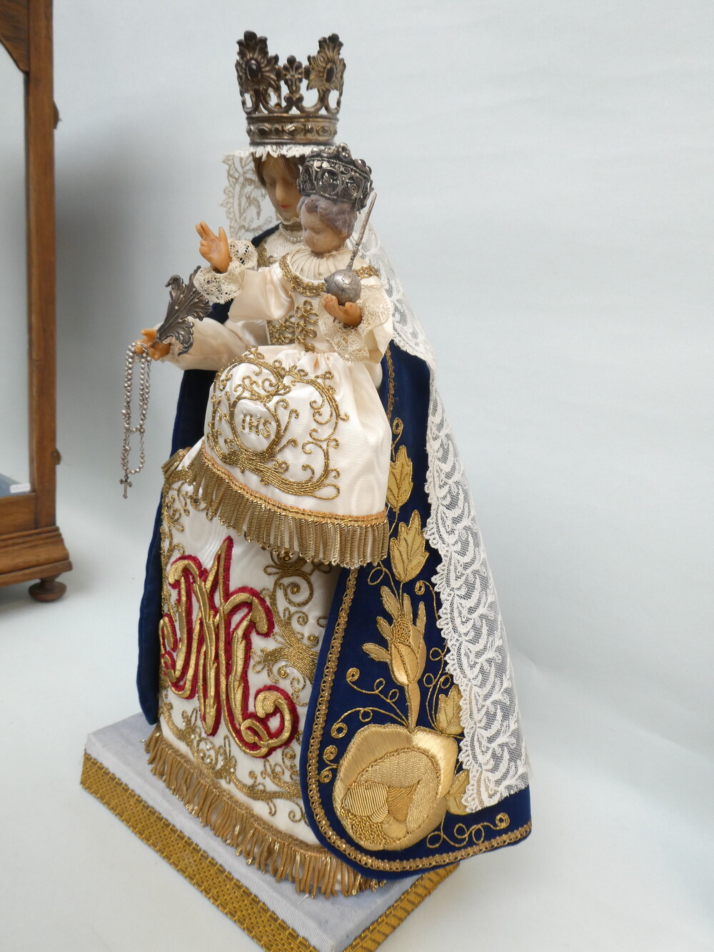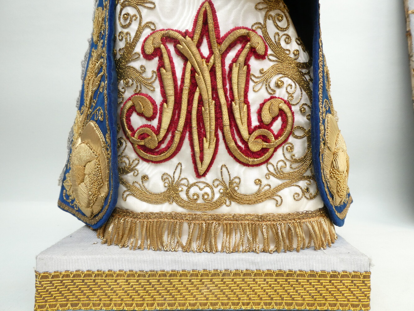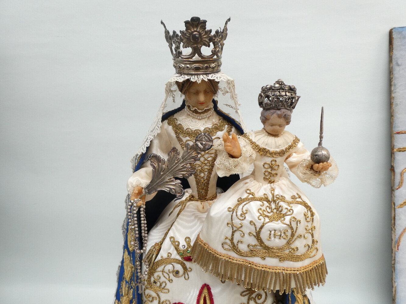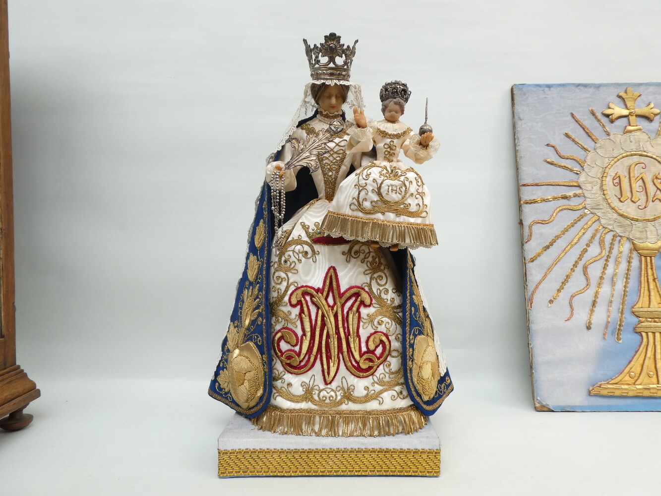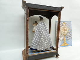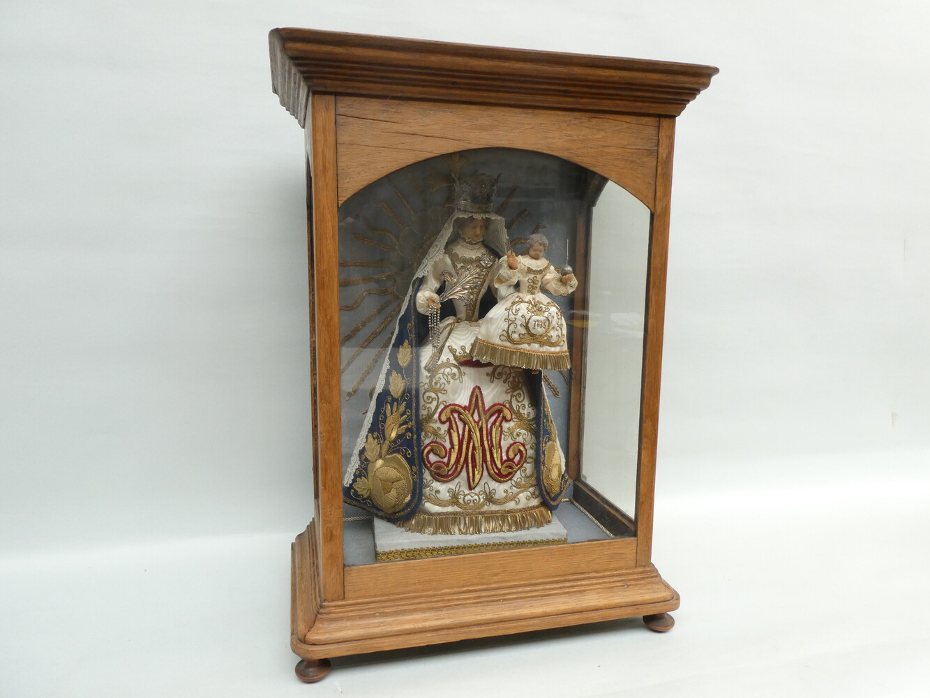 Eiken kapel 47cmx27cm, hoogte 66cm met Madonna in was met zilveren kroontjes en dik goudbrokaat borduurwerk op kleed en mantel.