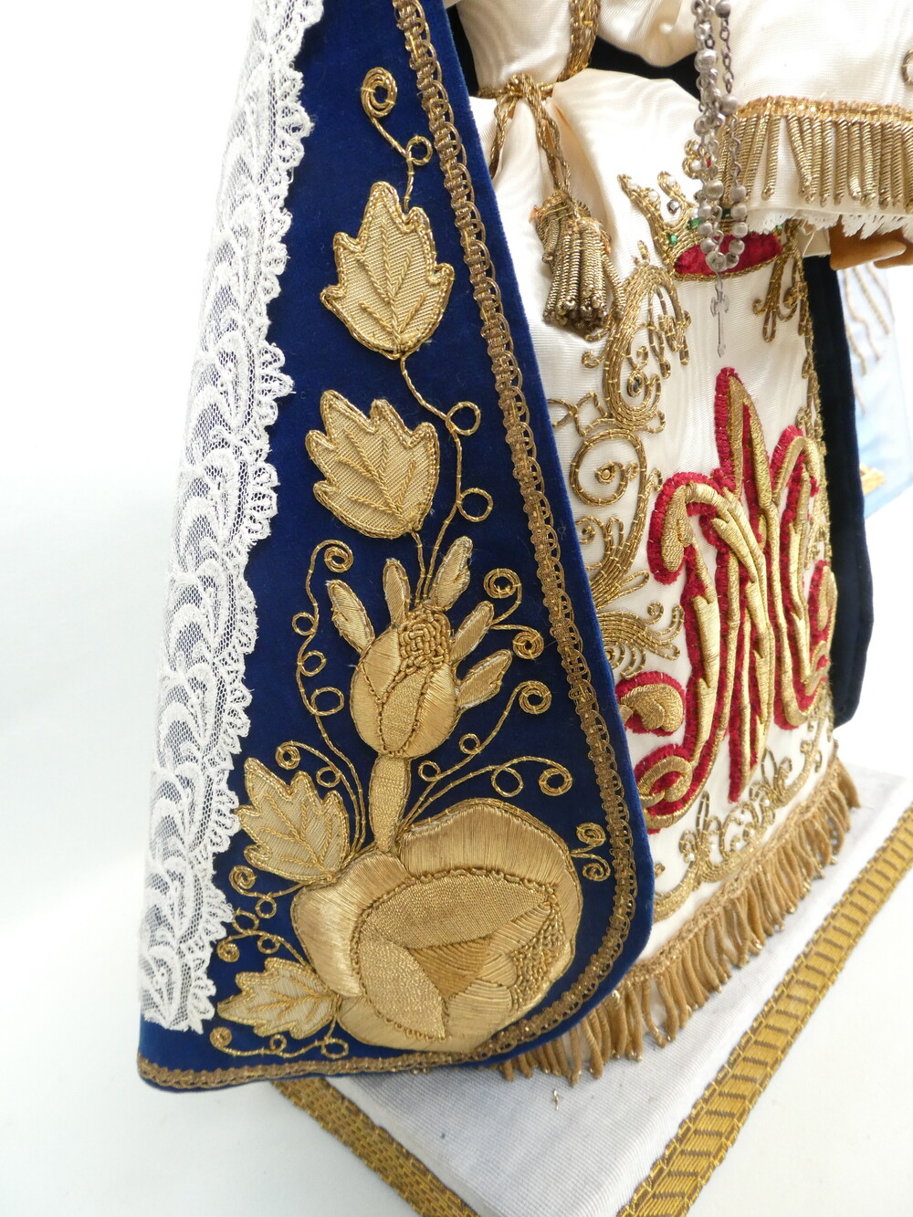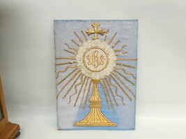Op de achtergrond een monstrans in zilver-en goudbrokaat borduurwerk.