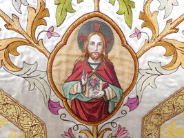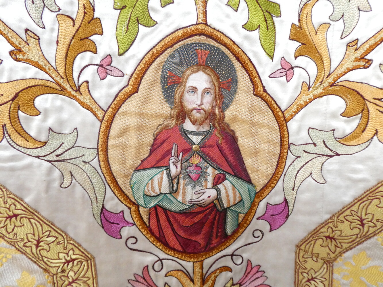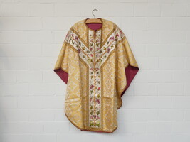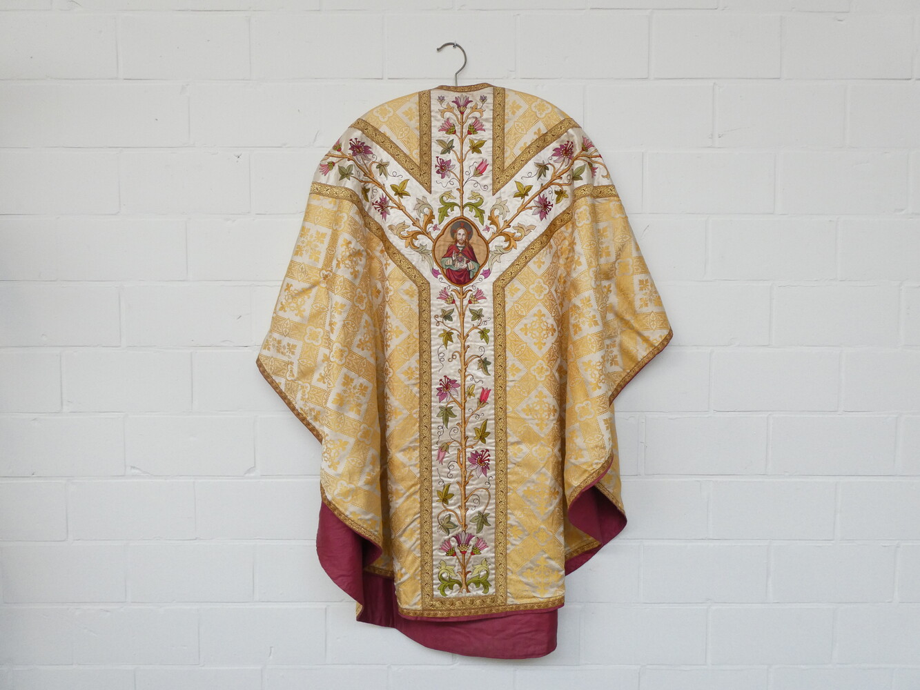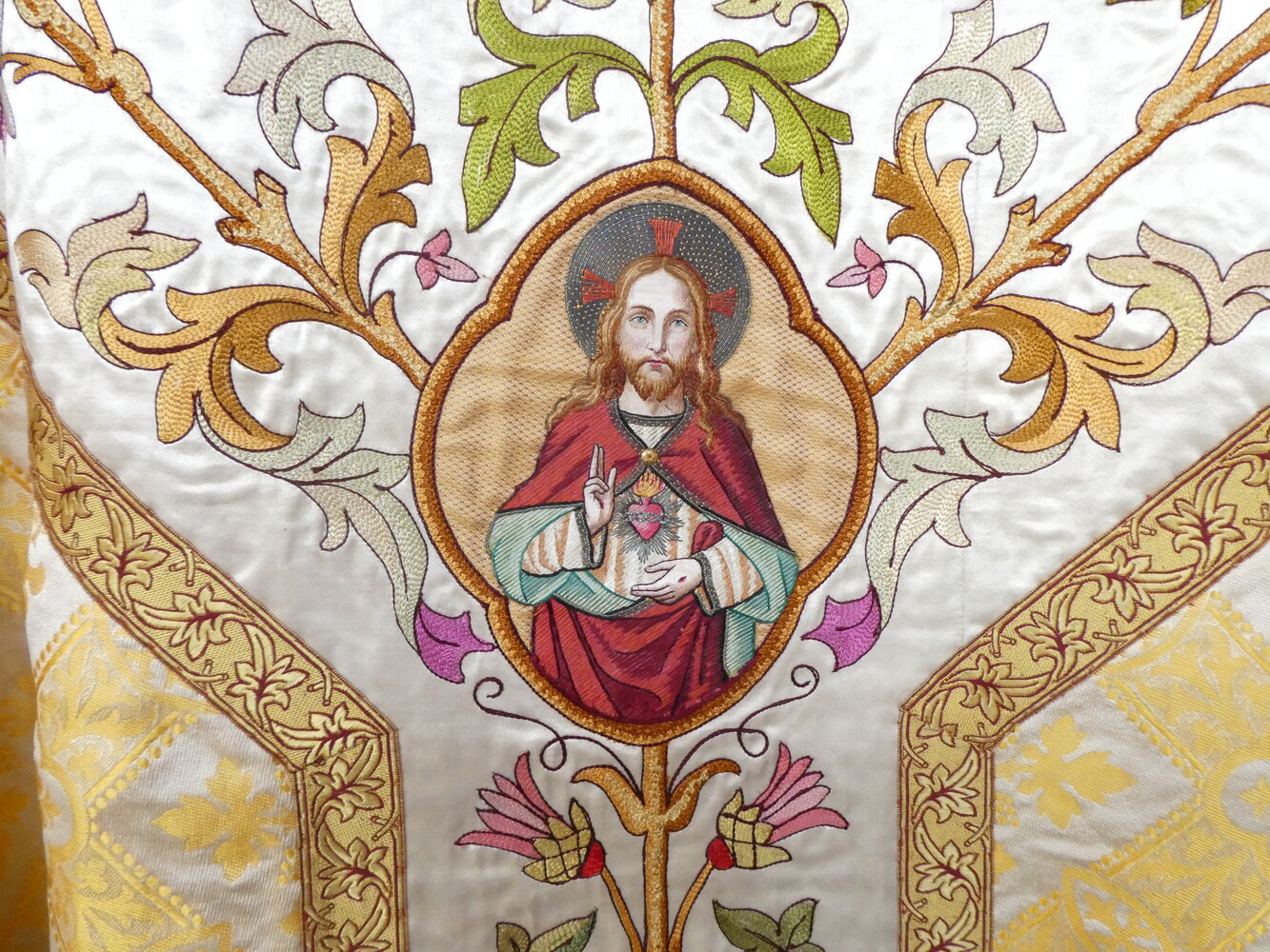 Gele kazuifel met mooi geborduurd Heilig Hart.
