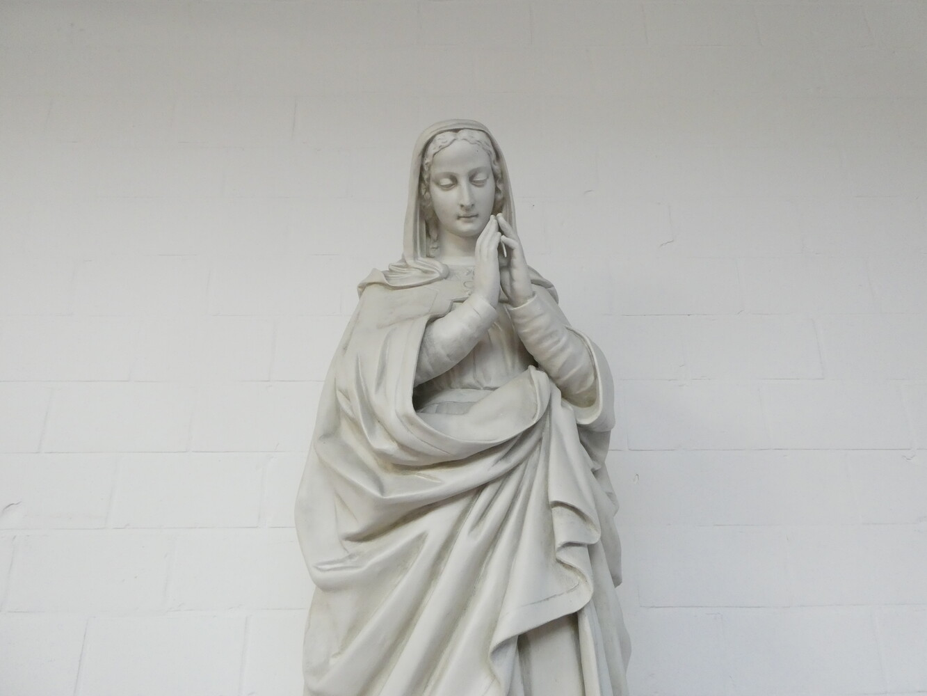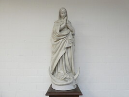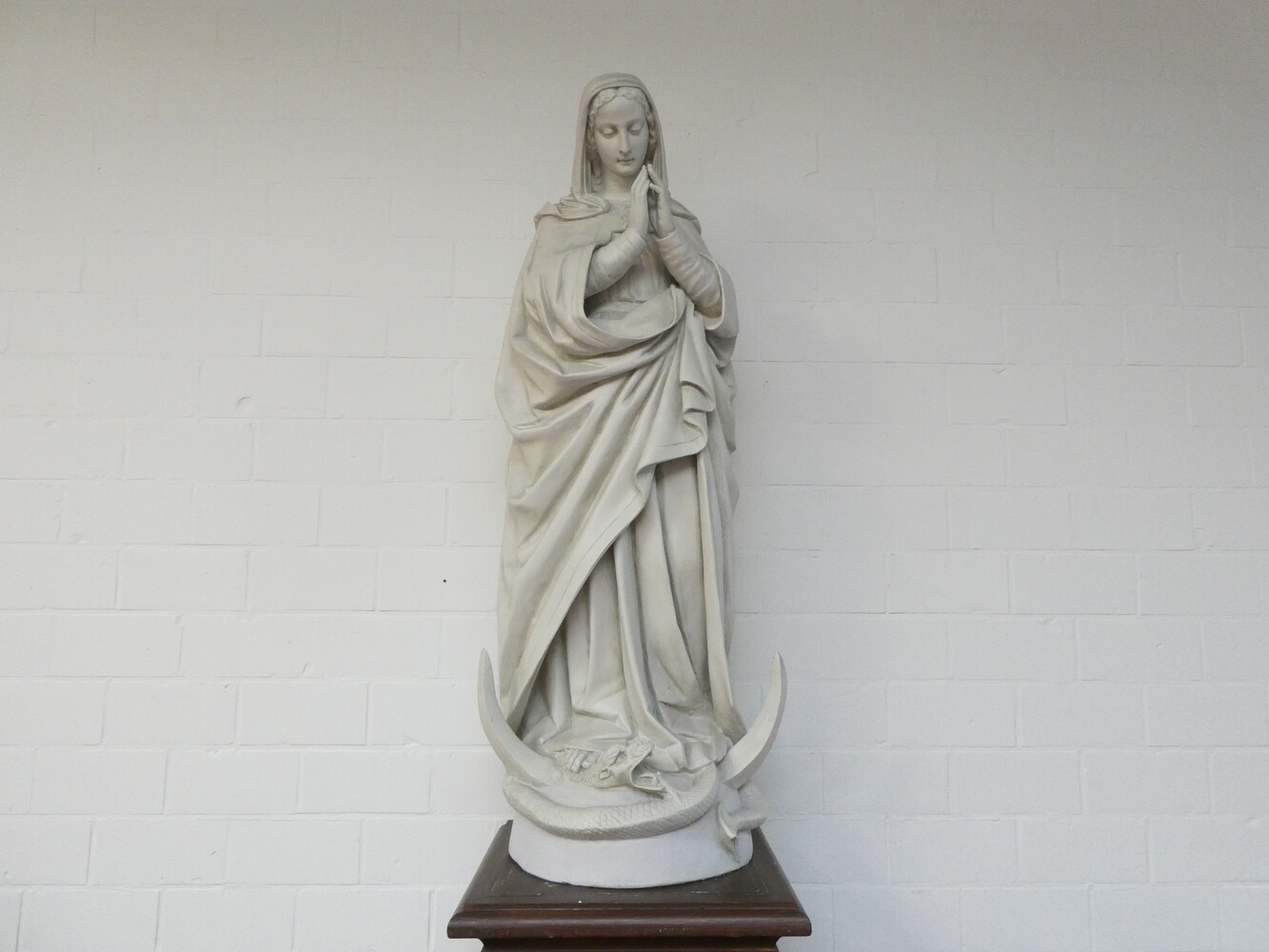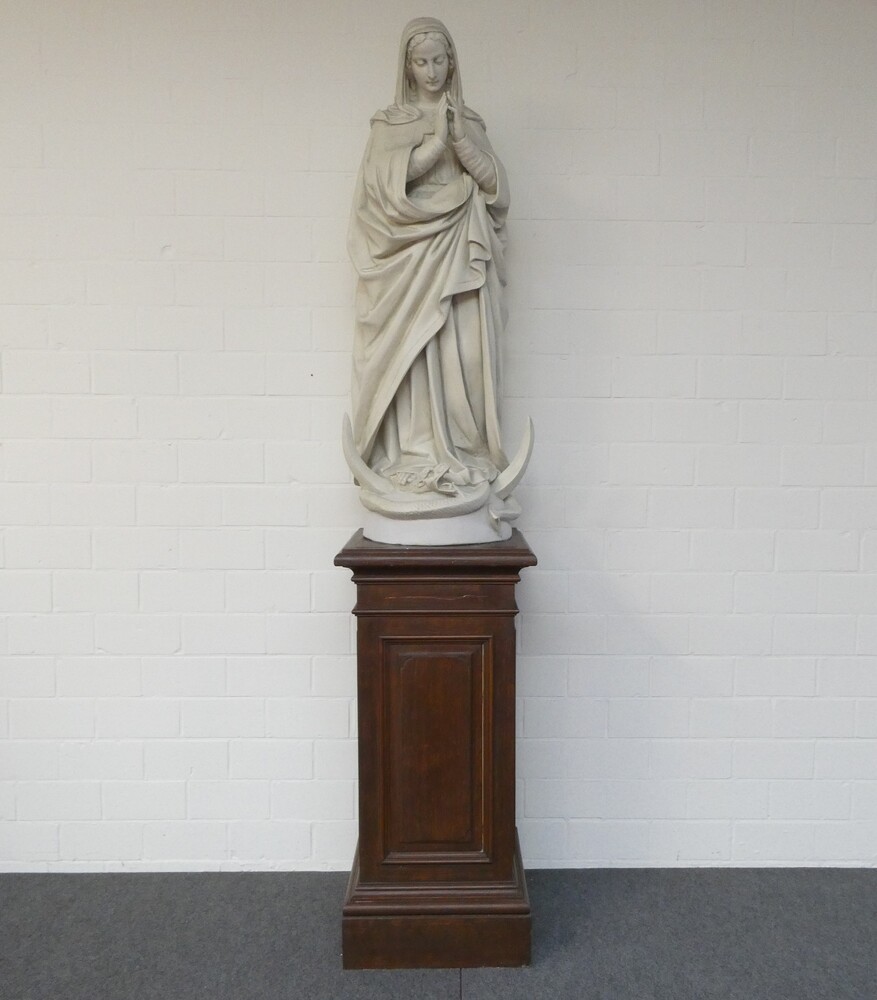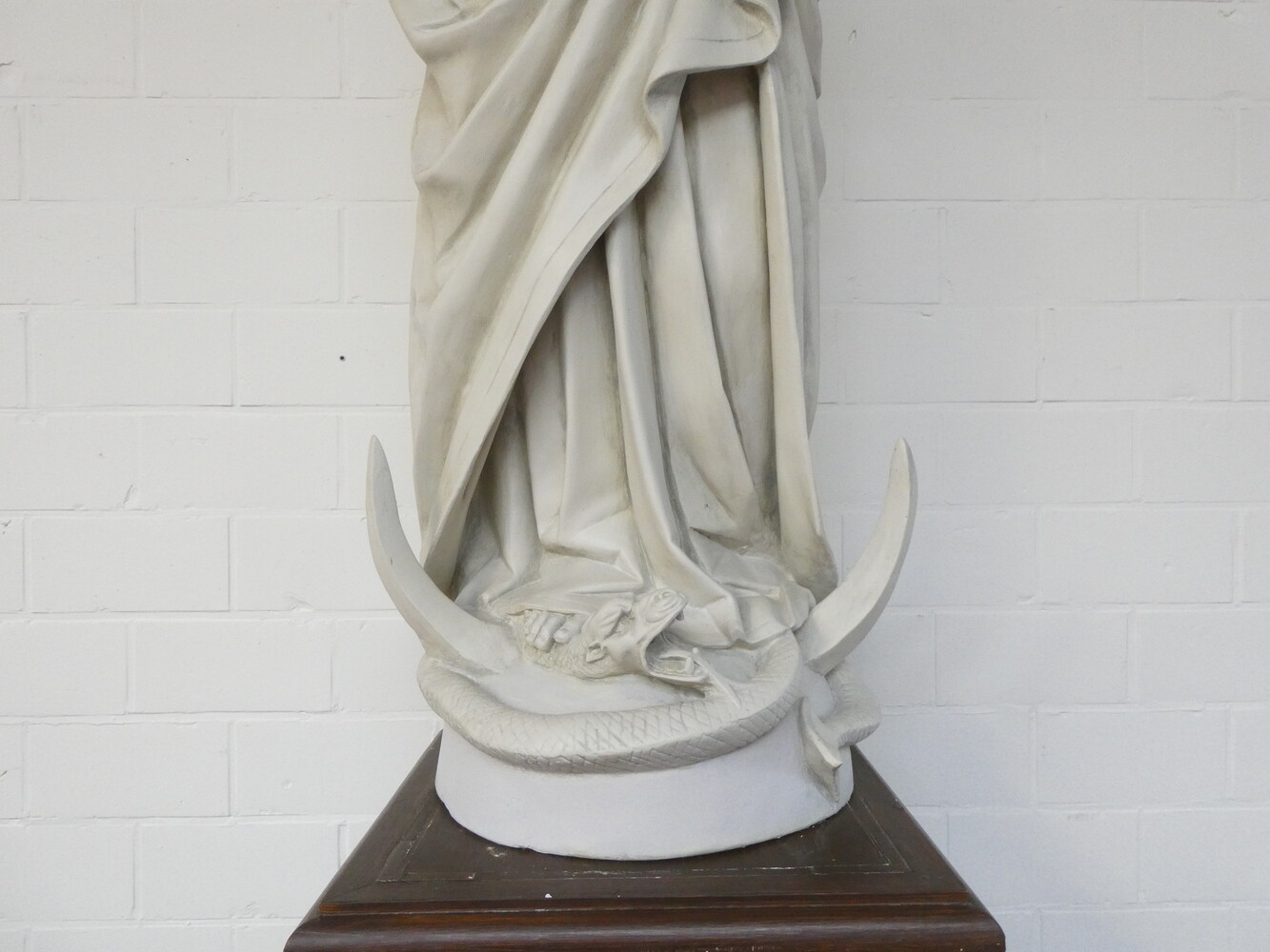 GROOT gipsen Mariabeeld hoogte 155cm op een houten sokkel 58cmx58cm, hoogte 125cm.