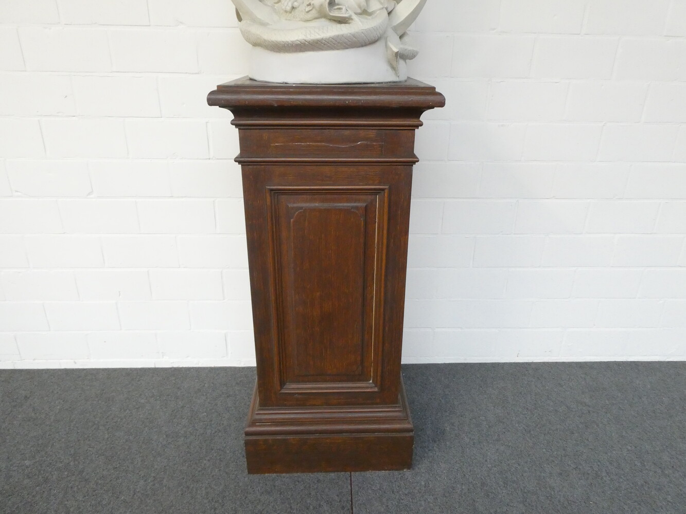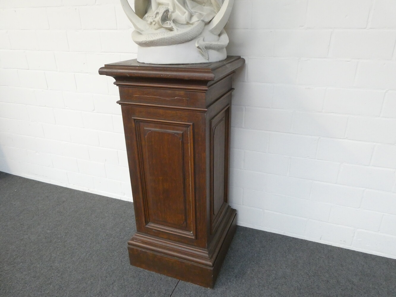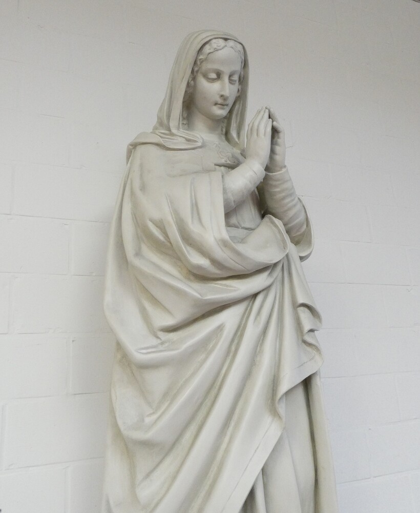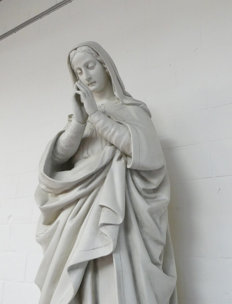GROOT gipsen Mariabeeld hoogte 155cm op een houten sokkel 58cmx58cm, hoogte 125cm.