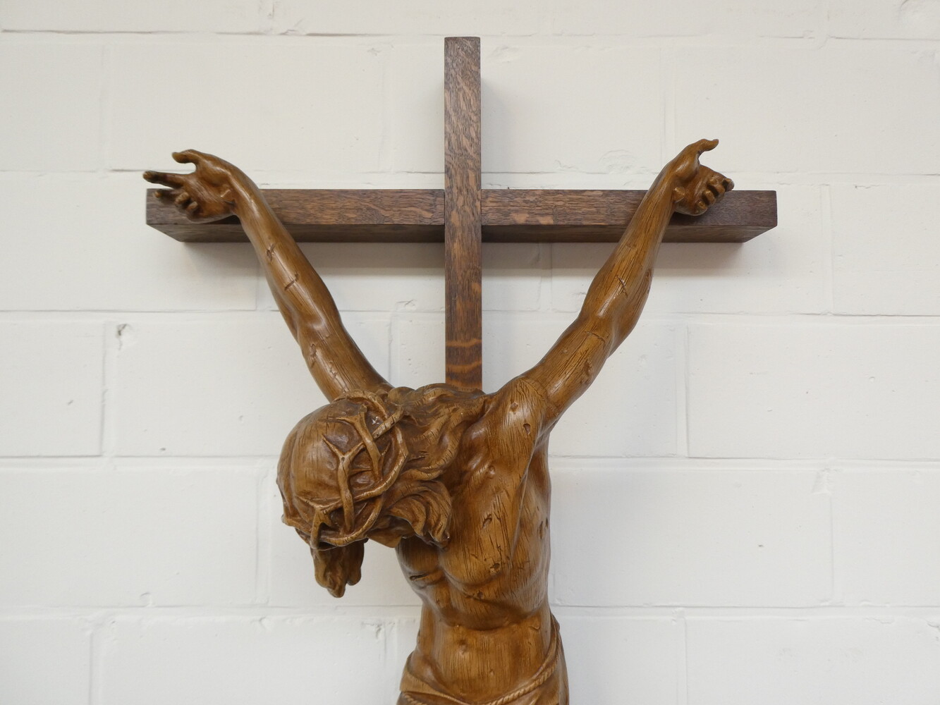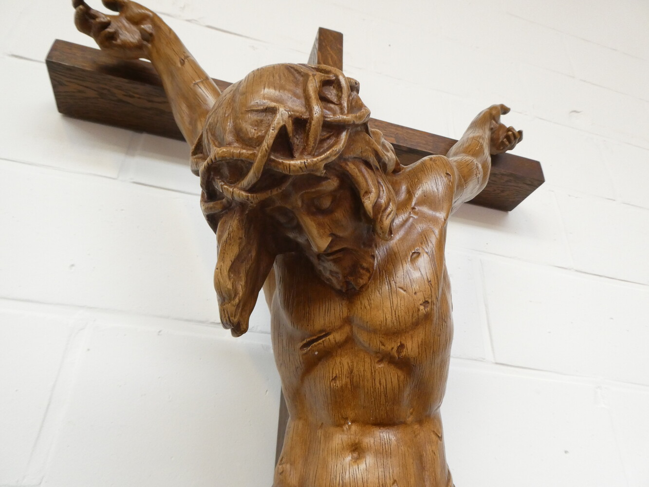 GROOT houten kruis 120cmx60cm met grote houtkleurige gipsen Corpus 87cmx51cm.