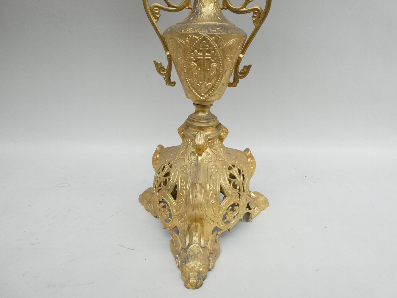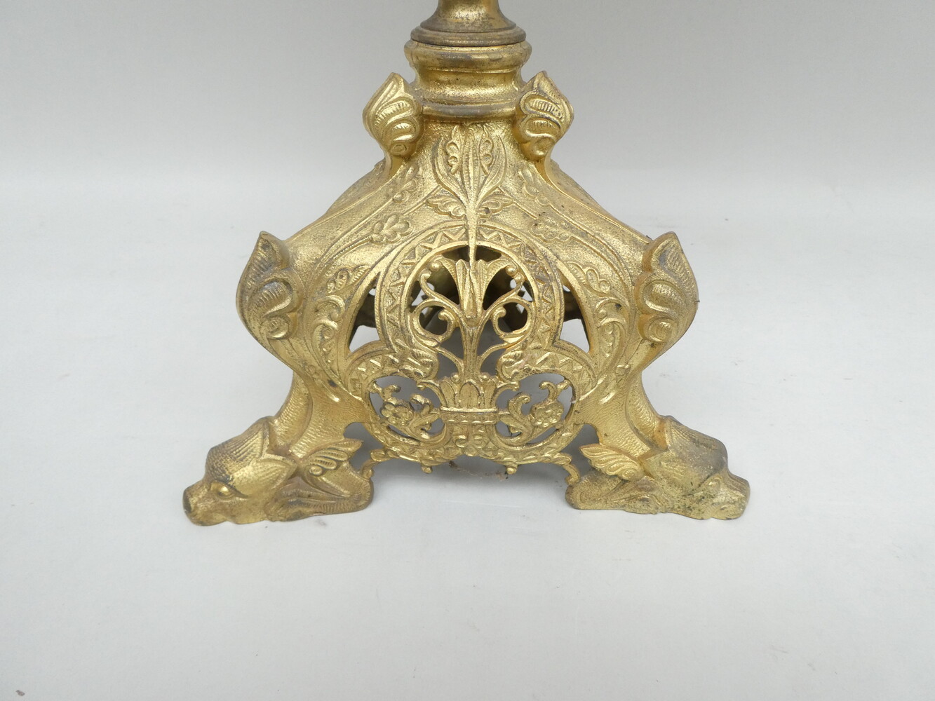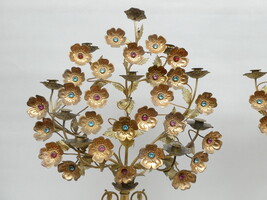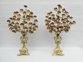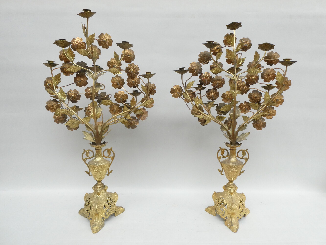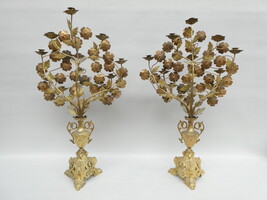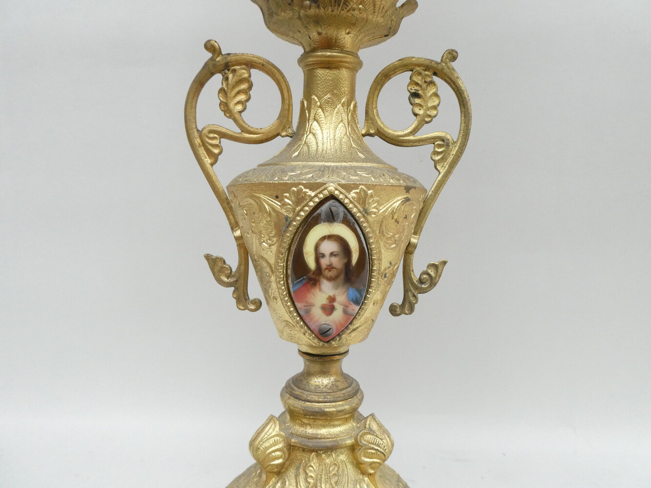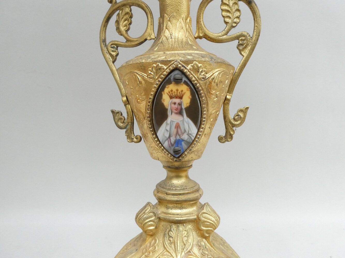 GROOT koppel koperen altaarkandelaars met bloemen en émail plaquettes "Jezus" en "gekroonde Madonna". TOTALE HOOGTE 90CM.
