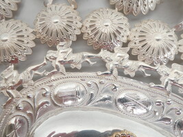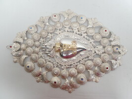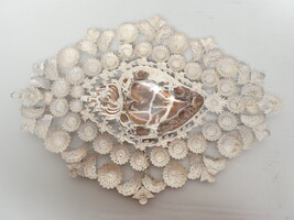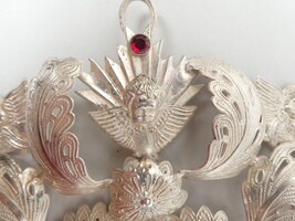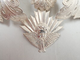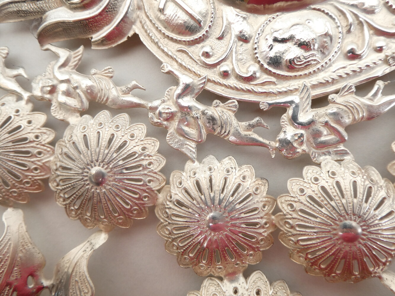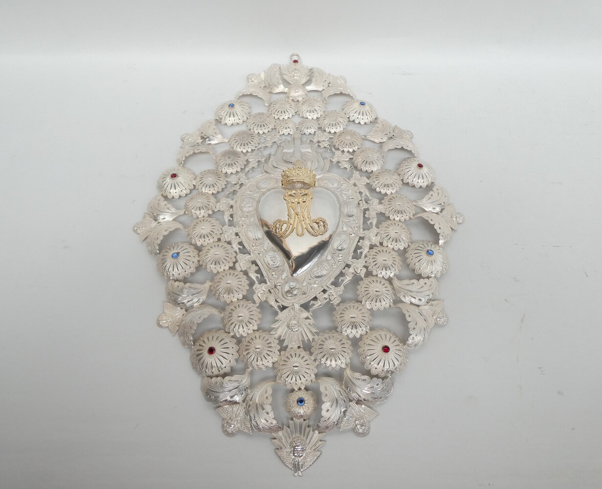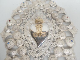 GROOT verzilverd ex-voto hart, omringd door engeltjes, lijdenssymbolen, versierde rozetten waarvan enkele met gekleurde steentjes, bladmotieven en engelenkopjes.