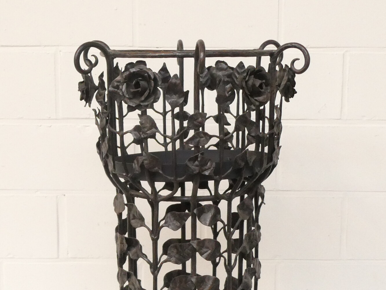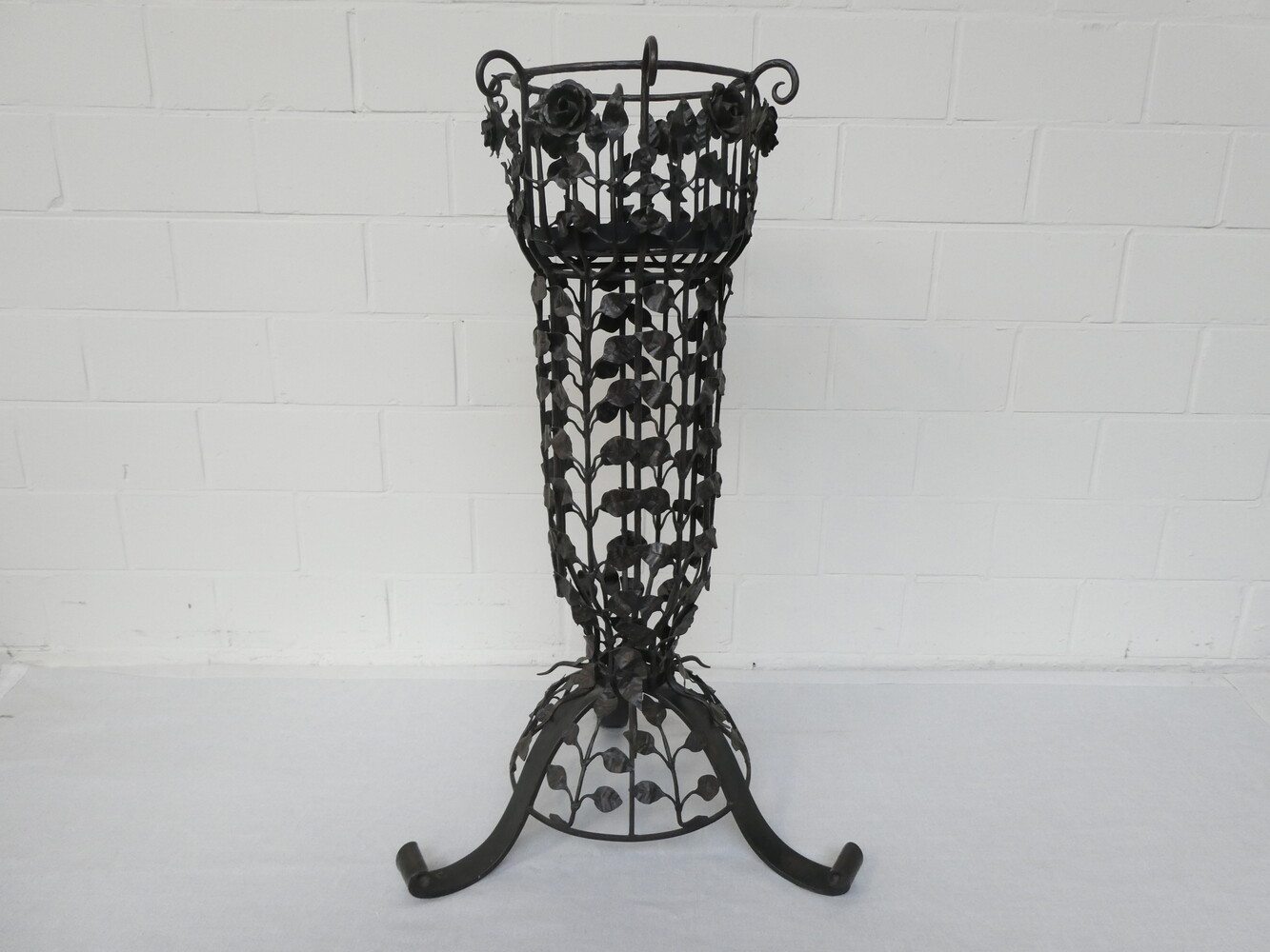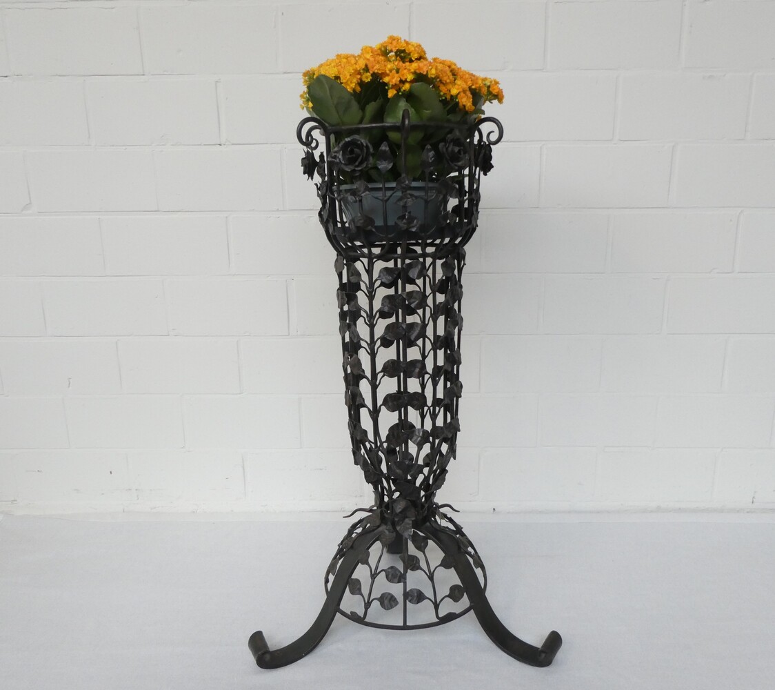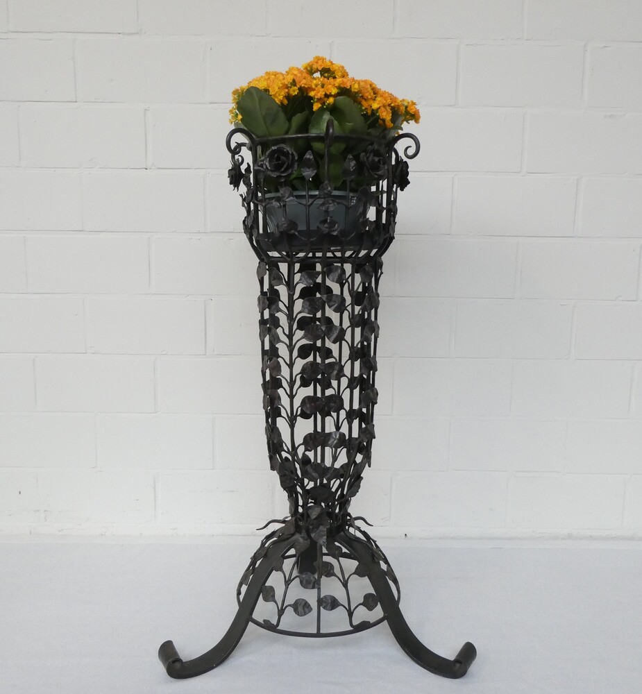 Grote smeedijzeren plantenstaander versierd met bloemen en bladeren. Diameter voetstuk 56cm - diameter bovenaan 38cm - hoogte 96cm.