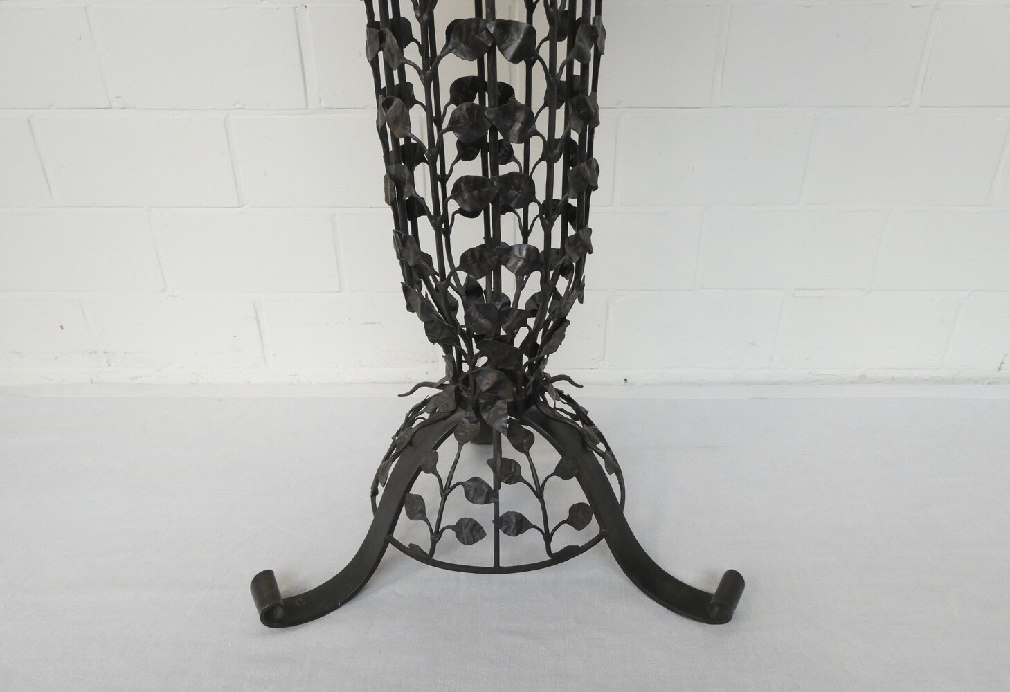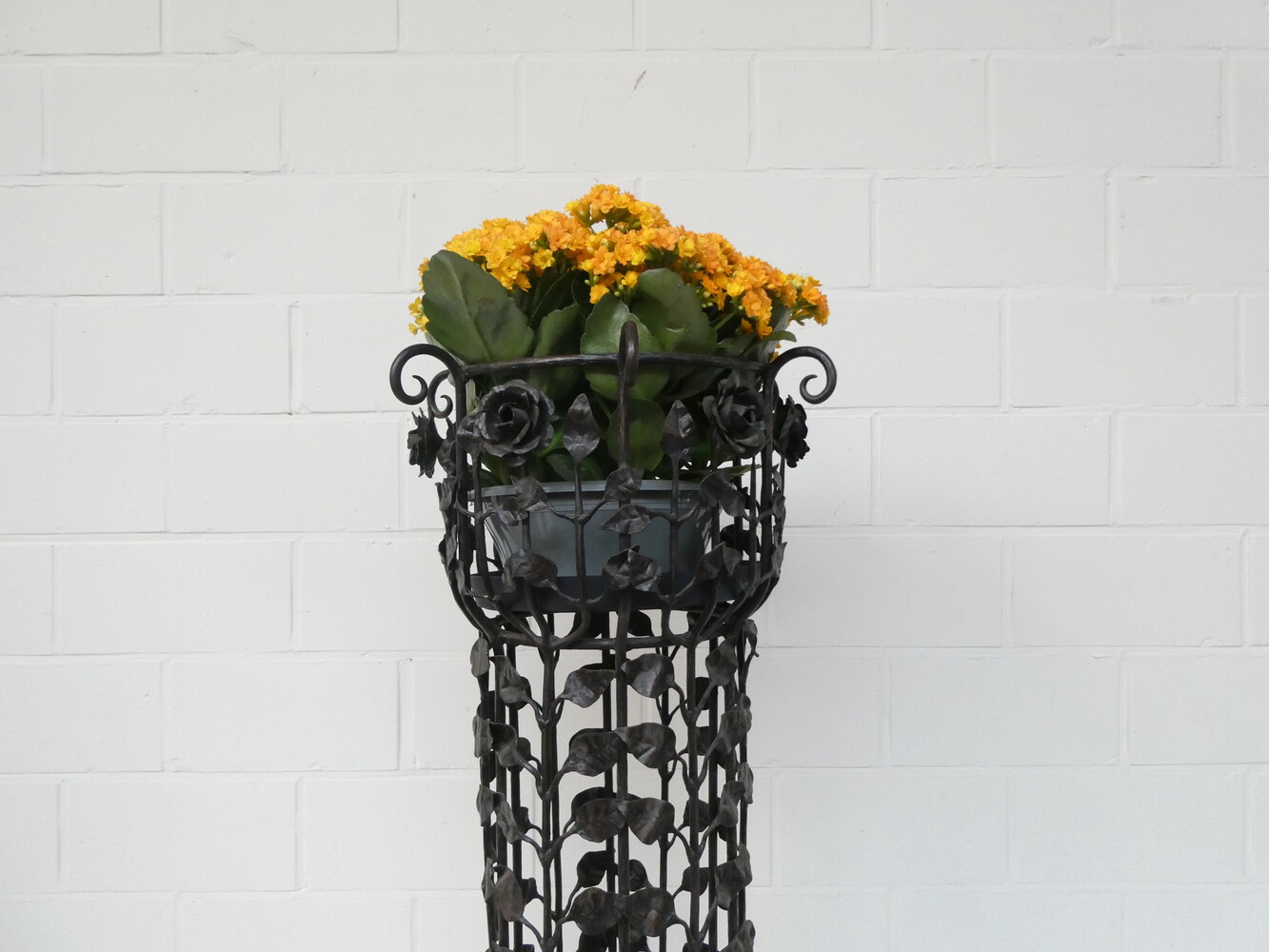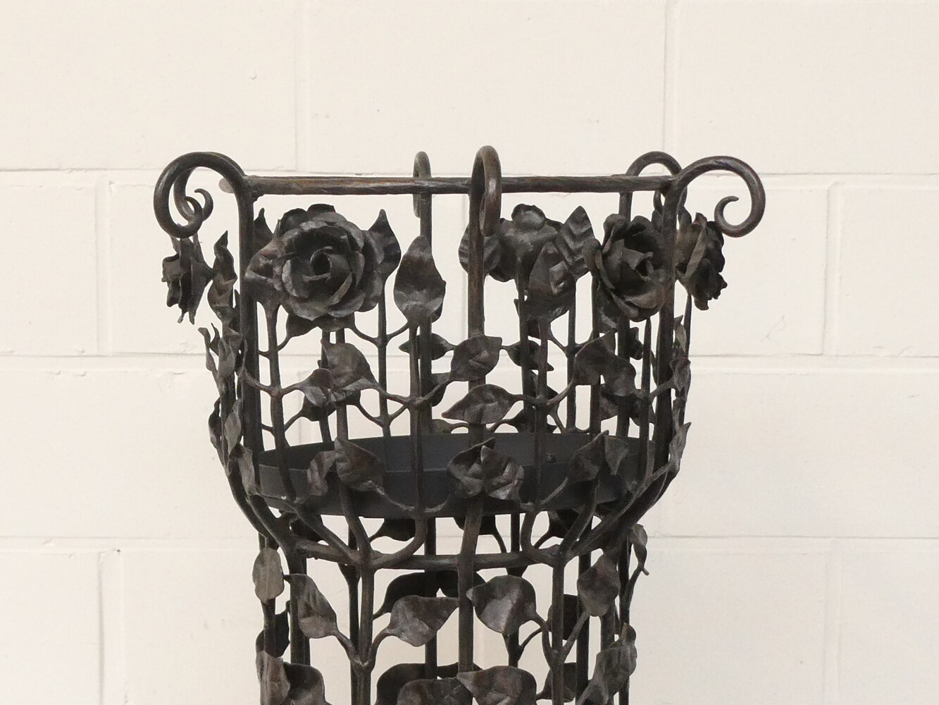 Grote smeedijzeren plantenstaander versierd met bloemen en bladeren. Diameter voetstuk 56cm - diameter bovenaan 38cm - hoogte 96cm.