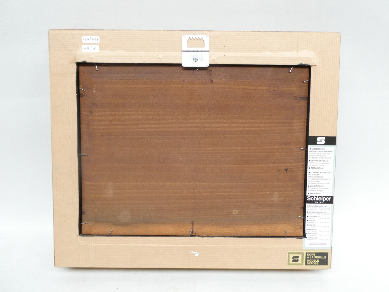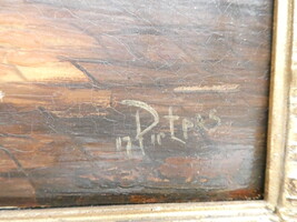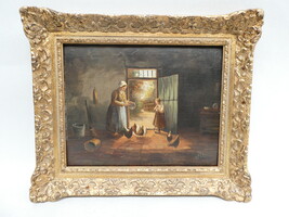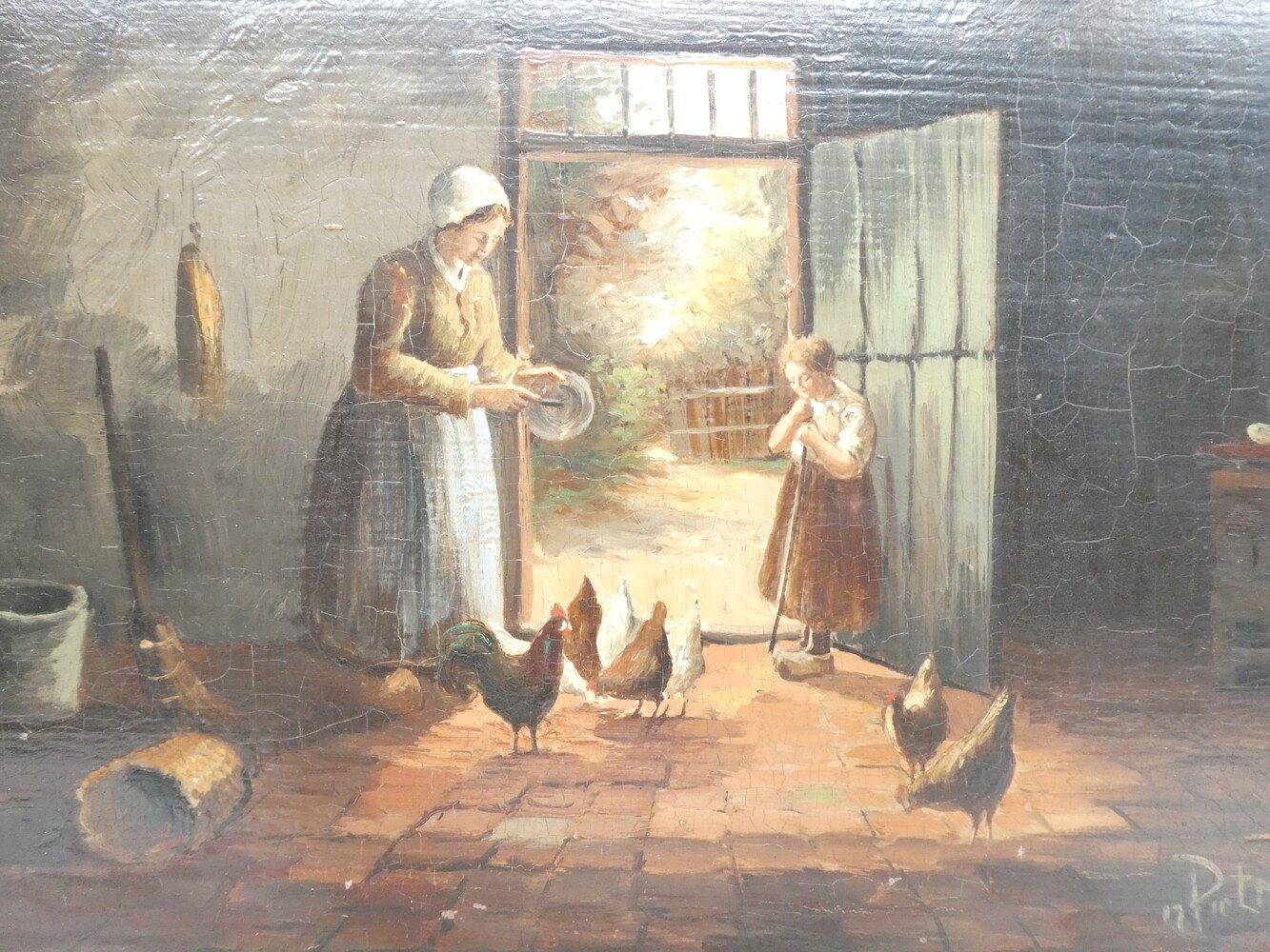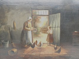 "Het voederen van de kippen" 19de eeuws genretafereel, olie op paneel, draagt signatuur. 26cmx21cm - met kader 36cmx31cm.