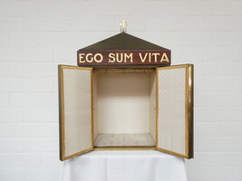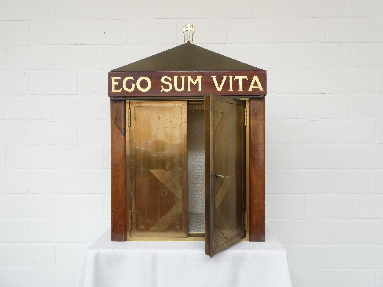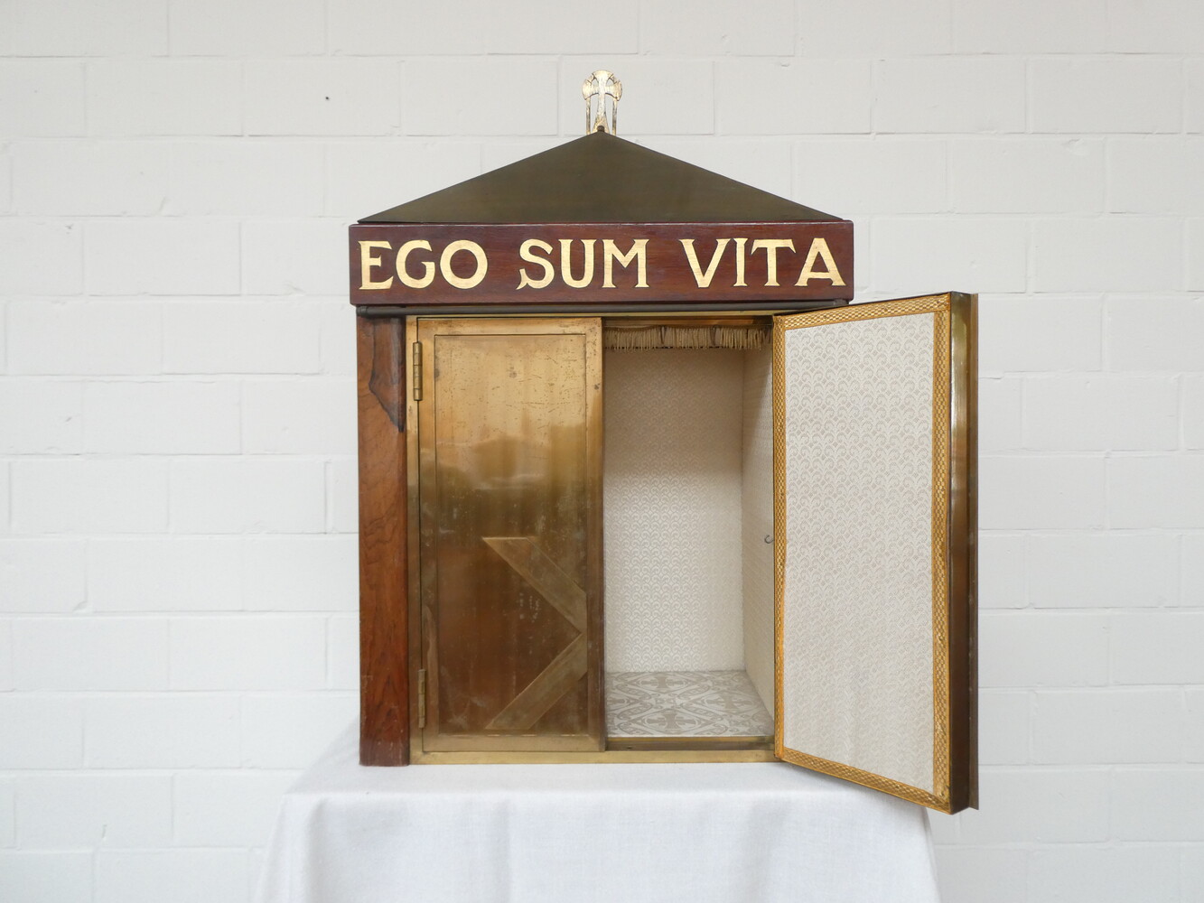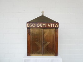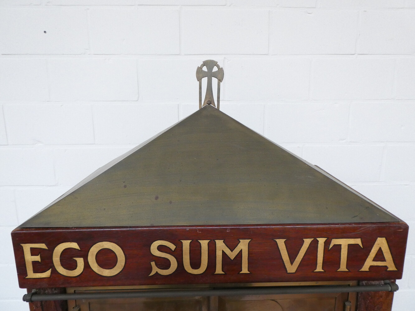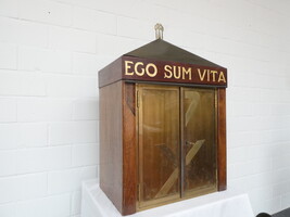Houten tabernakel met deuren en bovenstuk in koper. 58cmx37cm - hoogte 64cm. Totale hoogte inclusief bovenstuk 90cm.