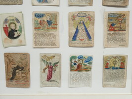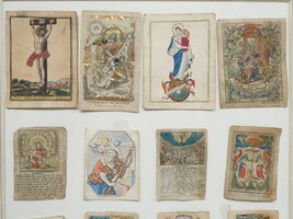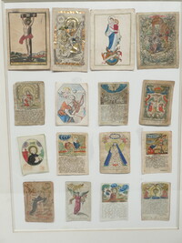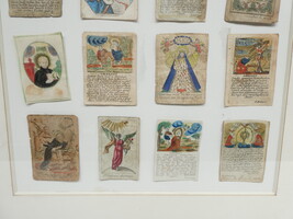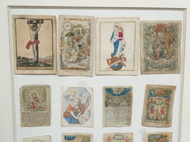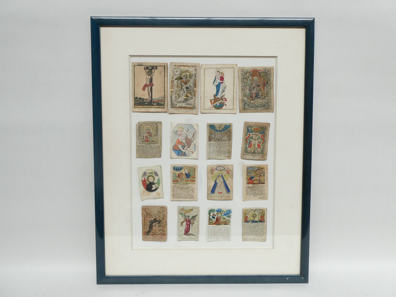 Kader 58cmx71cm met zestien antieke heiligenprentjes.
