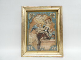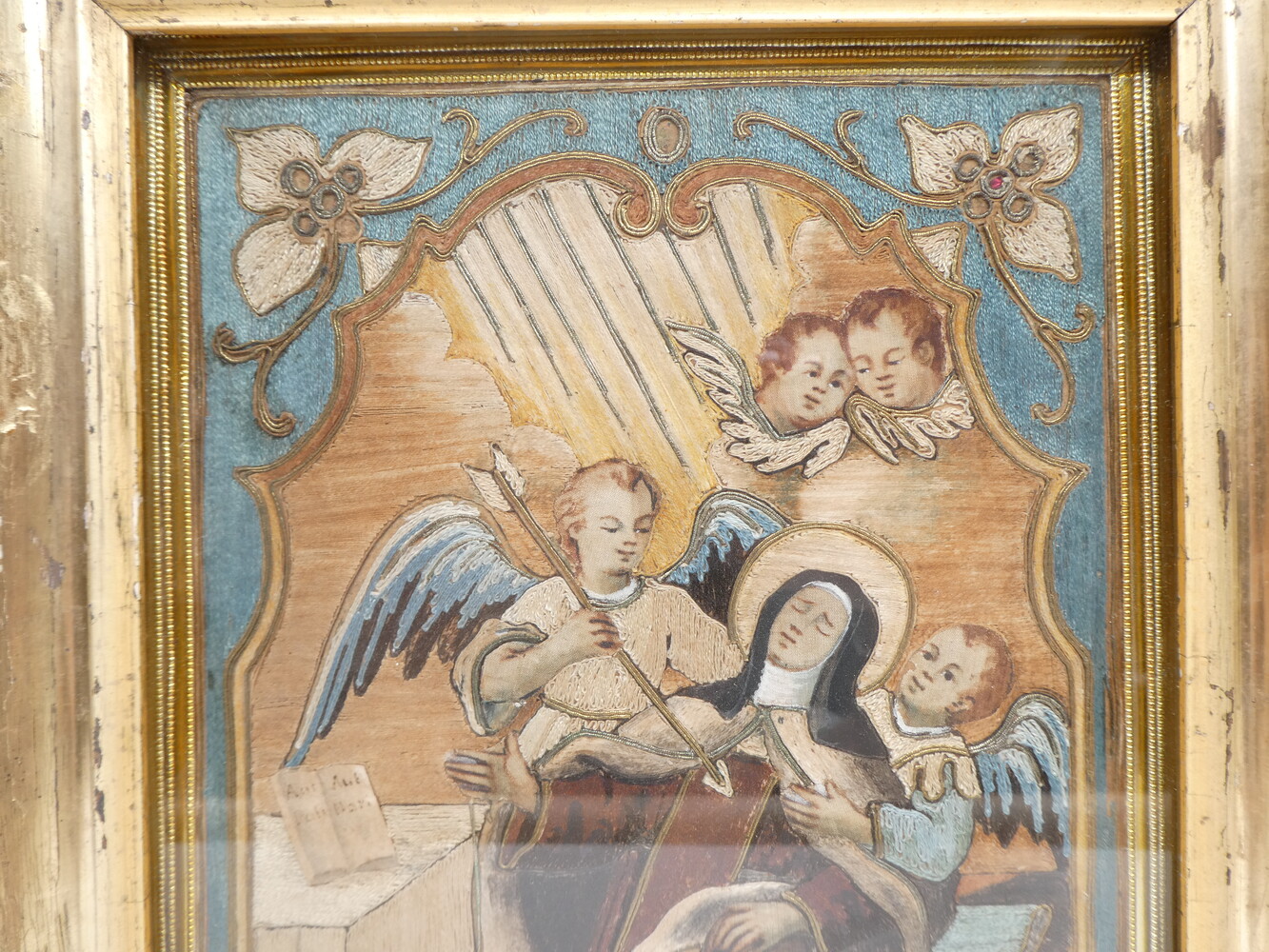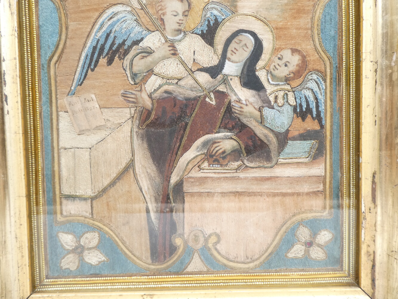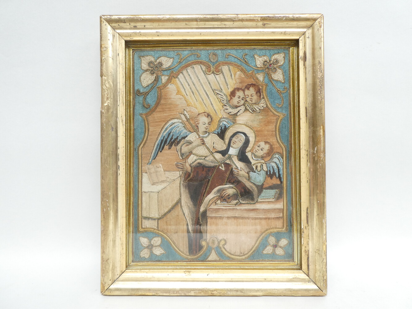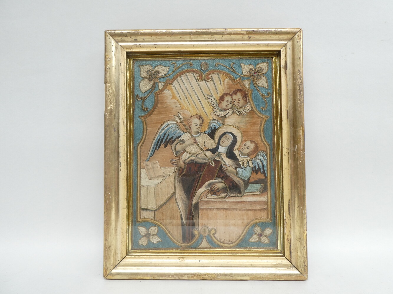 Kader 24cmx30cm met antiek borduurwerk " heilige Theresia van Avilla omringd door engeltjes". Een prachtig stukje antieke volksdevotie.