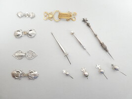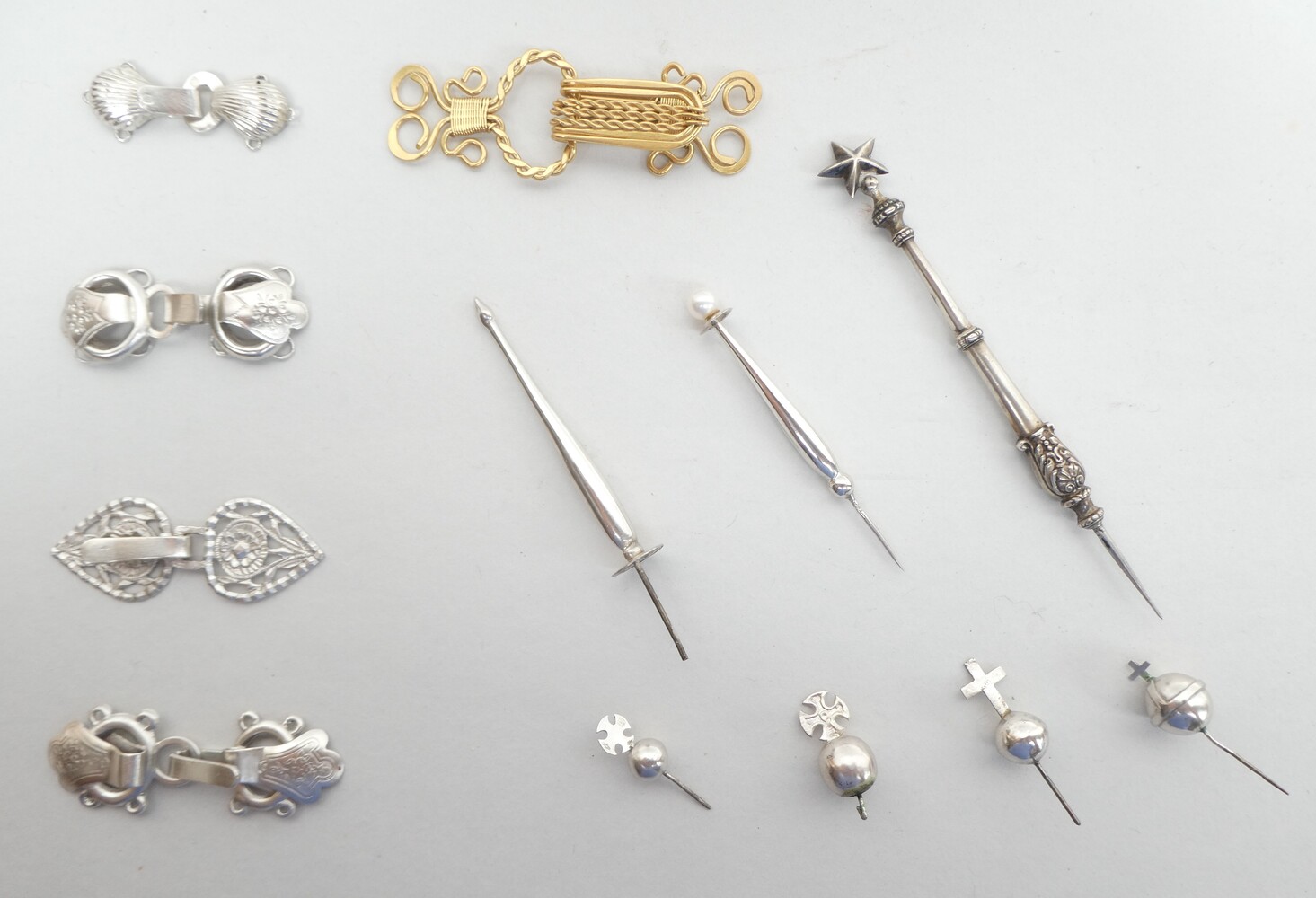 Kleine gespen ( zilver en verguld ), drie zilveren sceptertjes en vier wereldbolletjes in zilver, van een Staakmadonna.