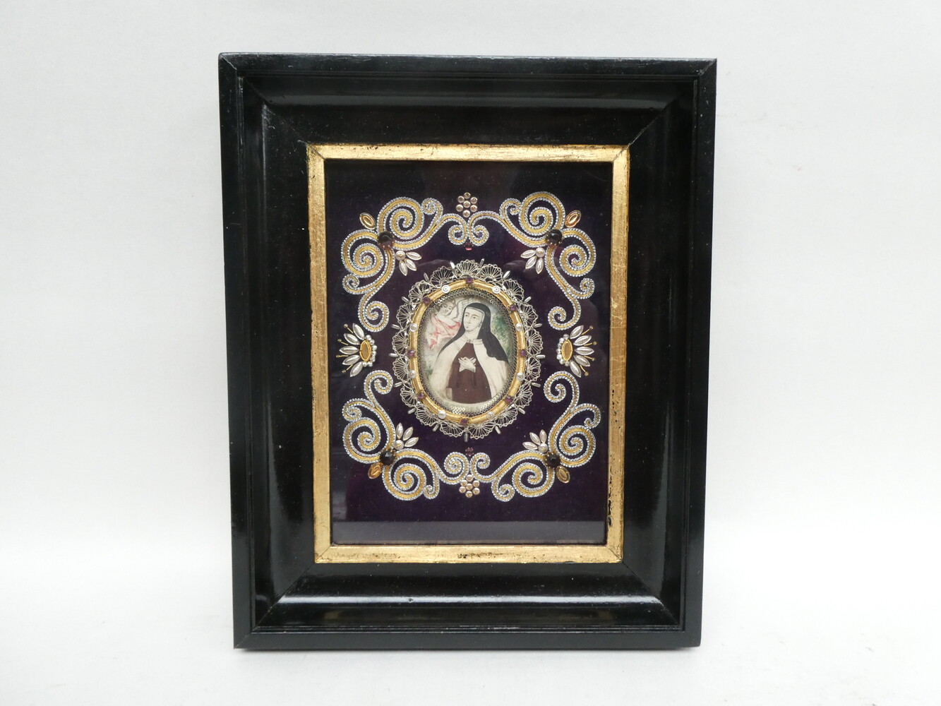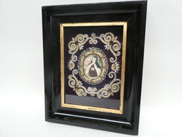 Prachtige kloosterwerkkader 26cmx32cm met een miniatuurschildering "Theresia van Avilla".